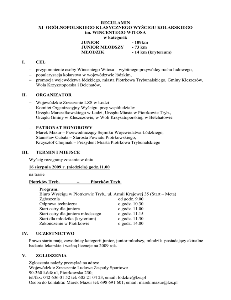 REGULAMIN XI OGÓLNOPOLSKIEGO KLASYCZNEGO WYŚCIGU KOLARSKIEGO im. WINCENTEGO WITOSA w kategorii: JUNIOR - 109km JUNIOR MŁODSZY - 73 km MŁODZIK - 14 km (kryterium) I. CEL − przypomnienie osoby Wincentego Witosa – wybitnego przywódcy ruchu ludowego, − popularyzacja kolarstwa w województwie łódzkim, − promocja województwa łódzkiego, miasta Piotrkowa Trybunalskiego, Gminy Kleszczów, Wola Krzysztoporska i Bełchatów, II. ORGANIZATOR − Wojewódzkie Zrzeszenie LZS w Łodzi − Komitet Organizacyjny Wyścigu przy współudziale: Urzędu Marszałkowskiego w Łodzi, Urzędu Miasta w Piotrkowie Tryb., Urzędu Gminy w Kleszczowie, w Woli Krzysztoporskiej, w Bełchatowie. − PATRONAT HONOROWY Marek Mazur – Przewodniczący Sejmiku Województwa Łódzkiego, Stanisław Cubała – Starosta Powiatu Piotrkowskiego, Krzysztof Chojniak – Prezydent Miasta Piotrkowa Trybunalskiego III. TERMIN I MIEJSCE Wyścig rozegrany zostanie w dniu 16 sierpnia 2009 r. (niedziela) godz.11.00 na trasie Piotrków Tryb. – Piotrków Tryb. Program: Biuro Wyścigu w Piotrkowie Tryb., ul. Armii Krajowej 35 (Start – Meta) Zgłoszenia od godz. 9.00 Odprawa techniczna o godz. 10.30 Start ostry dla juniora o godz. 11.00 Start ostry dla juniora młodszego o godz. 11.15 Start dla młodzika (kryterium) o godz. 11.30 Zakończenie w Piotrkowie o godz. 14.00 IV. UCZESTNICTWO Prawo startu mają zawodnicy kategorii junior, junior młodszy, młodzik posiadający aktualne badania lekarskie i waŜną licencje na 2009 rok. V. ZGŁOSZENIA Zgłoszenia naleŜy przesyłać na adres: Wojewódzkie Zrzeszenie Ludowe Zespoły Sportowe 90-360 Łódź ul, Piotrkowska 230; tel/fax: 042 636 01 52 tel: 605 21 04 23, email: [email protected] Osoba do kontaktu: Marek Mazur tel: 698 691 601; email: [email protected] VI. SPOSÓB PRZEPROWADZENIA WYŚCIGU Wyścig odbędzie zgodnie z Przepisami Sportowymi UCI, PZKol. i niniejszym Regulaminem w klasyfikacji indywidualnej, przy ruchu częściowo ograniczonym i na rundach przy ruchu zamkniętym. Start wyścigu nastąpi w Piotrkowie Trybunalskim na ul. Armii Krajowej (kierunek jazdy na Bujny, Wola Krzysztoporska) w okolicach skrzyŜowania drogi na Wrocław, Bełchatów z drogą na Łódź. Kolarze (junior, junior młodszy) przejadą 5 rund po 1400 m przy ruchu zamkniętym. Na 5 rundzie wyznaczona jest (dla juniora i juniora młodszego) Premia - 7 km. Juniorzy przejadą 5 rund po 1400 m przy ruchu zamkniętym. Na 5 rundzie wyznaczona jest Premia - 7 km. Następnie juniorzy wyjadą na trasę przy ruchu częściowo ograniczonym: Bujny (11km), Wola Krzysztoporska (17 km), Kalisko (37 km), Kleszczów (53), Kalisko (70 km), Bogdanów (84), Wola Krzysztoporska (89), Piotrków Tryb. W Kleszczowie rozegrana zostanie Premia – 62 km. Po wyjeździe z Kleszczowa trasa wyścigu biegnie tą samą drogą do Piotrkowa. W Woli Krzysztoporskiej rozegrana będzie Premia – 90 km. Kolarze w Piotrkowie Tryb. pokonają ponownie 3 rundy (po 1400 m) przy ruchu zamkniętym. Na 3 rundzie będzie Meta wyścigu – 106 km. Juniorzy młodsi przejadą 5 rund po 1400 m przy ruchu zamkniętym. Na 5 rundzie wyznaczona jest Premia - 7 km. Następnie juniorzy młodsi wyjadą na trasę przy ruchu częściowo ograniczonym: Bujny (11km), Wola Krzysztoporska (17 km), Bogdanów (32 km), Wola Krzysztoporska, Piotrków Tryb. W Woli Krzysztoporskiej rozegrana będzie Premia – 57,2 km. Kolarze w Piotrkowie Tryb. pokonają ponownie 3 rundy (po 1400 m) przy ruchu zamkniętym. Na 3 rundzie będzie Meta wyścigu – 73 km. Młodzicy przejadą 10 rund po 1400 m przy ruchu zamkniętym. Na 10 rundzie wyznaczona jest Meta - 14 km. VII. NAGRODY Juniorzy i juniorzy młodsi otrzymują nagrody pienięŜne w wysokości w klasyfikacji generalnej: junior: junior młodszy: młodzik: I miejsce 700 zł I miejsce 500 zł I miejsce 300 zł II miejsce 500 zł II miejsce 300 zł II miejsce 200 zł III miejsce 400 zł III miejsce 250 zł III miejsce 150 zł IV miejsce 300 zł IV miejsce 200 zł IV miejsce 100 zł V miejsce 250 zł V miejsce 150 zł V miejsce 100 zł VI miejsce 200 zł VI miejsce 100 zł VI miejsce 100 zł W/w miejsca uzupełnione będą dodatkowo upominkami rzeczowymi. W/w za I-VI miejsca zawodnicy otrzymają okolicznościowe puchary. Premie nagradzane będą odpowiednio nagrodami rzeczowymi: I m –300 -zł, II m - 250, -zł, III m - 200, -zł VIII. PORZĄDEK I BEZPIECZEŃSTWO Wszystkie zgłoszone pojazdy uczestników wyścigu zostaną wyposaŜone w Radio Wyścigu. Wyścig zostanie rozegrany w warunkach częściowo ograniczonego ruchu drogowego. Ruch poprzeczny będzie zamykany na czas przejazdu czołówki i głównego peletonu. Kierownicy pojazdów z kolumny wyścigu zobowiązani są podporządkować się poleceniom Komisji Sędziowskiej, Policji i Organizatora. Przed metą naleŜy bezwzględnie podporządkować się poleceniom i znakom rozdzielającego kolumnę. Nie wolno zatrzymywać się bez przyczyny, a pojazdy parkować we wskazanym miejscu. Pojazdy sędziowskie, jeden pojazd organizatora i pojazdy sanitarne mają prawo kontynuować jazdę do linii mety. Podczas jazdy w kolumnie naleŜy uŜywać świateł mijania. W przypadku kolizji lub wypadku naleŜy obowiązkowo zatrzymać pojazd, zorganizować ostrzeganie innych uŜytkowników drogi o przeszkodzie, udzielić pierwszej pomocy ewentualnym ofiarom wypadku i powiadomić o zdarzeniu słuŜby policyjne. KARY: W stosunku do zawodników i osób towarzyszących wykraczających poza regulamin sportowy i porządkowy Wyścigu stosowane będą kary określone przepisami PZKol. IX. − − − − − − − POSTANOWIENIA KOŃCOWE Sędziego Głównego i pozostały skład Komisji Sędziowskiej wyznaczy OZKol. w Łodzi. Organizator ubezpieczył uczestników wyścigu od następstw nieszczęśliwych wypadków i odpowiedzialności cywilnej. Organizator nie ponosi odpowiedzialności za ewentualne wypadki, rzeczy zagubione lub skradzione. Wszyscy zawodnicy zobowiązani są do jazdy w pełnyc