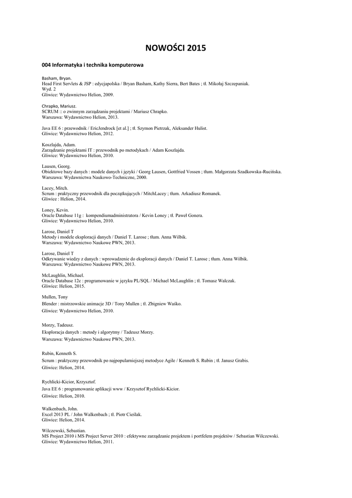 NOWOŚCI 2015 004 Informatyka i technika komputerowa Basham, Bryan. Head First Servlets & JSP : edycjapolska / Bryan Basham, Kathy Sierra, Bert Bates ; tł. Mikołaj Szczepaniak. Wyd. 2 Gliwice: Wydawnictwo Helion, 2009. Chrapko, Mariusz. SCRUM :: o zwinnym zarządzaniu projektami / Mariusz Chrapko. Warszawa: Wydawnictwo Helion, 2013. Java EE 6 : przewodnik / EricJendrock [et al.] ; tł. Szymon Pietrzak, Aleksander Hulist. Gliwice: Wydawnictwo Helion, 2012. Koszlajda, Adam. Zarządzanie projektami IT : przewodnik po metodykach / Adam Koszlajda. Gliwice: Wydawnictwo Helion, 2010. Lausen, Georg. Obiektowe bazy danych : modele danych i języki / Georg Lausen, Gottfried Vossen ; tłum. Małgorzata Szadkowska-Rucińska. Warszawa: Wydawnictwa Naukowo-Techniczne, 2000. Lacey, Mitch. Scrum : praktyczny przewodnik dla początkujących / MitchLacey ; tłum. Arkadiusz Romanek. Gliwice : Helion, 2014. Loney, Kevin. Oracle Database 11g : kompendiumadministratora / Kevin Loney ; tł. Paweł Gonera. Gliwice: Wydawnictwo Helion, 2010. Larose, Daniel T Metody i modele eksploracji danych / Daniel T. Larose ; tłum. Anna Wilbik. Warszawa: Wydawnictwo Naukowe PWN, 2013. Larose, Daniel T Odkrywanie wiedzy z danych : wprowadzenie do eksploracji danych / Daniel T. Larose ; tłum. Anna Wilbik. Warszawa: Wydawnictwo Naukowe PWN, 2013. McLaughlin, Michael. Oracle Database 12c : programowanie w języku PL/SQL / Michael McLaughlin ; tł. Tomasz Walczak. Gliwice: Helion, 2015. Mullen, Tony Blender : mistrzowskie animacje 3D / Tony Mullen ; tł. Zbigniew Waśko. Gliwice: Wydawnictwo Helion, 2010. Morzy, Tadeusz. Eksploracja danych : metody i algorytmy / Tadeusz Morzy. Warszawa: Wydawnictwo Naukowe PWN, 2013. Rubin, Kenneth S. Scrum : praktyczny przewodnik po najpopularniejszej metodyce Agile / Kenneth S. Rubin ; tł. Janusz Grabis. Gliwice: Helion, 2014. Rychlicki-Kicior, Krzysztof. Java EE 6 : programowanie aplikacji www / Krzysztof Rychlicki-Kicior. Gliwice: Helion, 2010. Walkenbach, John. Excel 2013 PL / John Walkenbach ; tł. Piotr Cieślak. Gliwice: Helion, 2014. Wilczewski, Sebastian. MS Project 2010 i MS Project Server 2010 : efektywne zarządzanie projektem i portfelem projektów / Sebastian Wilczewski. Gliwice: Wydawnictwo Helion, 2011. 005.51 Logistyka – zarządzanie Szymonik, Andrzej. Bezpieczeństwo systemu logistycznego w nowoczesnym zarządzaniu / Andrzej Szymonik, Maciej Bielecki. Warszawa: Difin, 2015. 061.1(4-67):339.923:327.39 Unia Europejska Europejska unia bankowa / red. nauk. Małgorzata Zaleska. Warszawa: Difin, 2015. 159.9 Psychologia Psychologia rodziny / red. nauk. Iwona Janicka, Hanna Liberska. Warszawa: Wydawnictwo Naukowe PWN, 2014. Wychowanie a cywilizacja uzależnień i agresji / red. nauk. Alina Rynio, Katarzyna Stępień. Lublin: Fundacja „ServireVeritati" Instytut Edukacji Narodowej: Wydawnictwo KUL, 2014. 31 Statystyka. Demografia Demografia i bezpieczeostwo społeczne krajów Unii Europejskiej / red. nauk. Izydor Sobczak, Monika Wyrzykowska-Antkiewicz. Gdańsk: Wyższa Szkoła Bankowa; Warszawa : CeDeWu, 2013 Okólski, Marek. Demografia : współczesne zjawiska i teorie / Marek Okólski, Agnieszka Fihel. Warszawa: Wydawnictwo Naukowe Scholar, 2012. 316 Socjologia Dyskursy ubóstwa i wykluczenia społecznego: praca zbiorowa / red. Elżbieta Tarkowska. Warszawa: Wydawnictwo IFiS PAN, 2013. Socjologia medycyny : podejmowane problemy, kategorie analizy / red. Antonina Ostrowska. Warszawa: Wydawnictwo Instytutu Filozofii i Socjologii PAN, 2009. Socjologia medycyny w multidyscyplinarnych badaniach humanizujących biomedycynę / red. Michał Skrzypek. Lublin: Wydawnictwo Katolickiego Uniwersytetu Lubelskiego, 2013. Wybrane elementy socjologii: podręcznik dla studentów i absolwentów wydziałów pielęgniarstwa i nauk o zdrowiu akademii medycznych / pod red. Anity Majchrowskiej ; [aut. Renata Bogusz et al.]. Lublin: Wydawnictwo Czelej, 2003. 336 Finanse. Finanse publiczne. Cła. Bankowośd. Pieniądz. Giełda. Podatki. Ubezpieczenia Europejska unia bankowa / red. nauk. Małgorzata Zaleska. Warszawa: Difin, 2015. Finanse publiczne z elementami prawa podatkowego / red. nauk. Władysław Grześkiewicz ; [aut. Magdalena Ajchel, Andrzej Błaszczak, W. Grześkiewicz]. Warszawa: Difin, 2014. Funkcjonowanie współczesnego rynku pieniężnego i kapitałowego / red. Wiesława Przybylska-Kapuścioska. Warszawa: CeDeWu, 2013. Jajuga, Krzysztof Inwestycje : instrumenty finansowe, aktywa niefinansowe, ryzyko finansowe, inżynieria finansowa / Krzysztof Jajuga, Teresa Jajuga. Wyd. 3 zm. Warszawa: Wydawnictwo Naukowe PWN, 2014. Machlup, Fritz Giełda, kredyt, kapitał: fundamenty rynku papierów wartościowych / Fritz Machlup ; przeł. Mateusz Falkowski. Warszawa: Fijorr Publishing, 2013. Wernik, Andrzej. Finanse publiczne : cele, struktury, uwarunkowania / Andrzej Wernik. Wyd. 3. zm. Warszawa: Polskie Wydawnictwo Ekonomiczne, 2014. 339 Handel. Międzynarodowe stosunki gospodarcze. Gospodarka światowa. Globalizacja. Geografia polityczna Finanse międzynarodowe : wybrane problemy / red. nauk. Magdalena Markiewicz, Urszula Mrzygłód. Warszawa: Polskie Wydawnictwo Ekonomiczne, 2015. Funkcjonowanie współczesnej gospodarki rynkowej: rynek finansowy / red. Wiesława Przybylska-Kapuścioska. Warszawa: CeDeWu, 2013. 34 Nauki prawne. Prawo Finanse publiczne z elementami prawa podatkowego / red. nauk. Władysław Grześkiewicz ; [aut. Magdalena Ajchel, Andrzej Błaszczak, W. Grześkiewicz]. Warszawa: Difin, 2014. Metodyka pracy mediatora w sprawach karnych / red. nauk. Olga Sitarz ; [aut. Dominika Bek, Kamilla Bargiel-Matusiewicz, Grzegorz Frączek, Olga Sitarz]. Warszawa: Difin, 2015. Prawo kredytowe wraz z indeksem rzeczowym/[red. Aneta Flisek]. Stan prawny 1 sierpnia 2011 r. Warszawa: Wydawnictwo C. H. Beck, 2011. 364 Opieka społeczna Dyskursy ubóstwa i wykluczenia społecznego: praca zbiorowa / red. Elżbieta Tarkowska. Warszawa: Wydawnictwo IFiS PAN, 2013. 368 Ubezpieczenia Problemy współczesnego