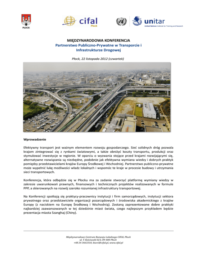 MIĘDZYNARODOWA KONFERENCJA Partnerstwo Publiczno-Prywatne w Transporcie i Infrastrukturze Drogowej Płock, 22 listopada 2012 (czwartek) Wprowadzenie Efektywny transport jest ważnym elementem rozwoju gospodarczego. Sieć solidnych dróg pozwala krajom zintegrować się z rynkami światowymi, a także obniżyć koszty transportu, produkcji oraz stymulować inwestycje w regionie. W oparciu o wyzwania stojące przed krajami rozwijającymi się, alternatywne rozwiązania są niezbędne, podobnie jak efektywna wymiana wiedzy i dobrych praktyk pomiędzy przedstawicielami krajów Europy Środkowej i Wschodniej. Partnerstwo publiczno-prywatne może wypełnić lukę możliwości władz lokalnych i wspomóc te kraje w procesie budowy i utrzymania sieci transportowych. Konferencja, która odbędzie się w Płocku ma za zadanie stworzyć platformę wymiany wiedzy w zakresie uwarunkowań prawnych, finansowych i technicznych projektów realizowanych w formule PPP, a skierowanych na rozwój szeroko rozumianej infrastruktury transportowej. Na Konferencji spotkają się praktycy-pracownicy instytucji i firm samorządowych, instytucji sektora prywatnego oraz przedstawiciele organizacji pozarządowych i środowiska akademickiego z krajów Europy (z naciskiem na Europę Środkową i Wschodnią). Zostaną zaprezentowane dobre praktyki najbardziej zaawansowanych w tej dziedzinie miast świata, czego najlepszym przykładem będzie prezentacja miasta Szanghaj (Chiny). Międzynarodowe Centrum Rozwoju Lokalnego CIFAL Płock ul. T. Kościuszki 8/3, 09-400 Płock +48 24 3663310, [email protected], www.cifal.pl Data 22 listopada 2012 r. Miejsce „Hotel Tumski”, ul. Piekarska 9, 09-400, Płock Partnerzy Instytut ONZ ds. Badań i Szkoleń UNITAR, Urząd Miasta Płocka Patronat honorowy Ministerstwo Rozwoju Regionalnego RP Partner merytoryczny Instytut PPP Patronat medialny PPPortal.pl Grupa docelowa Przedstawiciele władz rządowych, samorządowych oraz przedstawiciele sektora prywatnego, organizacji pozarządowych i społeczeństwa obywatelskiego, a także środowiska akademickiego z krajów Europy Centralnej i Wschodniej. Zakres tematyczny Konferencja składać się będzie z następujących działów: • Przedstawienie międzynarodowych projektów PPP, • Zagadnienia prawne międzynarodowych projektów PPP w transporcie, • Zagadnienia finansowe międzynarodowych projektów PPP w transporcie, • Dobre praktyki i studia przypadków projektów PPP. Struktura Konferencji • Prezentacja podstawowych zagadnień związanych z formułą PPP, • Studia przypadków z poszczególnych krajów, • Przegląd dobrych praktyk, wymiana doświadczeń pomiędzy uczestnikami. Podczas Konferencji organizatorzy zapewniają tłumaczenie symultaniczne. Certyfikat UNITAR/CIFAL Każdy uczestnik otrzyma prestiżowy Certyfikat potwierdzający udział w Konferencji „Partnerstwo Publiczno-Prywatne w Transporcie i Infrastrukturze Drogowej”, sygnowany przez przedstawicieli UNITAR i CIFAL. Międzynarodowe Centrum Rozwoju Lokalnego CIFAL Płock ul. T. Kościuszki 8/3, 09-400 Płock +48 24 3663310, [email protected], www.cifal.pl MIĘDZYNARODOWA KONFERENCJA Partnerstwo Publiczno-Prywatne w Transporcie i Infrastrukturze Drogowej wstępny program Dzień 1 - czwartek, 22 listopada 2012 – konferencja. “Hotel Tumski”, ul. Piekarska 9, Płock 09.30-10.00 Rejestracja Otwarcie konferencji 10.00-10.15 Powitanie gości przez Prezydenta m. Płocka Prezentacja UNITAR i CIFAL „Przegląd projektów PPP w chińskim transporcie” 10.15-10.45 Zhonghua Wang, Zastępca Przewodniczącego Komisji Gospodarczo-Informatycznej Miasta Szanghaj/Chiny „Jak stworzyć udane partnerstwo publiczno-prywatne” 10.45-11.15 Peter Snelson, „PPP Consult”, Harwood, Wielka Brytania „Pilotażowy projekt drogowy PPP na Litwie” 11.15-11.45 Jonas Kimontas, Główny Menedżer Projektu, “Invest Lithuania”, Wilno/Litwa 11.45-12.15 „Czeskie przykłady projektów w formule PPP” Vladimír Sloup, Dyrektor, Association of PPP, Praga/Czechy 12.15-12.45 Przerwa kawowa 12.45-13.15 Wideo-konferencja Bernadia Irawati Tjandradewi, Ph.D., Dyrektor Programowy, CITYNET Regional Network of Local Authorities for the Management of Human Settlement, Tokyo/Japonia 13.15-13.45 13.45-14.15 14.15-14.45 14.45-15.15 15.15-16.00 16.00 Dr Andrzej Urbanik, Członek Forum Europejskich Drogowych Laboratoriów Badawczych FEHRL, Sekretarz Generalny Polskiej Platformy Technologicznej Transportu Drogowego, Instytut Badawczy Dróg i Mostów, Warszawa/Polska „Aspekty prawne i finansowe międzynarodowych projektów PPP” Adam Jędrzejewski, Dyrektor Departamentu Spraw Międzynarodowych, Instytut PPP, Warszawa „Proces ulepszania wykonalności projektów PPP w Polsce” Witold Grzybowski, Ekspert, “Collect Consulting”, Katowice „PPP w sektorze drogowym - działania Ministerstwa Rozwoju Regionalnego” Mateusz Urasiński, Specjalista, Departament Przygotowania Projektów Indywidualnych, Ministerstwo Rozwoju Regionalnego, Warszawa Debata: PPP – za i przeciw Moderator: Prof. Wojciech Suchorzewski, Profesor Politechniki Warszawskiej, Warszawa Lunch Moderator: Waldemar Chachulski (Strabag Sp. z o.o.) Patronat honorowy: Pod patronatem medialnym: Partner merytoryczny: Międzynarodowe Centrum Rozwoju Lokalnego CIFAL Płock ul. T. Kościuszki 8/3, 09-400 Płock +48 24 3663310, [email protected], www.cifal.pl