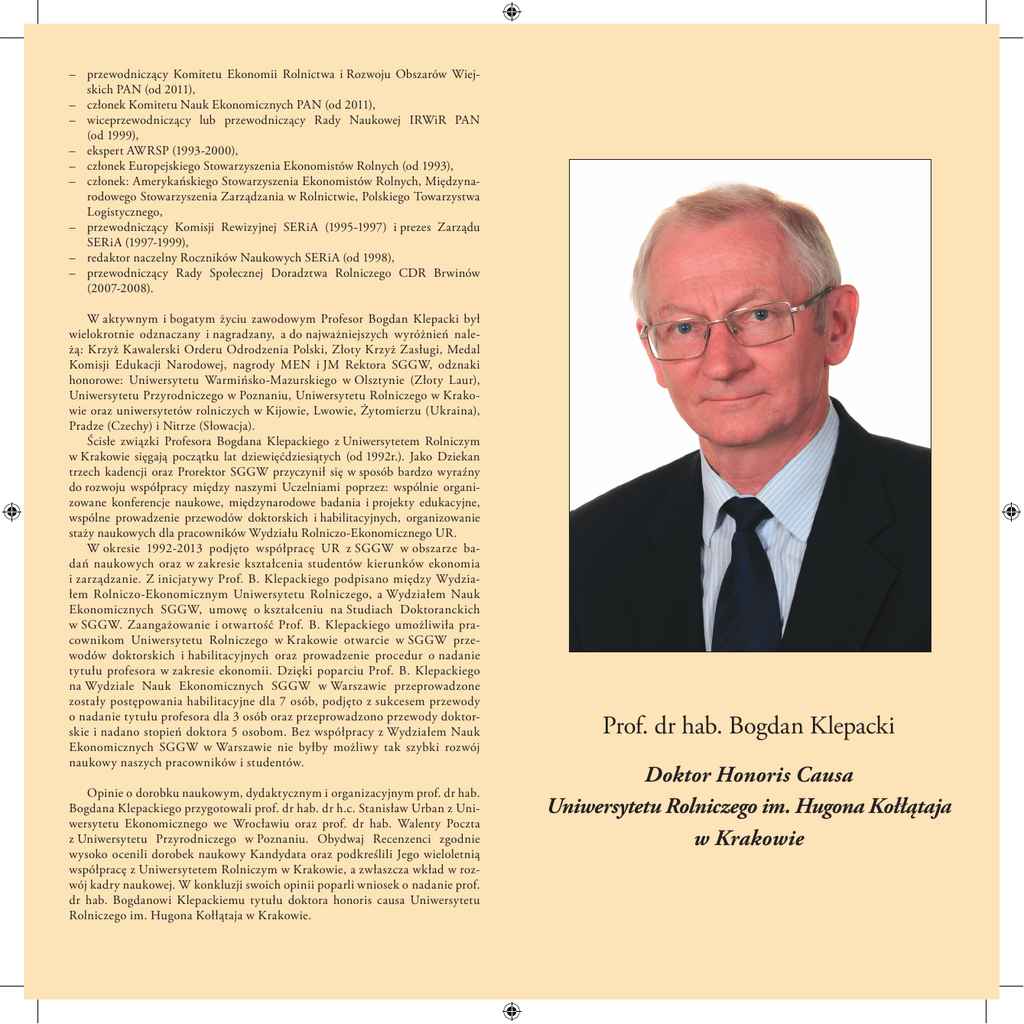 – przewodniczący Komitetu Ekonomii Rolnictwa i Rozwoju Obszarów Wiejskich PAN (od 2011), – członek Komitetu Nauk Ekonomicznych PAN (od 2011), – wiceprzewodniczący lub przewodniczący Rady Naukowej IRWiR PAN (od 1999), – ekspert AWRSP (1993-2000), – członek Europejskiego Stowarzyszenia Ekonomistów Rolnych (od 1993), – członek: Amerykańskiego Stowarzyszenia Ekonomistów Rolnych, Międzynarodowego Stowarzyszenia Zarządzania w Rolnictwie, Polskiego Towarzystwa Logistycznego, – przewodniczący Komisji Rewizyjnej SERiA (1995-1997) i prezes Zarządu SERiA (1997-1999), – redaktor naczelny Roczników Naukowych SERiA (od 1998), – przewodniczący Rady Społecznej Doradztwa Rolniczego CDR Brwinów (2007-2008). W aktywnym i bogatym życiu zawodowym Profesor Bogdan Klepacki był wielokrotnie odznaczany i nagradzany, a do najważniejszych wyróżnień należą: Krzyż Kawalerski Orderu Odrodzenia Polski, Złoty Krzyż Zasługi, Medal Komisji Edukacji Narodowej, nagrody MEN i JM Rektora SGGW, odznaki honorowe: Uniwersytetu Warmińsko-Mazurskiego w Olsztynie (Złoty Laur), Uniwersytetu Przyrodniczego w Poznaniu, Uniwersytetu Rolniczego w Krakowie oraz uniwersytetów rolniczych w Kijowie, Lwowie, Żytomierzu (Ukraina), Pradze (Czechy) i Nitrze (Słowacja). Ścisłe związki Profesora Bogdana Klepackiego z Uniwersytetem Rolniczym w Krakowie sięgają początku lat dziewięćdziesiątych (od 1992r.). Jako Dziekan trzech kadencji oraz Prorektor SGGW przyczynił się w sposób bardzo wyraźny do rozwoju współpracy między naszymi Uczelniami poprzez: wspólnie organizowane konferencje naukowe, międzynarodowe badania i projekty edukacyjne, wspólne prowadzenie przewodów doktorskich i habilitacyjnych, organizowanie staży naukowych dla pracowników Wydziału Rolniczo-Ekonomicznego UR. W okresie 1992-2013 podjęto współpracę UR z SGGW w obszarze badań naukowych oraz w zakresie kształcenia studentów kierunków ekonomia i zarządzanie. Z inicjatywy Prof. B. Klepackiego podpisano między Wydziałem Rolniczo-Ekonomicznym Uniwersytetu Rolniczego, a Wydziałem Nauk Ekonomicznych SGGW, umowę o kształceniu na Studiach Doktoranckich w SGGW. Zaangażowanie i otwartość Prof. B. Klepackiego umożliwiła pracownikom Uniwersytetu Rolniczego w Krakowie otwarcie w SGGW przewodów doktorskich i habilitacyjnych oraz prowadzenie procedur o nadanie tytułu profesora w zakresie ekonomii. Dzięki poparciu Prof. B. Klepackiego na Wydziale Nauk Ekonomicznych SGGW w Warszawie przeprowadzone zostały postępowania habilitacyjne dla 7 osób, podjęto z sukcesem przewody o nadanie tytułu profesora dla 3 osób oraz przeprowadzono przewody doktorskie i nadano stopień doktora 5 osobom. Bez współpracy z Wydziałem Nauk Ekonomicznych SGGW w Warszawie nie byłby możliwy tak szybki rozwój naukowy naszych pracowników i studentów. Opinie o dorobku naukowym, dydaktycznym i organizacyjnym prof. dr hab. Bogdana Klepackiego przygotowali prof. dr hab. dr h.c. Stanisław Urban z Uniwersytetu Ekonomicznego we Wrocławiu oraz prof. dr hab. Walenty Poczta z Uniwersytetu Przyrodniczego w Poznaniu. Obydwaj Recenzenci zgodnie wysoko ocenili dorobek naukowy Kandydata oraz podkreślili Jego wieloletnią współpracę z Uniwersytetem Rolniczym w Krakowie, a zwłaszcza wkład w rozwój kadry naukowej. W konkluzji swoich opinii poparli wniosek o nadanie prof. dr hab. Bogdanowi Klepackiemu tytułu doktora honoris causa Uniwersytetu Rolniczego im. Hugona Kołłątaja w Krakowie. Prof. dr hab. Bogdan Klepacki Doktor Honoris Causa Uniwersytetu Rolniczego im. Hugona Kołłątaja w Krakowie Prof. dr hab. Bogdan Klepacki urodził się 14.08.1953 r. w Klepaczach (Podlasie). Technikum Rolnicze ukończył w Czartajewie (1972). W latach 1972–1977 studiował na Wydziale Ekonomiczno-Rolniczym SGGW-AR w Warszawie. Bezpośrednio po studiach rozpoczął pracę w Instytucie Ekonomiki i Organizacji Gospodarstw Rolniczych macierzystej uczelni (SGGW), obecnie w Katedrze Ekonomiki i Organizacji Przedsiębiorstw w charakterze: asystenta stażysty - 1977r., asystenta – 1978r., starszego asystenta - 1979r., adiunkta – 1984r., profesora nadzwyczajnego – 1994r. i od 2000r. profesora zwyczajnego. Na macierzystym Wydziale Ekonomiczno-Rolniczym doktoryzował się pod kierunkiem prof. dr hab. Z. Wojtaszka w 1983r., na podstawie rozprawy pt.: „Organizacja i poziom produkcji rolniczej gospodarstw indywidualnych powiększających obszar”. W 1991r. uzyskał stopień doktora habilitowanego nauk ekonomicznych na podstawie dorobku naukowego i rozprawy habilitacyjnej pt.: „Organizacyjne i ekonomiczne uwarunkowania postępu technologicznego w gospodarstwach indywidualnych (na przykładzie produkcji roślinnej)”. Tytuł naukowy profesora nauk ekonomicznych uzyskał w 1997 roku. Prof. dr hab. Bogdan Klepacki posiada bogaty i wysoko ceniony dorobek naukowy. Opublikował jako autor lub współautor około 500 publikacji w tym m.in. książki: Organizacyjne i ekonomiczne uwarunkowania postępu technologicznego w gospodarstwach indywidualnych (na przykładzie produkcji roślinnej), Ekonomika i organizacja rolnictwa, Produkcyjne i ekonomiczne przystosowania gospodarstw prywatnych do zmian warunków gospodarowania, Wybrane pojęcia z zakresu organizacji gospodarstw, produkcji i pracy w rolnictwie, Podstawy organizacji i zarządzania. Jest autorem ponad 280 oryginalnych prac twórczych, 35 podręczników i skryptów oraz ponad 200 innych publikacji. Był wykonawcą ok. 100 ekspertyz, biznesplanów, scenariuszy TV, założeń do programów komputerowych technologii produkcji roślinnej, analizy kosztów. W działalności na rzecz rozwoju i upowszechniania nauki Profesor Klepacki dał się poznać jako organizator i czynny uczestnik wielu konferencji i seminariów naukowych krajowych i międzynarodowych. Występował z referatami zamawianymi na konferencjach i kongresach zagranicznych (Słowacja, Ukraina, RFN, Grecja, Turcja, Filipiny). Był visiting 