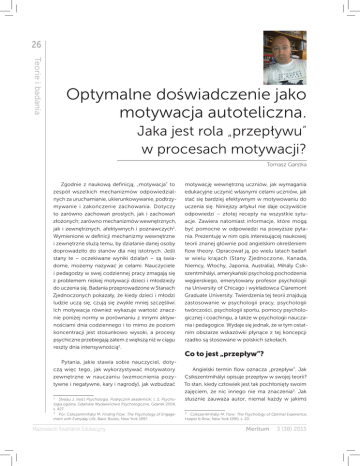 26 Teorie i badania Optymalne doświadczenie jako motywacja autoteliczna. Jaka jest rola „przepływu” w procesach motywacji? Tomasz Garstka Zgodnie z naukową definicją, „motywacja” to zespół wszelkich mechanizmów odpowiedzialnych za uruchamianie, ukierunkowywanie, podtrzymywanie i zakończenie zachowania. Dotyczy to zarówno zachowań prostych, jak i zachowań złożonych; zarówno mechanizmów wewnętrznych, jak i zewnętrznych, afektywnych i poznawczych1. Wymienione w definicji mechanizmy wewnętrzne i zewnętrzne służą temu, by działanie danej osoby doprowadziło do stanów dla niej istotnych. Jeśli stany te – oczekiwane wyniki działań – są świadome, możemy nazywać je celami. Nauczyciele i pedagodzy w swej codziennej pracy zmagają się z problemem niskiej motywacji dzieci i młodzieży do uczenia się. Badania przeprowadzone w Stanach Zjednoczonych pokazały, że kiedy dzieci i młodzi ludzie uczą się, czują się zwykle mniej szczęśliwi. Ich motywacja również wykazuje wartość znacznie poniżej normy w porównaniu z innymi aktywnościami dnia codziennego i to mimo że poziom koncentracji jest stosunkowo wysoki, a procesy psychiczne przebiegają zatem z większą niż w ciągu reszty dnia intensywnością2. motywację wewnętrzną uczniów, jak wymagania edukacyjne uczynić własnymi celami uczniów, jak stać się bardziej efektywnym w motywowaniu do uczenia się. Niniejszy artykuł nie daje oczywiście odpowiedzi – złotej recepty na wszystkie sytuacje. Zawiera natomiast informacje, które mogą być pomocne w odpowiedzi na powyższe pytania. Prezentuję w nim opis interesującej naukowej teorii znanej głównie pod angielskim określeniem flow theory. Opracował ją, po wielu latach badań w wielu krajach (Stany Zjednoczone, Kanada, Niemcy, Włochy, Japonia, Australia), Mihály Csíkszentmihályi, amerykański psycholog pochodzenia węgierskiego, emerytowany profesor psychologii na University of Chicago i wykładowca Claremont Graduate University. Twierdzenia tej teorii znajdują zastosowanie w psychologii pracy, psychologii twórczości, psychologii sportu, pomocy psychologicznej i coachingu, a także w psychologii nauczania i pedagogice. Wydaje się jednak, że w tym ostatnim obszarze wskazówki płynące z tej koncepcji rzadko są stosowane w polskich szkołach. Co to jest „przepływ”? Pytania, jakie stawia sobie nauczyciel, dotyczą więc tego, jak wykorzystywać motywatory zewnętrzne w nauczaniu (wzmocnienia pozytywne i negatywne, kary i nagrody), jak wzbudzać 1 Strelau J. [red.] Psychologia. Podręcznik akademicki, t. 2, Psychologia ogólna, Gdańskie Wydawnictwo Psychologiczne, Gdańsk 2004, s. 427. 2 Por. Csíkszentmihályi M. Finding Flow: The Psychology of Engagement with Everyday Life, Basic Books, New York 1997. Mazowiecki Kwartalnik Edukacyjny Angielski termin flow oznacza „przepływ”. Jak Csíkszentmihályi opisuje przepływ w swojej teorii? To stan, kiedy człowiek jest tak pochłonięty swoim zajęciem, że nic innego nie ma znaczenia3. Jak słusznie zauważa autor, niemal każdy w jakimś 3 Csíkszentmihályi M. Flow: The Psychology of Optimal Experience, Harper & Row, New York 1990, s. 20. Meritum 3 (38) 2015 Optymalne doświadczenie jako motywacja autoteliczna. Jaka jest rola „przepływu” w procesach motywacji? 27 na zwracaniu się do ludzi z prośbą o wypełnienie kartki z kalendarza pod koniec dnia lub tygodnia. W tym celu opracował na początku lat 70. XX w. własną metodę próbki doświadczeń (MPD – ang. experience sampling method – ESM). W metodzie tej wykorzystuje się pager albo zaprogramowany zegarek, który sygnalizuje uczestnikowi badania, kiedy należy wypełnić dwie strony w broszurce. Osoba badana cały czas nosi tę broszurkę ze sobą. Sygnały włączają się w nieregularnych odstępach czasu, w dwugodzinnych cyklach od wczesnego ranka do jedenastej wieczorem, a nawet później. Na Tu wyrazić trzeba wielkie uznanie autorowi dźwięk sygnału uczestnik badania zapisuje, gdzie teorii optymalnego doświadczenia. Oto po raz się znajduje, z kim, co robi, o czym myśli, a następpierwszy z taką dbałością nie, posługując się rozmametodologiczną spotkały itymi skalami liczbowymi, się psychologia humaniokreśla stan swojej świastyczna i naukowe badadomości – to, jak bardzo badania przeprowadzone nia psychologiczne. Jak czuje się szczęśliwy, jak w i a d o m o , p s y c h o l o g o - w Stanach Zjednoczonych bardzo jest skoncentrowie humanistyczni stwowany, jak silną ma motywykazały, że kiedy dzieci rzyli wiele koncepcji, które wację, jak wysokie mniei młodzi ludzie uczą się, imponowały całościowym manie o sobie i tak dalej. ujęciem i wciąż mają duże Na przestrzeni lat Csíkczują się zwykle mniej znaczenie w psychoterapii szentmihályi wraz z zesposzczęśliwi i edukacji mimo niedostałem badawczym zgromatecznego poparcia w wynidził ponad siedemdziesiąt kach empirycznych badań tysięcy stron pochodząnaukowych (lub w ogóle braku rzetelnych prób cych od około dwóch tysięcy trzystu respondenweryfikacji ich twierdzeń w takich badaniach). tów; badacze z uniwersytetów w innych częściach Przykładem jest tu popularna piramida potrzeb świata z górą potroili te liczby6. Abrahama Maslowa4, która postulatywnie zakłada Czym charakteryzuje się przepływ? Oddajmy powszechność potrzeby samorealizacji, ale nie głos autorowi teorii optymalnego doświadczenia7: uwzględnia różnic kulturowych ani złożonych różnic indywidualnych i nie wyjaśnia normalnych • Świadomość co i jak robić: 1. Osoba doświadludzi, które są sprzeczne z drabiną zaspokajania 5 czająca przepływu dobrze wie, co i jak należy potrzeb . zrobić i błyskawicznie, na zasadzie sprzężenia Tymczasem Csíkszentmihályi zdecydował zwrotnego (ang. feedback)8, otrzymuje informasię zbadać to, co płynęło z intuicji humanistów cję o skuteczności własnych poczynań. i z je