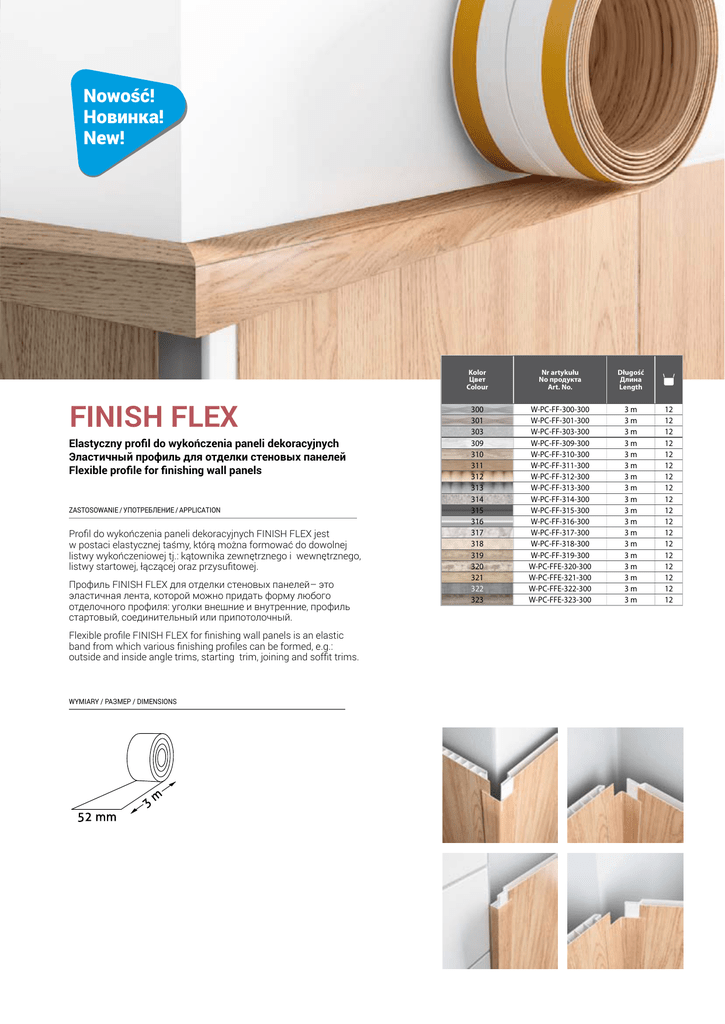 Nowość! Новинка! New! FINISH FLEX Elastyczny profil do wykończenia paneli dekoracyjnych Эластичный профиль для отделки стеновых панелей Flexible profile for finishing wall panels ZASTOSOWANIE / УПОТРЕБЛЕНИЕ / APPLICATION Profil do wykończenia paneli dekoracyjnych FINISH FLEX jest w postaci elastycznej taśmy, którą można formować do dowolnej listwy wykończeniowej tj.: kątownika zewnętrznego i wewnętrznego, listwy startowej, łączącej oraz przysufitowej. Профиль FINISH FLEX для отделки стеновых панелей– это эластичная лента, которой можно придать форму любого отделочного профиля: уголки внешние и внутренние, профиль стартовый, соединительный или припотолочный. Flexible profile FINISH FLEX for finishing wall panels is an elastic band from which various finishing profiles can be formed, e.g.: outside and inside angle trims, starting trim, joining and soffit trims. WYMIARY / РАЗМЕР / DIMENSIONS Kolor Цвет Colour Nr artykułu No продукта Art. No. Długość Длина Length 300 301 303 309 310 311 312 313 314 315 316 317 318 319 320 321 322 323 W-PC-FF-300-300 W-PC-FF-301-300 W-PC-FF-303-300 W-PC-FF-309-300 W-PC-FF-310-300 W-PC-FF-311-300 W-PC-FF-312-300 W-PC-FF-313-300 W-PC-FF-314-300 W-PC-FF-315-300 W-PC-FF-316-300 W-PC-FF-317-300 W-PC-FF-318-300 W-PC-FF-319-300 W-PC-FFE-320-300 W-PC-FFE-321-300 W-PC-FFE-322-300 W-PC-FFE-323-300 3m 3m 3m 3m 3m 3m 3m 3m 3m 3m 3m 3m 3m 3m 3m 3m 3m 3m 12 12 12 12 12 12 12 12 12 12 12 12 12 12 12 12 12 12