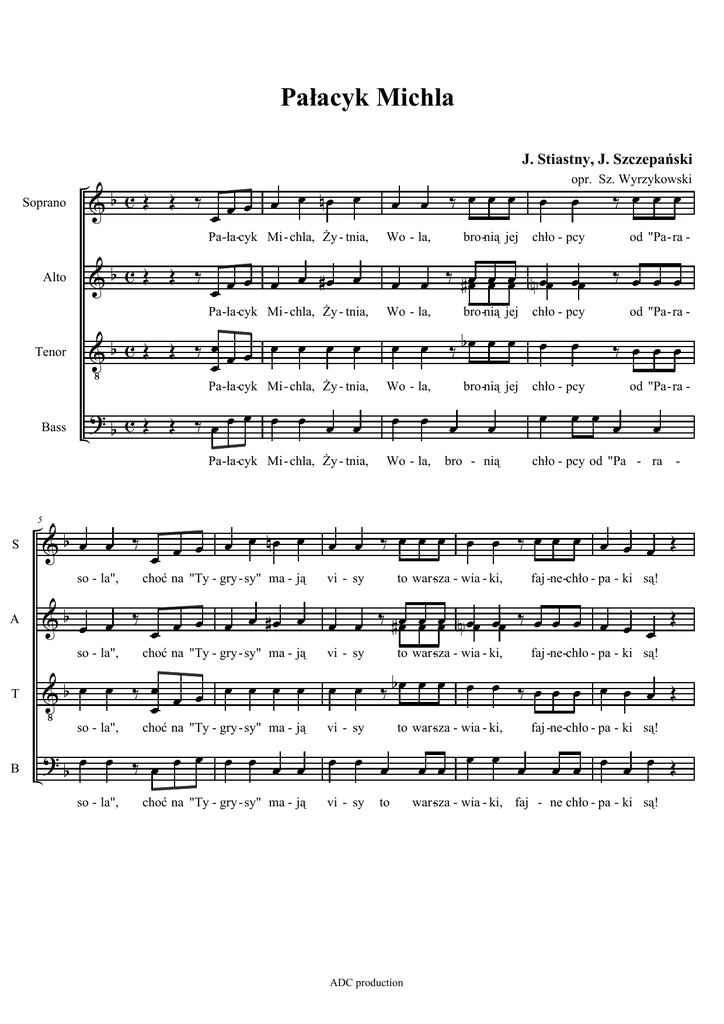 Pałacyk Michla J. Stiastny, J. Szczepański Soprano & b c Œ Œ ‰ œ œ œ œ œ nœ œ Pa -ła-cyk Mi - chla, śy - tnia, Alto & b c Œ Œ ‰ œ œ œ œ œ #œ œ Pa -ła-cyk Mi - chla, śy - tnia, Tenor V b c Œ Œ ‰ œœ œ œ œ œ œ œ Pa -ła-cyk Mi - chla, śy - tnia, Bass ?b c Œ Œ ‰ œ œ œ œ œ œ œ Pa -ła-cyk Mi - chla, śy - tnia, 5 S &b œ œ ‰ so - la", A Wo - la, bro -nią jej œ œ ‰ œ œ œ chło - pcy od "Pa - ra - œ œ ‰ # œœ œœ œœ N œœ œœ ‰ œ œ œ œ œ ‰ bœ œ œ ‰ œ œ œ Wo - la, bro -nią jej Wo - la, bro -nią jej œ œ œ Wo - la, œ bro - nią chło - pcy œ œ od "Pa - ra - chło - pcy œ œ œ od "Pa - ra - œ œ chło - pcy od "Pa - ra vi - sy to war -sza - wia - ki, faj -ne-chło - pa - ki są! œ œ ‰ # œœ œœ œœ N œœ œœ ‰ œ œ œ œ œ œ Œ vi - sy to war -sza - wia - ki, faj -ne-chło - pa - ki są! Vb œ œ ‰ œ œ œ œ œ œ œ œ vi - sy to war -sza - wia - ki, faj -ne-chło - pa - ki są! choć na "Ty - gry - sy" ma - ją ?b œ œ ‰ œ œ œ œ œ œ œ so - la", choć na "Ty - gry - sy" ma - ją - œ œ ‰ œ œ œ œ œ ‰ œ œ œ œ œ œ Œ choć na "Ty - gry - sy" ma - ją so - la", B choć na "Ty - gry - sy" ma - ją &b œ œ ‰ œ œ œ #œ œ œ œ so - la", T œ œ œ nœ œ œ œ œ œ ‰ œ œ œ opr. Sz. Wyrzykowski œ œ ‰ bœ œ œ œ œ ‰ œ œ œ œ œ œ Œ œ œ œ vi - sy to ADC production œ œ œ œ œ œ œ œ œ œ Œ war -sza - wia - ki, faj - ne chło - pa - ki są! 2 Pałacyk Michla 10 S &b œœ .. ∑ j œœ œœ . œœ œœ œœ J . ˙˙ j œ œ. œ œ œ ˙ Czu - waj A ∑ &b œ. Czu - waj T Vb œ œ œ œ Czu -waj wia - ro B ?b œ œ œ œ Czu -waj wia - ro S B œ. œ œ œ œœ .. œœ œœ œœ pra -cu-jąc-! ˙ œ. œ œ œ pręŜ swój mło -dy duch, ˙ œ. œ œ œ pra -cu-jąc-! ˙ œ. œ œ œ i wytę - -Ŝaj słuch, pręŜ swój mło-dy duch, pra -cu-jąc za dwóch! i wytę - -Ŝaj słuch, pręŜ swój mło-dy duch, pra -cu-jąc za dwóch! œ. œ œ œ ˙ œ. œ œ œ ˙ Vb œ œ œ œ ˙ Czu - waj wia - ro i i i œ. œ œ œ ˙ œ. œ œ œ ˙ &b œ œ œ œ Czu - waj wia - ro T ˙ œ. œ œ œ ˙˙ pręŜ swój mło -dy duch, i wytę - -Ŝaj słuch, œ. œ œ œ ˙ Czu - waj wia - ro A i wytę - -Ŝaj słuch, &b œ œ œ œ 14 œœ .. œœ œœ œœ wy-tę - Ŝaj słuch, œ œ œ œ œ. œ œ œ œ œ pręŜ swój mło - dy duch wy-tę - Ŝaj słuch, wy-tę - Ŝaj ?b œ œ œ œ ˙ œ. œ œ œ Czu - waj wia - ro i i wy-tę - Ŝaj œ jak ˙ ˙ jak stal! œ œ œ œ ˙ słuch, mło - dy duch jak stal! œ œ œ œ œ słuch, mło - dy duch jak ˙ stal! 2. KaŜdy chłopaczek chce być ranny, sanitariuszki - morowe panny, więc gdy cię kulka trafi jaka, poprosisz pannę, da ci buziaka, hej! 5. Wiara się bije, wiara śpiewa, Szkopy się złoszczą, krew ich zalewa, róŜnych sposobów się imają, co chwila "szafę" nam posyłają, hej! 3. Z tyłu za linią dekowniki, intendentura, róŜne umrzyki, gotują zupę, czarną kawę, takim sposobem walczą za sprawę, hej! 6. Lecz na nic "szafa" i granaty za kaŜdym razem dostają baty i wkrótce przyjdzie taka chwila, Ŝe zwycięŜymy - i do cywila, hej! 4. Za to dowództwo jest morowe i w pierwszej linii nadstawia głowę, a najmorowszy przełoŜony to jest nasz Miecio "w kółko golony", hej! Ó stal! œ pręŜ swój mło - dy duch œ. œ œ œ i œ. Ó Ó Ó