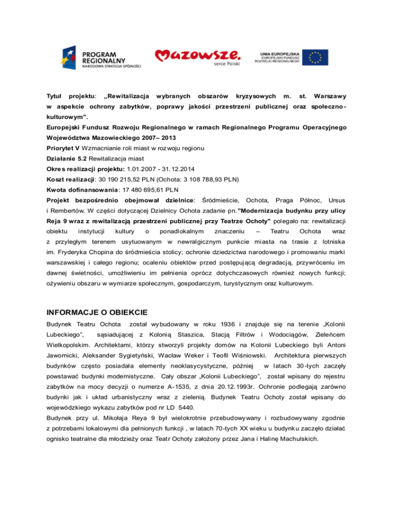 Tytuł projektu: „Rewitalizacja wybranych obszarów kryzysowych m. st. Warszawy w aspekcie ochrony zabytków, poprawy jakości przestrzeni publicznej oraz społeczno kulturowym". Europejski Fundusz Rozwoju Regionalnego w ramach Regionalnego Programu Operacyjnego Województwa Mazowieckiego 2007– 2013 Priorytet V Wzmacnianie roli miast w roz woju regionu Działanie 5.2 Rewitalizacja miast Okre s realizacji projektu: 1.01.2007 - 31. 12.2014 Koszt realizacji: 30 190 215,52 PLN (Ochota: 3 108 788,93 PLN) Kwota dofinansowania: 17 480 695,61 PLN Projekt bezpośrednio obejmował dzielnice: Śródmieście, Ochota, Praga Północ, Ursus i Rembertów. W części dotyczącej Dzielnicy Ochota zadanie pn. "Modernizacja budynku przy ulicy Reja 9 wraz z rewitalizacją przestrzeni publicznej przy Teatrze Ochoty" polegało na: rewitalizacji obiektu instytucji kultury o ponadlokalnym znaczeniu – Teatru Ochota wraz z przyległym terenem usytuowanym w newralgicznym punkcie miasta na t rasie z lotniska im. Fryderyka Chopina do śródmieścia stolicy; ochronie dziedzictwa narodowego i promowaniu marki warszawskiej i całego regionu; ocaleniu obiektów przed postępującą degradacją, przywróceniu im dawnej świet ności, umożliwieniu im pełnienia oprócz dotychczasowych również nowych funkcji; ożywieniu obszaru w wymiarze społecznym, gospodarczym, turystycznym oraz kulturowym. INFORMACJE O OBIEKCIE Budynek Teatru Ochota Lubeckiego”, został wy budowany w roku 1936 i znajduje się na terenie „Kolonii sąsiadującej z Kolonią Staszica, Stacją Filtrów i Wodociągów, Zieleńcem Wielkopolskim. Architektami, którzy stworzyli projekty domów na K olonii Lubeckiego byli Antoni Jawornicki, Aleksander Sygietyński, Wacław Weker i Teofil Wiśniowski. budynków często posiadała elementy neoklasycystyczne, później Architektura pierwszych w latach 30 -tych zaczęły powstawać budynki modernistyczne. Cały obszar „Kolonii Lubeckiego”, został wpisany do rejestru zabytków na mocy decyzji o numerz e A-1535, z dnia 20.12. 1993r. Ochronie podlegają zarówno budynki jak i układ urbanistyczny wraz z zielenią. Budynek Teatru Ochoty został wpisany do wojewódzkiego wykazu zabytków pod nr LD 5440. Budynek przy ul. Mikołaja Reya 9 był wielokrotnie przebudowy wany i rozbudowy wany zgodnie z potrzebami lokalowymi dla pełnionych funkcji , w latach 70-tych XX wieku u budynk u zaczęło działać ognisko teatralne dla młodzieży oraz Teat r Ochoty założony przez Jana i Halinę Machulskich. ZAKRES PRZEBUDOWY Obiekt w 2010 roku był w złym stanie tec hnicznym, brak w nim było udogodnień dla niepełnos prawnych oraz ze względu na brak odpowiednich warunków ewakuacji budynek został zakwalifikowany jako obiekt zagrażający życiu. Niezbędne było wykonanie modernizacji budy nku teatru przy jednoczesnej roz budowie pierwotnej bryły budynk u w s posób uzgodniony ze Stołecznym Konserwatorem Zabytków, przy zachowaniu obecnych funkcji obiektu z możliwością wz bogacenia ich o nową ofertę. W wyniku konkursu na koncepcję architektoniczną rozbudowy budynku przy ul. Mikołaja Reya 9 wraz z zagospodarowaniem skweru ks. Jana Salamuc hy, wyłoniono zwycięski projekt autorstwa SUB Architekci – Jakub Magoń, Danut a Fredowicz. Projekt zakładał rozbudowę istniejącego budynku o pawilon z funkcją kawiarni i przestrzeni wystawienniczej oraz rewitalizację skweru z dodaniem funkcji letniej sceny teatralnej. Podstawowe założenie projektowe polegało na otwarciu projektowanego skrzydła budynku na sąsiadujący z budynkiem teatru skwer tworząc rodzaj połączenia pomiędzy strefą zieleni miejskiej a funkcjami Teat ru. Przeprowadzenie modernizacji poprzez z większenie powierzchni budynk u wpłynie na polepszenie warunków pracy zatrudnionych w teatrze osób oraz na warunki prowadzenia działalności teatralnej i wychowawczej. Tab.1 Zmiana parametrów techniczne obiektu Budynek przed remontem 2 Powierzchnia zabudowy 304 m Powierzchnia całkowita 1057m Kubatura 4486 m 3 2 Budynek po remoncie 765 m 2 2189 m 2 7485 m 3 W roku 2012 przystąpiono do prac budowlanych przy stałym nadzorze Stołecznego Konserwatora Zabytków. W ramach prowadzonych prac budowlanych wykonano nowe przeszklone skrzydło budynku, w którym mieści się kawiarnia oraz pomieszczenia obsługujące salę teatralną, dobudowano 3-kondygnacyjny segment zawierający sale ćwiczeń oraz szyb dź wigu osobowo -t owarowego, przebudowano wejście główne do budynk u, jednocześnie wykonując rampę dla niepełnosprawnych, od strony skweru dobudowano przeszkloną jednokondygnacyjną bryłę z wewnęt rznym dziedzińcem. Pomieszczenia budynku dostosowano do obowiązujących przepisów i standardów, poprawiono akustykę sali teatralnej, zamontowano nowe instalacje wentylacyjne i klimatyzacyjne oraz budynek przystosowano do potrzeb osób z niepełnosprawnością ruchową. Poza zmianami funkcjonalnymi budynek teatru przeszedł również zmianę estetyczną – wszystkie elewacje zostały gruntownie odnowione a dzięki zastosowaniu nowoczesnych elewacji szklanych z motywem szachownicy zyskał indywidualny charakter. Skwer stał się integralną częścią ośrodka Teatru Ochoty i w zależności od potrzeb może spełniać funkcje plenerowej sali wystawienniczej lub letniej sceny teatralno-widowiskowej. Zgodnie z zaleceniami konserwatora został zachowany wysoki drzewos tan, pomiędzy drzewami rozpościerają się trawniki z wyznaczonymi ciągami pieszymi, które łączą wejście do pawilonu i sceny letniej z głównymi traktami pieszymi pobliskich ulic. Ten sposób zagospodarowania przestrzeni skweru umożliwia organizowanie spektakli, happeningów, lub tymczasowych wystaw plenerowych. Realizacja projektu umożliwiła odnowienie zdegradowanego obszaru i zastąpienie go przestrzenią z infrastrukturą sprzyjająca integracji mieszkańców, w tym młodzieży i osób zagrożonych wykluczeniem społ ecznym. Informacje o projekcie dostępn