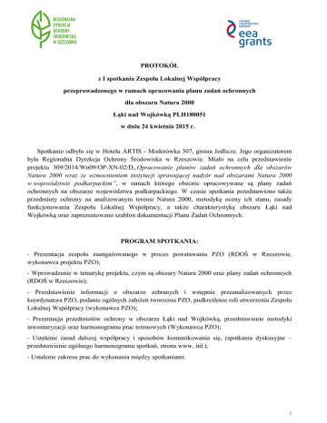 PROTOKÓŁ z I spotkania Zespołu Lokalnej Współpracy przeprowadzonego w ramach opracowania planu zadań ochronnych dla obszaru Natura 2000 Łąki nad Wojkówką PLH180051 w dniu 24 kwietnia 2015 r. Spotkanie odbyło się w Hotelu ARTIS - Moderówka 307, gmina Jedlicze. Jego organizatorem była Regionalna Dyrekcja Ochrony Środowiska w Rzeszowie. Miało na celu przedstawienie projektu 309/2014/Wn09/OP-XN-02/D„Opracowanie planów zadań ochronnych dla obszarów Natura 2000 wraz ze wzmocnieniem instytucji sprawującej nadzór nad obszarami Natura 2000 w województwie podkarpackim”, w ramach którego obecnie opracowywane są plany zadań ochronnych na obszarze województwa podkarpackiego. W czasie spotkania przedstawiono także przedmioty ochrony na analizowanym terenie Natura 2000, metodykę oceny ich stanu, zasady funkcjonowania Zespołu Lokalnej Współpracy, a także charakterystykę obszaru Łąki nad Wojkówką oraz zaprezentowano szablon dokumentacji Planu Zadań Ochronnych. PROGRAM SPOTKANIA: - Prezentacja zespołu zaangażowanego w proces powstawania PZO (RDOŚ w Rzeszowie, wykonawca projektu PZO); - Wprowadzenie w tematykę projektu, czym są obszary Natura 2000 oraz plany zadań ochronnych (RDOŚ w Rzeszowie); - Przedstawienie informacji o obszarze zebranych i wstępnie przeanalizowanych przez koordynatora PZO, podanie ogólnych założeń tworzenia PZO, podkreślenie roli utworzenia Zespołu Lokalnej Współpracy (wykonawca PZO); - Prezentacja przedmiotów ochrony w obszarze Łąki nad Wojkówką, przedstawienie metodyki inwentaryzacji oraz harmonogramu prac terenowych (Wykonawca PZO); - Ustalenie zasad dalszej współpracy i sposobów komunikowania się, (spotkania dyskusyjne – przedstawienie ogólnego harmonogramu spotkań, strona www, itd.); - Ustalenie zakresu prac do wykonania między spotkaniami. 1 PROWADZĄCY I PRELEGENCI: Barbara Antosyk – przedstawiciel Regionalnej Dyrekcji Ochrony Środowiska w Rzeszowie, Marlena Leszczyńska-Sędłak – wykonawca planu zadań ochronnych dla obszaru PLH 180051 Łąki nad Wojkówką, Mateusz Kolecki - ekspert przyrodniczy - wykonawca planu zadań ochronnych dla obszaru PLH 180051 Łąki nad Wojkówką, UCZESTNICY: 1. Urszula Durał - Regionalna Dyrekcja Ochrony Środowiska w Rzeszowie; 2. Zofia Gacik – Starostwo Powiatowe w Krośnie; 3. Stanisław Błazik – Wojewódzki Inspektorat Ochrony Środowiska w Rzeszowie; 4. Sławomir Majda – Agencja Restrukturyzacji i Modernizacji Rolnictwa, Biuro Powiatowe w Krośnie; 5. Sławomir Stefański - Wójt Gminy Wojaszówka; 6. Jan Krygowski – Sołtys, Gmina Wojaszówka; 7. Anna Marczyńska – Zespół Karpackich Parków Krajobrazowych w Krośnie; 8. Ryszard Brocławik – Nadleśnictwo Kołaczyce. PRZEBIEG SPOTKANIA Rozpoczęcie spotkania i prezentacje: Spotkanie rozpoczęła pani Barbara Antosyk, która przywitała uczestników, przedstawiła pracowników RDOŚ odpowiedzialnych za realizację projektu oraz wykonawców PZO. W trakcie prezentacji omówiła założenia projektu, w ramach którego realizowane są PZO dla 17 obszarów Natura 2000 w woj. podkarpackim, zasady tworzenia dokumentów, rolę Zespołu Lokalnej Współpracy, formy przekazywania informacji oraz formy kontaktu z koordynatorem projektu PZO. Następnie głos zabrała Pani Marlena Leszczyńska-Sędłak, która w trakcie prezentacji scharakteryzowała obszar Łąki nad Wojkówką, zaprezentowała szablon PZO oraz ponownie podkreśliła rolę ZLW w trakcie trwania projektu. 2 Kolejnym prelegentem był Pan Mateusz Kolecki, który przedstawił przedmioty ochrony, sposób oceny ich stanu oraz częściowe wyniki wykonanych prac. Przedstawił również zakres prac jakie zostaną wykonane do następnego spotkania oraz harmonogram prac terenowych. Przedstawione prezentacje zamieszczone są na stronie internetowej RDOŚ w Rzeszowie (http://rzeszow.rdos.gov.pl) w zakładce „Plany zadań ochronnych”. DYSKUSJA Pan Stanisław Błazik z WIOŚ w Rzeszowie podziękował za zaproszenie na spotkanie, a także podkreślił, iż cieszy fakt, że coraz więcej ludzi zajmuje się obszarami Natura 2000, mimo ogólnego negatywnego podejścia społecznego (wynikającego najczęściej z braku wiedzy). Pan Błazik zaznaczył również, że obecnie zauważalna jest tendencja do osiedlania się na terenach wiejskich, chociażby ze względów zdrowotnych. Dlatego też, mając na uwadze występowanie terenów cennych przyrodniczo, należy dołożyć wszelkich starań do rozwoju agroturystyki. Pan Stanisław zwrócił również uwagę na zależność, że im więcej będzie obszarów Natura 2000, tym większy będzie poziom zdrowia społeczeństwa. Podał również jako przykład, że kontrowersje związane z Naturą 2000 często wynikają z rozłamów w środowiskach ekspertów przyrodniczych oraz protestów ekologów, którzy często bez znajomości tematyki chcą zablokować określone inwestycje np. w Nidzicy. Pan Mateusz Kolecki przyznał rację Panu Błazikowi i dodał, że protesty ekologiczne przy zbiorniku zamkowym w Nidzicy były bardzo słynne, a osoby które protestowały – po pogłębieniu swojej wiedzy przyrodniczej, przyznały się do błędu. Taki stan rzeczy wynikał m.in. z faktu, że wielu ekologów jest socjologami i ludźmi wykształconymi w innych dziedzinach niż kierunki przyrodnicze. Pan Stanisław Błazik, kontynuując tematykę zapory w Nidzicy przytoczył również problematykę niedoborów wodnych kraju. Zaznaczył, że polskie rzeki charakteryzują się szybkimi wezbraniami i szybkimi odpływami, dlatego też woda powinna być retencjonowana. Pan Błazik podkreślił również zjawisko zmieniającego się klimatu, krócej zalegającej pokrywy śnieżnej. Następnie została przytoczona konieczność poinformowania społeczności lokalnej o spotkaniach ZLW np. poprzez Sołtysów, czy Wójtów. Pan Stanisław zaznaczył, że to okolicznych właścicieli prywatnych/rolników należy przekonywać do idei obszarów