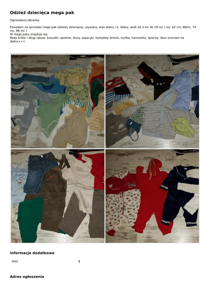 Odzież dziecięca mega pak [Sprzedam] Ubranka Posiadam na sprzedaż mega pak odzieży dziecięcej, używany, stan dobry i b. dobry, wiek od 3 mc do 19 mc ( roz. 62 cm, 68mc, 74 mc, 86 mc ). W mega paku znajduje się: Body krótki i długi rękaw, koszulki, spodnie, bluzy, pajacyki, komplety dresiki, kurtka, kamizelka, śpiochy. Stan oceniam na dobry+++ Informacje dodatkowe Ilość Adres ogłoszenia 1 http://www.kaszubskie-okazje.pl/odziez-dziecieca-mega-pak-,o475 Kontakt Mail: [email protected] Telefon: 669-590-911 Lokalizacja , Kartuzy Pomorskie (Polska) Ogłoszenie dodano: 2016-11-20 21:17:03 Ogłoszenie wygasa: 2016-12-20 21:17:03 Powered by TCPDF (www.tcpdf.org)
