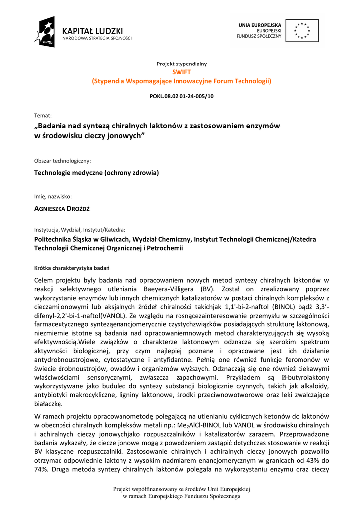Projekt stypendialny SWIFT (Stypendia Wspomagające Innowacyjne Forum Technologii) POKL.08.02.01-24-005/10 Temat: „Badania nad syntezą chiralnych laktonów z zastosowaniem enzymów w środowisku cieczy jonowych” Obszar technologiczny: Technologie medyczne (ochrony zdrowia) Imię, nazwisko: AGNIESZKA DROŻDŻ Instytucja, Wydział, Instytut/Katedra: Politechnika Śląska w Gliwicach, Wydział Chemiczny, Instytut Technologii Chemicznej/Katedra Technologii Chemicznej Organicznej i Petrochemii Krótka charakterystyka badań Celem projektu były badania nad opracowaniem nowych metod syntezy chiralnych laktonów w reakcji selektywnego utleniania Baeyera-Villigera (BV). Został on zrealizowany poprzez wykorzystanie enzymów lub innych chemicznych katalizatorów w postaci chiralnych kompleksów z cieczamijonowymi lub aksjalnych źródeł chiralności takichjak 1,1'-bi-2-naftol (BINOL) bądź 3,3’difenyl-2,2'-bi-1-naftol(VANOL). Ze względu na rosnącezainteresowanie przemysłu w szczególności farmaceutycznego synteząenancjomerycznie czystychzwiązków posiadających strukturę laktonową, niezmiernie istotne są badania nad opracowaniemnowych metod charakteryzujących się wysoką efektywnością.Wiele związków o charakterze laktonowym odznacza się szerokim spektrum aktywności biologicznej, przy czym najlepiej poznane i opracowane jest ich działanie antydrobnoustrojowe, cytostatyczne i antyfidantne. Pełnią one również funkcje feromonów w świecie drobnoustrojów, owadów i organizmów wyższych. Odznaczają się one również ciekawymi właściwościami sensorycznymi, zwłaszcza zapachowymi. Przykładem są -butyrolaktony wykorzystywane jako budulec do syntezy substancji biologicznie czynnych, takich jak alkaloidy, antybiotyki makrocykliczne, ligniny laktonowe, środki przeciwnowotworowe oraz leki zwalczające białaczkę. W ramach projektu opracowanometodę polegającą na utlenianiu cyklicznych ketonów do laktonów w obecności chiralnych kompleksów metali np.: Me2AlCl-BINOL lub VANOL w środowisku chiralnych i achiralnych cieczy jonowychjako rozpuszczalników i katalizatorów zarazem. Przeprowadzone badania wykazały, że ciecze jonowe mogą z powodzeniem zastąpić dotychczas stosowanie w reakcji BV klasyczne rozpuszczalniki. Zastosowanie chiralnych i achiralnych cieczy jonowych pozwoliło otrzymać odpowiednie laktony z wysokim nadmiarem enancjomerycznym w granicach od 43% do 74%. Druga metoda syntezy chiralnych laktonów polegała na wykorzystaniu enzymu oraz cieczy Projekt współfinansowany ze środków Unii Europejskiej w ramach Europejskiego Funduszu Społecznego jonowych jako efektywnego środowiska biotransformacji. Przeprowadzono cykl badań z użyciem monooksygenazycykloheksanonowej wyizolowanej z Acinetobacter sp. Zaobserwowano, iż szybszemu utlenieniu ulega z reguły wyżej podstawiony atom węgla, a specyficzność enzymu umożliwia otrzymanie odpowiednich laktonów ze 100% enancjoselektywnością. Zastosowanie wyspecjalizowanych enzymów w reakcji utleniania BV, pozwala na uzyskanie najwyższych czystości enancjomerycznych laktonów ze wszystkich dotychczas poznanych układów katalitycznych.Trzecia zaprezentowana przeze mnie metoda syntezy laktonów polegała na chemo-enzymatycznym procesie utleniania BV. Strategia ta została opracowana w celu wygenerowania nadkwasu z odpowiedniego kwasu in situ, w reaktorze w którym prowadzony jest proces utleniania BV. Utlenianie kwasu do nadkwasu jest katalizowane za pomocą enzymu Novozyme-435. Podsumowując, przeprowadzone badania przyczyniły się do rozwoju nowych łagodnych metod utleniania, które w przyszłości mogą być wykorzystane w praktyce przemysłowej. Dzięki zastosowaniu nowych alternatywnych rozpuszczalników powyżej opisane metody można zaliczyć do przyjaznych dla środowiska. Projekt współfinansowany ze środków Unii Europejskiej w ramach Europejskiego Funduszu Społecznego