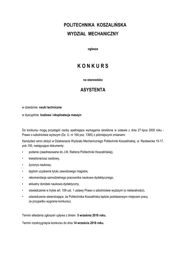 POLITECHNIKA KOSZALIŃSKA WYDZIAŁ MECHANICZNY ogłasza KONKURS na stanowisko ASYSTENTA w dziedzinie: nauki techniczne w dyscyplinie: budowa i eksploatacja maszyn Do konkursu mogą przystąpić osoby spełniające wymagania określone w ustawie z dnia 27 lipca 2005 roku Prawo o szkolnictwie wyższym (Dz. U. nr 164 poz. 1365) z późniejszymi zmianami: Kandydaci winni złożyć w Dziekanacie Wydziału Mechanicznego Politechniki Koszalińskiej, ul. Racławicka 15-17, pok.100, następujące dokumenty: • podanie (zaadresowane do J.M. Rektora Politechniki Koszalińskiej), • kwestionariusz osobowy, • życiorys naukowy, • dyplom uzyskania tytułu zawodowego magistra, • rekomendacja samodzielnego pracownika naukowo-dydaktycznego, • aktualny dorobek naukowo-dydaktyczny, • oświadczenie w trybie art. 109 ust. 1 ustawy Prawo o szkolnictwie wyższym (o niekaralności), • oświadczenie stwierdzające, że Politechnika Koszalińska będzie podstawowym miejscem pracy (w przypadku wygrania konkursu). Termin składania zgłoszeń upływa z dniem 5 września 2016 roku. Termin rozstrzygnięcia konkursu do dnia 14 września 2016 roku. FORMULARZ DLA OGŁOSZENIODAWCÓW INSTYTUCJA: Politechnika Koszalińska - Wydział Mechaniczny, Centrum Niekonwencjonalnych Technologii Hydrostrumieniowych MIASTO: Koszalin STANOWISKO: asystent DYSCYPLINA NAUKOWA: budowa i eksploatacja maszyn DATA OGŁOSZENIA: 23 sierpnia 2016 r. TERMIN SKŁADANIA OFERT: 5 września 2016 r. LINK DO STRONY: http://wm.tu.koszalin.pl/kat/324 SŁOWA KLUCZOWE: modelowanie, symulacja komputerowa, SolidWorks, hydrostrumieniowa obróbka erozyjna, zastosowania wysokociśnieniowej strugi cieczy OPIS (tematyka, oczekiwania, uwagi): Wymagania podstawowe od kandydata tytuł zawodowy magistra inżyniera w dziedzinie: nauk technicznych, dyscyplinie: budowa i eksploatacja maszyn, otwarty przewód doktorski w naukach technicznych dyscyplinie budowa i eksploatacja maszyn, doświadczenie dydaktyczne jako nauczyciel akademicki z zakresu niekonwencjonalnych technologii hydrostrumieniowych, ekologii zarządzania środowiskiem, grafiki komputerowej, udokumentowany dorobek naukowy w dyscyplinie budowa i eksploatacja maszyn. Od kandydata oczekuje się odpowiedniego przygotowania i doświadczenia w pracach badawczych i projektowych z zakresu przepływu płynów oraz obróbki erozyjnej skoncentrowanymi strumieniami energii, a zwłaszcza zastosowań wysokociśnieniowej strugi wodnej. Dodatkowym atutem będzie: wiedza w zakresie modelowania i symulacji wysokociśnieniowych przepływów cieczy, znajomość środowiska programów: SolidWorks, SolidWorks FlowSimulation, ANSYS/Workbench, AutoCAD, wiedza w zakresie dynamiki i zastosowania wysokociśnieniowej strugi wodnej o okresowo zmiennej strukturze i właściwościach, obsługa aparatury pomiarowej: ultra-szybka kamera TV typu Phantom V12.1, laserowy analizator wielkości cząstek Analysette 22Micro Tec, piezoelektryczny czujnik siły typu KISTLER 9602-AQ01, znajomość oprogramowania komputerowego: Pakiet OpenOffice, Pakiet MS Office: Word, Excel, Power Point, AutoCAD, CorelDraw, SolidWorks, SolidWorks FlowSimulation. FORM FOR EMPLOYERS INSTITUTION: Koszalin University of Technology, Faculty of Mechanical, Engineering Unconventional HydroJetting Technology Center CITY Koszalin POSITION assistant DISCIPLINE Machine Building and Exploitation POSTED 23.08.2016 r. EXPIRES 05.09.2016 r. WEBSITE http://wm.tu.koszalin.pl/kat/324 KEY WORDS modeling, computer simulation, SolidWorks, hydro-jet machining erosion, the use of high-pressure water jet DESCRIPTION (field, expectations, comments): the professional title of Master of Science in the field of: Technical Sciences, discipline: the construction and operation of machinery, open wire doctoral in technical sciences discipline construction and operation of machines, teaching experience as a university teacher in the field of unconventional hydroJetting technology, ecology, environmental management, computer graphics, documented scientific achievements in the Machinery Construction and Operation, The candidate is expected to represent adequate background and experience in research and design in the field of fluid flow as well as erosive treatment of concentrated streams of energy, especially the highpressure water jet applications. Additional advantages of candidate: knowledge in the field of modeling and simulation of high-pressure fluids flow, knowledge in the field of: SolidWorks, SolidWorks FlowSimulation, ANSYS / Workbench, AutoCAD, knowledge of the dynamics and the use of high-pressure water jet of periodically variable structure and properties, operating of measure equipment: ultra-fast TV camera Phantom V12.1, laser particle size analyzer Analysette 22Micro Tec, piezoelectric force sensor KISTLER type 9602-AQ01, knowledge of computer software: package OpenOffice, MS Office: Word, Excel, PowerPoint, AutoCAD, CorelDraw, SolidWorks, SolidWorks FlowSimulation.