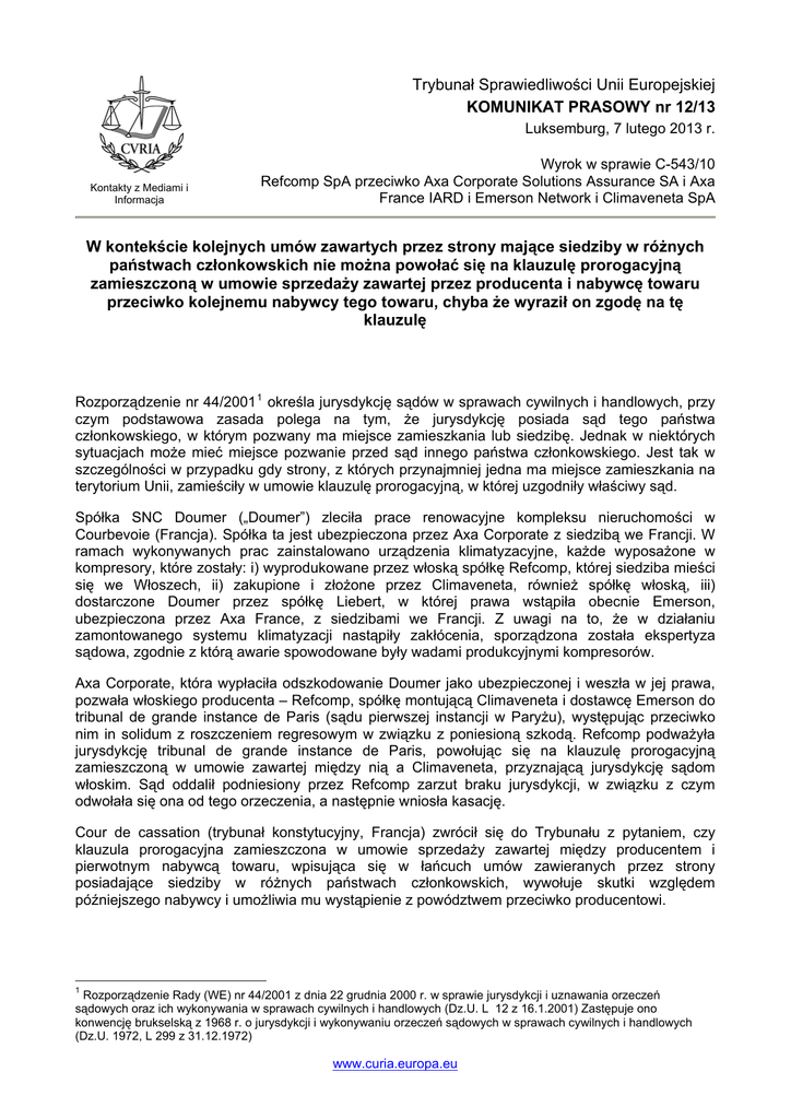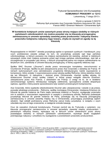 Trybunał Sprawiedliwości Unii Europejskiej KOMUNIKAT PRASOWY nr 12/13 Luksemburg, 7 lutego 2013 r. Kontakty z Mediami i Informacja Wyrok w sprawie C-543/10 Refcomp SpA przeciwko Axa Corporate Solutions Assurance SA i Axa France IARD i Emerson Network i Climaveneta SpA W kontekście kolejnych umów zawartych przez strony mające siedziby w różnych państwach członkowskich nie można powołać się na klauzulę prorogacyjną zamieszczoną w umowie sprzedaży zawartej przez producenta i nabywcę towaru przeciwko kolejnemu nabywcy tego towaru, chyba że wyraził on zgodę na tę klauzulę Rozporządzenie nr 44/2001 1 określa jurysdykcję sądów w sprawach cywilnych i handlowych, przy czym podstawowa zasada polega na tym, że jurysdykcję posiada sąd tego państwa członkowskiego, w którym pozwany ma miejsce zamieszkania lub siedzibę. Jednak w niektórych sytuacjach może mieć miejsce pozwanie przed sąd innego państwa członkowskiego. Jest tak w szczególności w przypadku gdy strony, z których przynajmniej jedna ma miejsce zamieszkania na terytorium Unii, zamieściły w umowie klauzulę prorogacyjną, w której uzgodniły właściwy sąd. Spółka SNC Doumer („Doumer”) zleciła prace renowacyjne kompleksu nieruchomości w Courbevoie (Francja). Spółka ta jest ubezpieczona przez Axa Corporate z siedzibą we Francji. W ramach wykonywanych prac zainstalowano urządzenia klimatyzacyjne, każde wyposażone w kompresory, które zostały: i) wyprodukowane przez włoską spółkę Refcomp, której siedziba mieści się we Włoszech, ii) zakupione i złożone przez Climaveneta, również spółkę włoską, iii) dostarczone Doumer przez spółkę Liebert, w której prawa wstąpiła obecnie Emerson, ubezpieczona przez Axa France, z siedzibami we Francji. Z uwagi na to, że w działaniu zamontowanego systemu klimatyzacji nastąpiły zakłócenia, sporządzona została ekspertyza sądowa, zgodnie z którą awarie spowodowane były wadami produkcyjnymi kompresorów. Axa Corporate, która wypłaciła odszkodowanie Doumer jako ubezpieczonej i weszła w jej prawa, pozwała włoskiego producenta – Refcomp, spółkę montującą Climaveneta i dostawcę Emerson do tribunal de grande instance de Paris (sądu pierwszej instancji w Paryżu), występując przeciwko nim in solidum z roszczeniem regresowym w związku z poniesioną szkodą. Refcomp podważyła jurysdykcję tribunal de grande instance de Paris, powołując się na klauzulę prorogacyjną zamieszczoną w umowie zawartej między nią a Climaveneta, przyznającą jurysdykcję sądom włoskim. Sąd oddalił podniesiony przez Refcomp zarzut braku jurysdykcji, w związku z czym odwołała się ona od tego orzeczenia, a następnie wniosła kasację. Cour de cassation (trybunał konstytucyjny, Francja) zwrócił się do Trybunału z pytaniem, czy klauzula prorogacyjna zamieszczona w umowie sprzedaży zawartej między producentem i pierwotnym nabywcą towaru, wpisująca się w łańcuch umów zawieranych przez strony posiadające siedziby w różnych państwach członkowskich, wywołuje skutki względem późniejszego nabywcy i umożliwia mu wystąpienie z powództwem przeciwko producentowi. 1 Rozporządzenie Rady (WE) nr 44/2001 z dnia 22 grudnia 2000 r. w sprawie jurysdykcji i uznawania orzeczeń sądowych oraz ich wykonywania w sprawach cywilnych i handlowych (Dz.U. L 12 z 16.1.2001) Zastępuje ono konwencję brukselską z 1968 r. o jurysdykcji i wykonywaniu orzeczeń sądowych w sprawach cywilnych i handlowych (Dz.U. 1972, L 299 z 31.12.1972) www.curia.europa.eu W dzisiejszym wyroku Trybunał stwierdził, że rozporządzenie nie precyzuje, czy klauzula prorogacyjna 2 może być przeniesiona na osobę trzecią, nie należącą do kręgu stron pierwotnej umowy, lecz będącą stroną umowy późniejszej i wstępującą w całości lub w części w prawa i obowiązki jednej ze stron pierwotnej umowy. Trybunał przypomniał, że do sądu krajowego rozpoznającego spór należy ustalenie, czy klauzula przyznająca jurysdykcję określonemu rzeczywiście została uzgodniona przez strony, gdyż sprawdzenie rzeczywistego charakteru uzgodnienia dokonanego przez zainteresowanych jednym z celów rozporządzenia. Trybunał stwierdził, że klauzula prorogacyjna zawarta w umowie co do zasady może wywoływać skutki wyłącznie w stosunkach między stronami, które zgodziły się co do zawarcia tej umowy. Wynika stąd, na klauzulę tę można powołać wobec osoby trzeciej jedynie wówczas, gdy ta osoba rzeczywiście wyraziła na to zgodę. Tak więc, w zakresie w jakim Trybunał orzekł już, że w kontekście rozporządzenia nie można przyjąć istnienia więzi umownej między późniejszym nabywcą a producentem 3 , należy wywieść stąd, że nie sposób przyjąć, by osoby te „uzgodniły”, w rozumieniu rozporządzenia, kwestię sądu wskazanego jako właściwy w umowie pierwotnej zawartej między producentem a pierwszym nabywcą Taka wykładnia rozporządzenia – która nie odsyła do krajowych systemów prawnych – zapobiega powstawaniu rozbieżnych między państwami członkowskimi rozwiązań, które mogłyby negatywnie wpłynąć na osiągnięcie celu rozporządzenia polegającego na ujednoliceniu przepisów dotyczących jurysdykcji. Takie odesłanie do prawa krajowego przyczyniałoby się także do powstania niepewności, nie do pogodzenia z troską o zagwarantowanie przewidywalności w dziedzinie jurysdykcji, która to przewidywalność jest jednym z celów rozporządzenia. W konsekwencji Trybunał orzekł, że rozporządzenie należy interpretować w ten sposób, że na klauzulę prorogacyjną zamieszczoną w umowie sprzedaży zawartej między producentem towaru i jego pierwotnym nabywcą nie można powołać się wobec osoby trzeciej będącej późniejszym nabywcą, który na zakończenie ciągu kolejnych umów przenoszących własność zawartych przez strony mające siedziby w różnych państwach członkowskich, nabył ten 