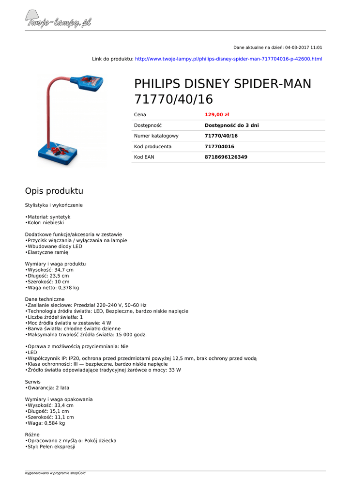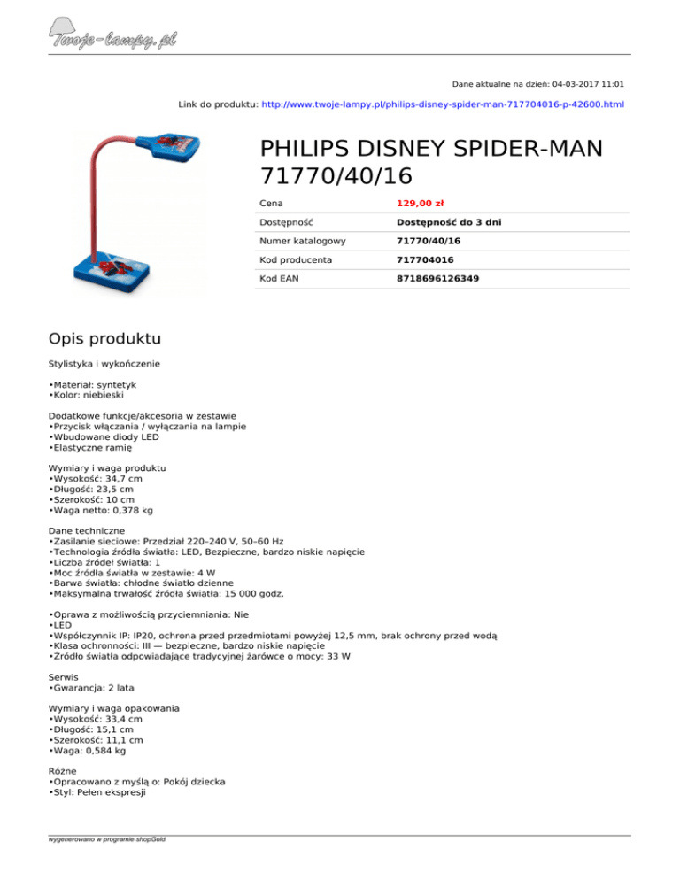 Dane aktualne na dzień: 04-03-2017 11:01 Link do produktu: http://www.twoje-lampy.pl/philips-disney-spider-man-717704016-p-42600.html PHILIPS DISNEY SPIDER-MAN 71770/40/16 Cena 129,00 zł Dostępność Dostępność do 3 dni Numer katalogowy 71770/40/16 Kod producenta 717704016 Kod EAN 8718696126349 Opis produktu Stylistyka i wykończenie •Materiał: syntetyk •Kolor: niebieski Dodatkowe funkcje/akcesoria w zestawie •Przycisk włączania / wyłączania na lampie •Wbudowane diody LED •Elastyczne ramię Wymiary i waga produktu •Wysokość: 34,7 cm •Długość: 23,5 cm •Szerokość: 10 cm •Waga netto: 0,378 kg Dane techniczne •Zasilanie sieciowe: Przedział 220–240 V, 50–60 Hz •Technologia źródła światła: LED, Bezpieczne, bardzo niskie napięcie •Liczba źródeł światła: 1 •Moc źródła światła w zestawie: 4 W •Barwa światła: chłodne światło dzienne •Maksymalna trwałość źródła światła: 15 000 godz. •Oprawa z możliwością przyciemniania: Nie •LED •Współczynnik IP: IP20, ochrona przed przedmiotami powyżej 12,5 mm, brak ochrony przed wodą •Klasa ochronności: III — bezpieczne, bardzo niskie napięcie •Źródło światła odpowiadające tradycyjnej żarówce o mocy: 33 W Serwis •Gwarancja: 2 lata Wymiary i waga opakowania •Wysokość: 33,4 cm •Długość: 15,1 cm •Szerokość: 11,1 cm •Waga: 0,584 kg Różne •Opracowano z myślą o: Pokój dziecka •Styl: Pełen ekspresji wygenerowano w programie shopGold •Typ: Lampa biurkowa wygenerowano w programie shopGold Powered by TCPDF (www.tcpdf.org)