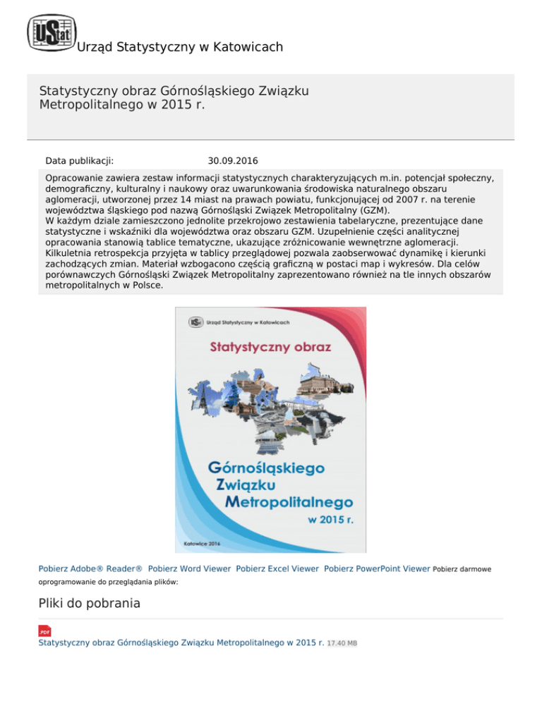 Urząd Statystyczny w Katowicach Statystyczny obraz Górnośląskiego Związku Metropolitalnego w 2015 r. Data publikacji: 30.09.2016 Opracowanie zawiera zestaw informacji statystycznych charakteryzujących m.in. potencjał społeczny, demograficzny, kulturalny i naukowy oraz uwarunkowania środowiska naturalnego obszaru aglomeracji, utworzonej przez 14 miast na prawach powiatu, funkcjonującej od 2007 r. na terenie województwa śląskiego pod nazwą Górnośląski Związek Metropolitalny (GZM). W każdym dziale zamieszczono jednolite przekrojowo zestawienia tabelaryczne, prezentujące dane statystyczne i wskaźniki dla województwa oraz obszaru GZM. Uzupełnienie części analitycznej opracowania stanowią tablice tematyczne, ukazujące zróżnicowanie wewnętrzne aglomeracji. Kilkuletnia retrospekcja przyjęta w tablicy przeglądowej pozwala zaobserwować dynamikę i kierunki zachodzących zmian. Materiał wzbogacono częścią graficzną w postaci map i wykresów. Dla celów porównawczych Górnośląski Związek Metropolitalny zaprezentowano również na tle innych obszarów metropolitalnych w Polsce. Pobierz Adobe® Reader® Pobierz Word Viewer Pobierz Excel Viewer Pobierz PowerPoint Viewer Pobierz darmowe oprogramowanie do przeglądania plików: Pliki do pobrania Statystyczny obraz Górnośląskiego Związku Metropolitalnego w 2015 r. 17.40 MB Statystyczny obraz Górnośląskiego Związku Metropolitalnego w 2015 r. - tablice 0.27 MB Archiwum 2007 GZM na tle innych potencjalnych aglomeracji 15.34 MB