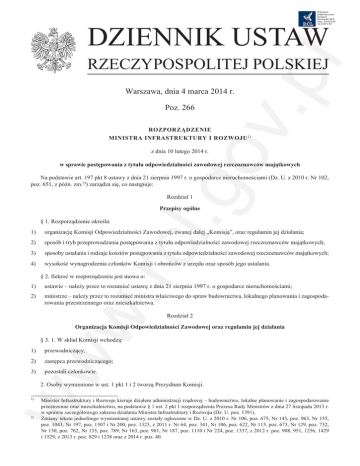 Dokument podpisany przez Grzegorz Paczowski; RCL Data: 2014.03.04 14:32:09 CET DZIENNIK USTAW v.p l RZECZYPOSPOLITEJ POLSKIEJ Warszawa, dnia 4 marca 2014 r. Poz. 266 ROZPORZĄDZENIE MINISTRA INFRASTRUKTURY I ROZWOJU 1) .go z dnia 10 lutego 2014 r. w sprawie postępowania z tytułu odpowiedzialności zawodowej rzeczoznawców majątkowych Na podstawie art. 197 pkt 8 ustawy z dnia 21 sierpnia 1997 r. o gospodarce nieruchomościami (Dz. U. z 2010 r. Nr 102, poz. 651, z późn. zm.2)) zarządza się, co następuje: Rozdział 1 Przepisy ogólne § 1. Rozporządzenie określa: organizację Komisji Odpowiedzialności Zawodowej, zwanej dalej „Komisją”, oraz regulamin jej działania; 1) w. rcl 1) 2) zastępca przewodniczącego; 3) pozostali członkowie. 2) 3) 4) sposób i tryb przeprowadzania postępowania z tytułu odpowiedzialności zawodowej rzeczoznawców majątkowych; sposoby ustalania i rodzaje kosztów postępowania z tytułu odpowiedzialności zawodowej rzeczoznawców majątkowych; wysokość wynagrodzenia członków Komisji i obrońców z urzędu oraz sposób jego ustalania. § 2. Ilekroć w rozporządzeniu jest mowa o: 1) 2) ustawie – należy przez to rozumieć ustawę z dnia 21 sierpnia 1997 r. o gospodarce nieruchomościami; ministrze – należy przez to rozumieć ministra właściwego do spraw budownictwa, lokalnego planowania i zagospodarowania przestrzennego oraz mieszkalnictwa. Rozdział 2 Organizacja Komisji Odpowiedzialności Zawodowej oraz regulamin jej działania § 3. 1. W skład Komisji wchodzą: ww przewodniczący; 2. Osoby wymienione w ust. 1 pkt 1 i 2 tworzą Prezydium Komisji. Minister Infrastruktury i Rozwoju kieruje działem administracji rządowej – budownictwo, lokalne planowanie i zagospodarowanie przestrzenne oraz mieszkalnictwo, na podstawie § 1 ust. 2 pkt 1 rozporządzenia Prezesa Rady Ministrów z dnia 27 listopada 2013 r. w sprawie szczegółowego zakresu działania Ministra Infrastruktury i Rozwoju (Dz. U. poz. 1391). 2) Zmiany tekstu jednolitego wymienionej ustawy zostały ogłoszone w Dz. U. z 2010 r. Nr 106, poz. 675, Nr 143, poz. 963, Nr 155, poz. 1043, Nr 197, poz. 1307 i Nr 200, poz. 1323, z 2011 r. Nr 64, poz. 341, Nr 106, poz. 622, Nr 115, poz. 673, Nr 129, poz. 732, Nr 130, poz. 762, Nr 135, poz. 789, Nr 163, poz. 981, Nr 187, poz. 1110 i Nr 224, poz. 1337, z 2012 r. poz. 908, 951, 1256, 1429 i 1529, z 2013 r. poz. 829 i 1238 oraz z 2014 r. poz. 40. 1) Dziennik Ustaw –2– Poz. 266 § 4. 1. Przewodniczący Komisji reprezentuje Komisję i kieruje całokształtem spraw związanych z realizacją zadań Komisji, w szczególności: odpowiada za organizację postępowań wyjaśniających oraz zapewnia sprawny i niezakłócony ich przebieg; 2) zapoznaje się z dokumentacją dotyczącą postępowań wyjaśniających; 3) prowadzi korespondencję związaną z prowadzonymi postępowaniami wyjaśniającymi; 4) przekazuje członkom Komisji informacje niezbędne dla jej działalności; 5) wyznacza i odwołuje obrońców z urzędu do poszczególnych spraw; 6) z upoważnienia ministra zwraca się do organów administracji publicznej, wymiaru sprawiedliwości oraz innych instytucji i osób o udzielenie informacji niezbędnych dla przeprowadzenia postępowań wyjaśniających; 7) rozpatruje skargi na działalność zespołów lub członków Komisji; 8) zwołuje, za zgodą ministra, posiedzenia prezydium i posiedzenia plenarne Komisji; 9) wnioskuje do ministra o przeprowadzenie szkoleń dla członków Komisji i obrońców z urzędu; .go v.p l 1) 10) przedstawia ministrowi wnioski o wypłatę wynagrodzeń dla członków Komisji i obrońców z urzędu oraz wnioski o refundację innych wydatków związanych z przeprowadzonymi postępowaniami wyjaśniającymi; 11) opracowuje orzecznictwo Komisji w celu publikacji; 12) sporządza roczne sprawozdania z działalności Komisji i przekazuje je ministrowi w terminie do dnia 31 marca roku następnego. 2. Przewodniczący Komisji może upoważnić zastępcę do wykonywania swoich zadań. w. rcl § 5. 1. Posiedzenia Prezydium Komisji zwoływane są w razie potrzeby, w celu przygotowania posiedzeń plenarnych Komisji, a także w innych sprawach niewymagających udziału wszystkich członków Komisji. 2. Posiedzenia plenarne Komisji zwołuje się w celu omówienia spraw związanych z organizacją i przebiegiem postępowań wyjaśniających, w tym problemów wynikających z prowadzonej działalności Komisji, a także w celu przeprowadzenia szkoleń członków Komisji. § 6. Nadzór nad działalnością Komisji sprawuje minister. Rozdział 3 Sposób i tryb przeprowadzania postępowania z tytułu odpowiedzialności zawodowej § 7. 1. O wszczęciu postępowania z tytułu odpowiedzialności zawodowej minister zawiadamia rzeczoznawcę majątkowego, którego postępowanie dotyczy, i przekazuje sprawę do Komisji w celu przeprowadzenia postępowania wyjaśniającego. ww 2. W przypadku, o którym mowa w art. 194 ust. 1b ustawy, o wszczęciu postępowania z tytułu odpowiedzialności zawodowej i przekazaniu sprawy do Komisji minister zawiadamia sąd. § 8. 1. Przewodniczący Komisji przygotowuje sprawę do rozpatrzenia, w tym: 1) wyznacza skład zespołu do przeprowadzenia postępowania wyjaśniającego, zwanego dalej „zespołem”, i powołuje przewodniczącego zespołu; 2) przekazuje zespołowi dotychczas zgromadzoną dokumentację sprawy; 3) wyznacza termin pierwszego posiedzenia zespołu, zawiadamiając o tym ministra, członków zespołu oraz rzeczoznawcę majątkowego, wobec którego wszczęto postępowanie. 2. Do składu zespołu wyznacza się trzy osoby, w tym przewodniczącego zespołu. 3. Do składu zespołu może być wyznaczony przewodniczący Komisji lub jego zastępca. Dziennik Ustaw –3– Poz. 266 4. Do składu zespołu nie wyznacza się członka Komisji, jeżeli postępowanie z tytułu odpowiedzialności zawodowej dotyczy: jego małżonka, krewnych i powinowatych do drugiego stopnia; 2) rzeczoznawcy majątkowego 
