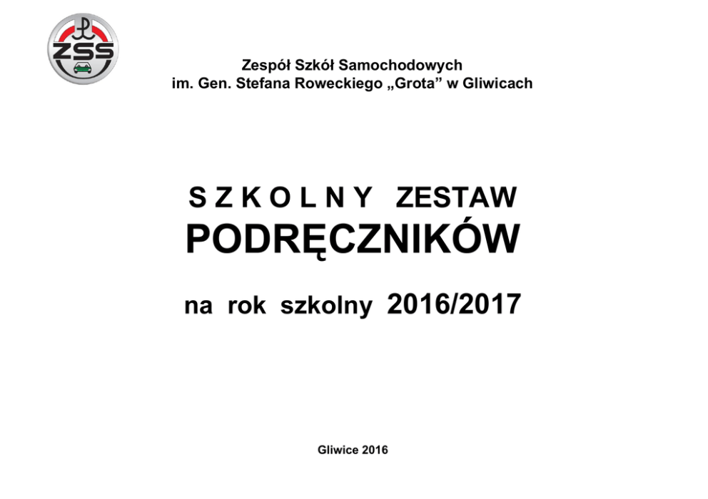 Zespół Szkół Samochodowych im. Gen. Stefana Roweckiego „Grota” w Gliwicach S Z K O L N Y ZESTAW PODRĘCZNIKÓW na rok szkolny 2016/2017 Gliwice 2016 ZESPÓŁ SZKÓŁ SAMOCHODOWYCH IM. GENERAŁA STEFANA ROWECKIEGO „GROTA” W GLIWICACH klasa nazwa przedmiotu numer Operon 444/1/2012, 444/2/2012 Język polski Język angielski Do ustalenia po teście kompetencyjnym Język niemiecki Do ustalenia po teście kompetencyjnym Wiedza o kulturze Ciekawi świata, Wiedza o kulturze A. Kisielewska, A. Kisielewski, A. Prochyra Operon Wiedza o społeczeństwie Podstawy przedsiębiorczości Historia, zakres podstawowy, B. Burda, B. Halczak, R. M. Józefiak, A. Roszak, M. Szymczak, „Odkrywamy na nowo” cz.1 Wiedza o społeczeństwie, zakres podstawowy, Z. Smutek, J. Maleska, „Odkrywamy na nowo” Podstawy przedsiębiorczości seria: Odkrywamy na nowo, J. Korba, Z. Smutek Operon 456/2012 Operon 407/2012 Operon 483/2012 Nowa Era 433/2012 Oblicza geografii zakres podstawowy, podręcznik dla szkół ponadgimnazjalnych, R. Uliszak, K. Wiedermann "Biologia na czasie"; podręcznik dla szkół ponadgimnazjalnych (zakres podstawowy); E.Bonar, W.KrzeszowiecJeleń, S. Czachorowski „To jest chemia” podręcznik dla szkół ponadgimnazjalnych, zakres podstawowy, R. Hassa, A. Mrzigod, J, Mrzigod, Nowa Era 450/2012 Nowa Era 438/2012 Fizyka Odkryć fizykę, zakres podstawowy M. Braun, W. Śliwa Nowa Era 447/2012 Matematyka Nowa Era 360/1/2011 Edukacja dla bezpieczeństwa MATEMATYKA 1. Podręcznik dla szkół ponadgimnazjalnych. Zakres podstawowy i rozszerzony, W. Babiański, L. Chańko, D.Ponczek Informatyka to podstawa, zakres podstawowy, E.Gurbiel, E. Kołczyk, H. Krupicka, G. HardtOlejniczak, M. M. Sysło Żyję i działam bezpiecznie, Jarosław Słoma Religia W blasku Bożej prawdy Podstawy konstrukcji maszyn Podstawy konstrukcji maszyn Wstęp do projektowania cz.I P. Boś. Geografia Biologia Chemia Informatyka Budowa pojazdów samochodowych Diagnozowanie i naprawa pojazdów samochodowych W S i P 544/2012 Nowa Era 426/2012 Jedność WKŁ Silniki poj. sam. M. Karczewski, L. Szczęch, G.Trawiński, Podwozia i nadwozia poj. sam. P. Fundowicz, M. Radzimirski, M. Wieczorek WSiP Diagnostyka poj. sam., M. Dąbrowski, S. Kowalczyk, G. Trawiński, Naprawa poj. sam., S. Orzechowski, S. Kowalczyk WSiP 2 wydawnictwo Język polski SERIA ODKRYWAMY NA NOWO, zakres podstawowy i rozszerzony, U. Jagiełło, R. Janicka Szyszko, M. Steblecka Jankowska, Język polski 2, SERIA ODKRYWAMY NA NOWO , zakres podstawowy i rozszerzony, R. Janicka Szyszko, M. Steblecka Jankowska Historia 1a tytuł podręcznika ZESPÓŁ SZKÓŁ SAMOCHODOWYCH IM. GENERAŁA STEFANA ROWECKIEGO „GROTA” W GLIWICACH klasa nazwa przedmiotu Język polski Język polski SERIA ODKRYWAMY NA NOWO, zakres podstawowy i rozszerzony, U. Jagiełło, R. Janicka Szyszko, M. Steblecka Jankowska, Język polski 2, SERIA ODKRYWAMY NA NOWO , zakres podstawowy i rozszerzony, R. Janicka Szyszko, M. Steblecka Jankowska numer Operon 444/1/2012, 444/2/2012 Do ustalenia po teście kompetencyjnym Język niemiecki Do ustalenia po teście kompetencyjnym Operon Historia Wiedza o społeczeństwie Podstawy przedsiębiorczości Geografia Biologia Chemia Fizyka Matematyka Informatyka Edukacja dla bezpieczeństwa Religia Podstawy konstrukcji maszyn Ciekawi świata, Wiedza o kulturze A. Kisielewska, A. Kisielewski, A. Prochyra Historia, zakres podstawowy, B. Burda, B. Halczak, R. M. Józefiak, A. Roszak, M. Szymczak, „Odkrywamy na nowo”; cz1 Wiedza o społeczeństwie, zakres podstawowy, Z. Smutek, J. Maleska, „Odkrywamy na nowo” Podstawy przedsiębiorczościseria: Odkrywamy na nowo, J. Korba, Z. Smutek Operon 456/2012 Operon 407/2012 Operon 483/2012 Nowa Era 433/2012 Oblicza geografii zakres podstawowy, podręcznik dla szkół ponadgimnazjalnych, R. Uliszak, K. Wiedermann "Biologia na czasie"; podręcznik dla szkół ponadgimnazjalnych (zakres podstawowy); E.Bonar, W.KrzeszowiecJeleń, S. Czachorowski, „To jest chemia” podręcznik dla szkół ponadgimnazjalnych, zakres podstawowy, R. Hassa, A. Mrzigod, J, Mrzigod, Nowa Era 450/2012 Nowa Era 438/2012 Odkryć fizykę, zakres podstawowy M. Braun, W. Śliwa Nowa Era 447/2012 Nowa Era 360/1/2011 MATEMATYKA 1. Podręcznik dla szkół ponadgimnazjalnych. Zakres podstawowy i rozszerzony, W. Babiański, L. Chańko, D.Ponczek Informatyka to podstawa, zakres podstawowy, E.Gurbiel, E. Kołczyk, H. Krupicka, G. HardtOlejniczak, M. M. Sysło Żyję i działam bezpiecznie ,Jarosław Słoma W blasku Bożej prawdy Podstawy konstrukcji maszyn Wstęp do projektowania cz.I P. Boś. W S i P 544/2012 Nowa Era 426/2012 Jedność WKŁ Budowa pojazdów samochodowych Silniki poj. sam. M. Karczewski, L. Szczęch, G.Trawiński, Podwozia i nadwozia poj. sam. P. Fundowicz, M. Radzimirski, M. Wieczorek WSiP Diagnozowanie i naprawa pojazdów samochodowych Diagnostyka poj. sam., M. Dąbrowski, S. Kowalczyk, G. Trawiński, Naprawa poj. sam., S. Orzechowski, S. Kowalczyk WSiP 3 wydawnictwo Język angielski Wiedza o kulturze 1b tytuł podręcznika ZESPÓŁ SZKÓŁ SAMOCHODOWYCH IM. GENERAŁA STEFANA ROWECKIEGO „GROTA” W GLIWICACH klasa nazwa przedmiotu Język angielski Język polski SERIA ODKRYWAMY NA NOWO, zakr. podst. i rozsz., U. Jagiełło, R. Janicka Szyszko, M. Steblecka Jankowska, Język polski 2, SERIA ODKRYWAMY NA NOWO , zakr. podst. i rozsz., R. Janicka Szyszko, M. Steblecka Jankowska Do ustalenia po teście kompetencyjnym Język niemiecki Do ustalenia po teście kompetencyjnym Język polski Wiedza o kulturze Ciekawi świata, Wiedza o kulturze A. Kisielewska, A. Kisielewski, A. Prochyra Historia Historia, zakres podstawowy, B. Burda, B. Halczak, R. M. Józefiak, A. Roszak, M. Szymczak, „Odkrywamy na nowo”;cz1 Wiedza o społeczeństwie Podstawy przedsiębiorczości 1l Geografia Biologia Chemia Fizyka Matematyka Informatyka Edukacja dla bezpieczeństwa Religia Podstawy konstrukcji maszyn 1l TPS 1l TML tytuł podręcznika Budowa pojazdów sam