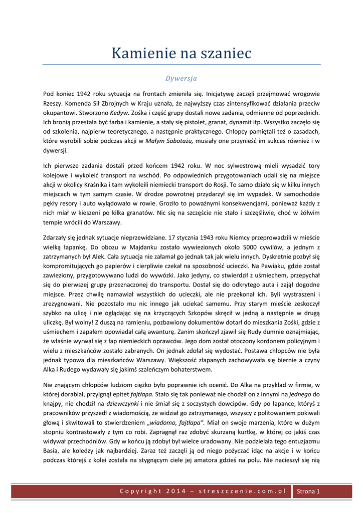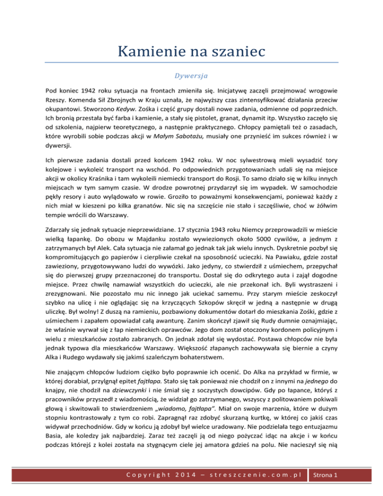 Kamienie na szaniec Dywersja Pod koniec 1942 roku sytuacja na frontach zmieniła się. Inicjatywę zaczęli przejmować wrogowie Rzeszy. Komenda Sił Zbrojnych w Kraju uznała, że najwyższy czas zintensyfikować działania przeciw okupantowi. Stworzono Kedyw. Zośka i część grupy dostali nowe zadania, odmienne od poprzednich. Ich bronią przestała być farba i kamienie, a stały się pistolet, granat, dynamit itp. Wszystko zaczęło się od szkolenia, najpierw teoretycznego, a następnie praktycznego. Chłopcy pamiętali też o zasadach, które wyrobili sobie podczas akcji w Małym Sabotażu, musiały one przynieść im sukces również i w dywersji. Ich pierwsze zadania dostali przed końcem 1942 roku. W noc sylwestrową mieli wysadzić tory kolejowe i wykoleić transport na wschód. Po odpowiednich przygotowaniach udali się na miejsce akcji w okolicy Kraśnika i tam wykoleili niemiecki transport do Rosji. To samo działo się w kilku innych miejscach w tym samym czasie. W drodze powrotnej przydarzył się im wypadek. W samochodzie pękły resory i auto wylądowało w rowie. Groziło to poważnymi konsekwencjami, ponieważ każdy z nich miał w kieszeni po kilka granatów. Nic się na szczęście nie stało i szczęśliwie, choć w żółwim tempie wrócili do Warszawy. Zdarzały się jednak sytuacje nieprzewidziane. 17 stycznia 1943 roku Niemcy przeprowadzili w mieście wielką łapankę. Do obozu w Majdanku zostało wywiezionych około 5000 cywilów, a jednym z zatrzymanych był Alek. Cała sytuacja nie załamał go jednak tak jak wielu innych. Dyskretnie pozbył się kompromitujących go papierów i cierpliwie czekał na sposobność ucieczki. Na Pawiaku, gdzie został zawieziony, przygotowywano ludzi do wywózki. Jako jedyny, co stwierdził z uśmiechem, przepychał się do pierwszej grupy przeznaczonej do transportu. Dostał się do odkrytego auta i zajął dogodne miejsce. Przez chwilę namawiał wszystkich do ucieczki, ale nie przekonał ich. Byli wystraszeni i zrezygnowani. Nie pozostało mu nic innego jak uciekać samemu. Przy starym mieście zeskoczył szybko na ulicę i nie oglądając się na krzyczących Szkopów skręcił w jedną a następnie w drugą uliczkę. Był wolny! Z duszą na ramieniu, pozbawiony dokumentów dotarł do mieszkania Zośki, gdzie z uśmiechem i zapałem opowiadał całą awanturę. Zanim skończył zjawił się Rudy dumnie oznajmiając, że właśnie wyrwał się z łap niemieckich oprawców. Jego dom został otoczony kordonem policyjnym i wielu z mieszkańców zostało zabranych. On jednak zdołał się wydostać. Postawa chłopców nie była jednak typowa dla mieszkańców Warszawy. Większość złapanych zachowywała się biernie a czyny Alka i Rudego wydawały się jakimś szaleńczym bohaterstwem. Nie znającym chłopców ludziom ciężko było poprawnie ich ocenić. Do Alka na przykład w firmie, w której dorabiał, przylgnął epitet fajtłapa. Stało się tak ponieważ nie chodził on z innymi na jednego do knajpy, nie chodził na dziewczynki i nie śmiał się z soczystych dowcipów. Gdy po łapance, któryś z pracowników przyszedł z wiadomością, że widział go zatrzymanego, wszyscy z politowaniem pokiwali głową i skwitowali to stwierdzeniem „wiadomo, fajtłapa”. Miał on swoje marzenia, które w dużym stopniu kontrastowały z tym co robi. Zapragnął raz zdobyć skurzaną kurtkę, w której co jakiś czas widywał przechodniów. Gdy w końcu ją zdobył był wielce uradowany. Nie podzielała tego entuzjazmu Basia, ale koledzy jak najbardziej. Zaraz też zaczęli ją od niego pożyczać idąc na akcje i w końcu podczas którejś z kolei została na stygnącym ciele jej amatora gdzieś na polu. Nie nacieszył się nią Copyright 2014 – streszczenie.com.pl Strona 1 długo! Rudy natomiast wraz ze zdobywaniem coraz większego doświadczenia stawał się coraz silniejszy i sprawniejszy. Objawiały się też w nim ukryte gdzieś głęboko cechy przywódcze. Jego pluton o kryptonimie SAD był najlepiej zorganizowanym i pod każdym względem wzorowym. Był z natury dobrym człowiekiem i tylko okropna wojna, którą przynieśli ze sobą najeźdźcy sprawiała, że mógł bez skrupułów zabić Niemca. Pierwszy raz zdarzyło się to podczas akcji rozbrajania ich. Któregoś wieczoru zatrzymał oficera SS na ulicy mierząc do niego z pistoletu. Ten sięgnął szybko po broń, ale zanim zdążył Rudy wypalił. Oficer padł na ulicę, a Rudy spokojnie sięgnął po jego broń i odszedł. Całym jego życiem była jego grupa i przyjaciele, z którymi mógł dyskutować na różne tematy. Głównym była przyszła Polska, a dyskusje te dotyczyły ludzi i tego jaka powinna ona być. Nie interesowała go, tak jak i innych polityka, partie i temu podobne rzeczy. Rudy pogodził się w swoim sumieniu z zabijaniem, Alek natomiast przez wiele miesięcy przeżywał to w sobie, nie mogąc tego uporządkować w swojej duszy. O wielu akcjach, udanych lub nie, przeprowadzonych przez Kedyw nie będzie tu mowy. O jednej jednak z lutego 1943 roku powiemy szerzej. Dotyczyła ona ewakuacji mieszkania przy ul. Brackiej. Należało ono do Jana Błońskiego. W zimowy wieczór kilkudziesięciu młodych ludzi i kilka aut zajechało przed dużą kamienicę i rozpoczęło się wynoszenie rzeczy. Wszyscy wchodzący i wychodzący lokatorzy byli zatrzymywani. Nie zapobiegło to jednak dekonspiracji. Najpierw w kamienicy zjawiło się dwóch granatowych policjantów. Z nimi było łatwo. Alek, stojący na straży ze swoją grupą wpuścił niczego nie spodziewających się do środka, a tam zostali szybko rozbrojeni przez ubezpieczającą grupę Rudego. Tak łatwo nie poszło z werkschutze, czyli strażą fabryczną, która zjawiła się następna. Doszło do strzelaniny, w której ranni zostali Rudy i Alek. Gdy pod kamienicę zajeżdżała ciężarówka z żandarmami było już jednak po wszystkim. Mieszkanie zostało ewakuowane. Nie był to jednak koniec 