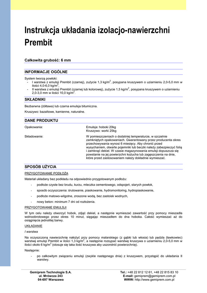 Instrukcja układania izolacjo-nawierzchni Prembit Całkowita grubość: 6 mm INFORMACJE OGÓLNE System tworzą powłoki: 2 - I warstwa z emulsji Prembit (czarnej), zużycie 1,3 kg/m , posypana kruszywem o uziarnieniu 2,0-5,0 mm w 2 ilości 4,0-6,0 kg/m , 2 - II warstwa z emulsji Prembit (czarnej lub kolorowej), zużycie 1,5 kg/m , posypana kruszywem o uziarnieniu 2 2,0-3,0 mm w ilości 10,0 kg/m . SKŁADNIKI Bezbarwna (żółtawa) lub czarna emulsja bitumiczna. Kruszywo: bazaltowe, kamienne, naturalne. DANE PRODUKTU Opakowania: Emulsja: hoboki 20kg Kruszywo: worki 25kg Składowanie: W pomieszczeniach o dodatniej temperaturze, w szczelnie zamkniętych opakowaniach. Gwarantowany przez producenta okres przechowywania wynosi 6 miesięcy. Aby chronić przed wysychaniem, otwarte pojemniki lub beczki należy zabezpieczyć folią i zamknąć dekiel. W czasie magazynowania emulsji dopuszcza się powstanie na jej powierzchni kożucha lub zagęszczenia na dnie, które przed zastosowaniem należy dokładnie wymieszać. SPOSÓB UŻYCIA PRZYGOTOWANIE PODŁOŻA Materiał układany bez podkładu na odpowiednio przygotowanym podłożu: - podłoże czyste bez brudu, kurzu, mleczka cementowego, odspojeń, starych powłok, - sposób oczyszczenia: śrutowanie, piaskowanie, hydromonitoring, hydropiaskowanie, - podłoże matowo-wilgotne, zroszone wodą, bez zastoisk wodnych, - nowy beton: minimum 7 dni od rozłożenia. PRZYGOTOWANIE EMULSJI W tym celu należy otworzyć hobok, zdjąć dekiel, a następnie wymieszać zawartość przy pomocy mieszadła wolnoobrotowego przez okres 10 minut, sięgając mieszadłem do dna hoboka. Całość wymieszać aż do osiągnięcia jednolitej barwy. UKŁADANIE I warstwa Na oczyszczoną nawierzchnię nałożyć przy pomocy malarskiego (z gąbki lub włosia) lub pędzla (ławkowiec) 2 warstwę emulsji Prembit w ilości 1,3 kg/m , a następnie rozsypać warstwę kruszywa o uziarnieniu 2,0-5,0 mm w 2 ilości około 6 kg/m (stosuje się taka ilość kruszywa aby uszorstnić powierzchnię). Następnie: - po całkowitym związaniu emulsji (zwykle następnego dnia) z kruszywem, przystąpić do układania II warstwy. Gemiprem Technologie S.A. ul. Mrówcza 243 04-697 Warszawa Tel.: +48 22 812 12 61, +48 22 815 83 10 E-mail: [email protected] WWW: http://www.gemiprem.com.pl II warstwa Nałożyć kolejną warstwę emulsji Prembit w ilości około 1,5 kg/m , upewniając się, że emulsja została rozprowadzona dokładnie i równomiernie. 2 Następnie: - wilgotną emulsję zasypać kruszywem o uziarnieniu 2,0-3,0 mm w ilości około 10 kg/m , - całość dokładnie zwalcować, - po całkowitym utwardzeniu nawierzchni (zwykle po 12 godzinach) usunąć zbędne kruszywo. 2 Aby zapewnić estetykę wykonania, linie rozgraniczające należy odciąć taśmami maskującymi, które po zakończeniu prac należy usunąć. UWAGI DO STOSOWANIA Prembit można nakładać wyłącznie przy bezdeszczowej pogodzie i średniej dobowej temperaturze nie niższej niż 10°C (w ciągu doby nie może spaść poniżej 0°C). W czasie miesięcy letnich powierzchnia nadaje się do użytku po 24-48 godzinach. Wiosną i jesienią czas schnięcia będzie odpowiednio dłuższy. BEZPIECZEŃSTWO I HIGIENA PRACY Czyszczenie: emulsję w postaci nie zaschniętej użyć wody z mydłem; zaschniętą emulsję usunąć z rąk, używając bezwodnej pasty, a z narzędzi przy pomocy benzyny ekstrakcyjnej. Prembit można nakładać bez konieczności przestrzegania specjalnych środków bezpieczeństwa. Nie zawiera rozpuszczalników oraz jest niepalny. Gemiprem Technologie S.A. ul. Mrówcza 243 04-697 Warszawa Tel.: +48 22 812 12 61, +48 22 815 83 10 E-mail: [email protected] WWW: http://www.gemiprem.com.pl