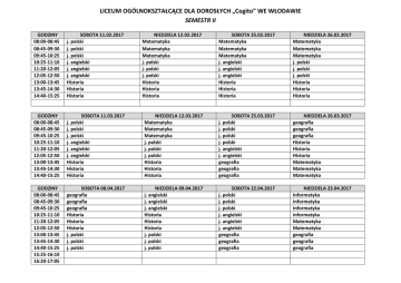 LICEUM OGÓLNOKSZTAŁCĄCE DLA DOROSŁYCH „Cogito” WE WŁODAWIE SEMESTR II GODZINY 08:00-08:45 08:45-09:30 09:45-10:25 10:25-11:10 11:20-12:05 12:05-12:50 13:00-13:45 13:45-14:30 14:40-15:25 SOBOTA 11.02.2017 j. polski j. polski j. polski j. angielski j. angielski j. angielski Historia Historia Historia NIEDZIELA 12.02.2017 Matematyka Matematyka Matematyka j. polski j. polski j. polski Historia Historia Historia SOBOTA 25.02.2017 Matematyka Matematyka Matematyka j. angielski j. angielski j. angielski Historia Historia Historia NIEDZIELA 26.02.2017 Matematyka Matematyka Matematyka j. polski j. polski j. polski Historia Historia Historia GODZINY 08:00-08:45 08:45-09:30 09:45-10:25 10:25-11:10 11:20-12:05 12:05-12:50 13:00-13:45 13:45-14:30 14:40-15:25 SOBOTA 11.03.2017 j. polski j. polski j. polski j. angielski j. angielski j. angielski Historia Historia Historia NIEDZIELA 12.03.2017 Matematyka Matematyka Matematyka j. polski j. polski j. polski Historia Historia Historia SOBOTA 25.03.2017 j. polski j. polski j. polski j. polski j. angielski j. angielski geografia geografia geografia NIEDZIELA 26.03.2017 geografia geografia geografia Historia Historia Historia Matematyka Matematyka Matematyka GODZINY 08:00-08:45 08:45-09:30 09:45-10:25 10:25-11:10 11:20-12:05 12:05-12:50 13:00-13:45 13:45-14:30 14:40-15:25 15:25-16:10 16:20-17:05 SOBOTA 08.04.2017 geografia geografia geografia Historia Historia Historia j. polski j. polski j. polski NIEDZIELA 09.04.2017 j. angielski j. angielski j. angielski Historia Historia Historia j. polski j. polski j. polski SOBOTA 22.04.2017 j. polski j. polski j. polski j. angielski j. angielski j. angielski geografia geografia geografia NIEDZIELA 23.04.2017 Informatyka Informatyka Informatyka informatyka Matematyka Matematyka geografia geografia geografia GODZINY 08:00-08:45 08:45-09:30 09:45-10:25 10:25-11:10 11:20-12:05 12:05-12:50 13:00-13:45 13:45-14:30 14:40-15:25 15:25-16:10 16:20-17:05 17:05-17:50 SOBOTA 06.05.2017 j. angielski j. angielski j. angielski j. polski j. polski j. polski Informatyka Informatyka informatyka NIEDZIELA 07.05.2017 Informatyka Informatyka informatyka Historia Historia Historia geografia geografia geografia SOBOTA 20.05.2017 Matematyka Matematyka Matematyka j. polski j. polski j. polski Informatyka Informatyka informatyka NIEDZIELA 21.05.2017 Informatyka Informatyka informatyka Historia Historia Historia geografia geografia GODZINY 08:00-08:45 08:45-09:30 09:45-10:25 10:25-11:10 11:20-12:05 12:05-12:50 13:00-13:45 13:45-14:30 14:40-15:25 15:25-16:10 16:20-17:05 SOBOTA 03.06.2017 j. polski j. polski j. polski Informatyka Informatyka NIEDZIELA 04.06.2017 Informatyka informatyka Historia Historia SOBOTA 17.06.2017 NIEDZIELA 18.06.2017