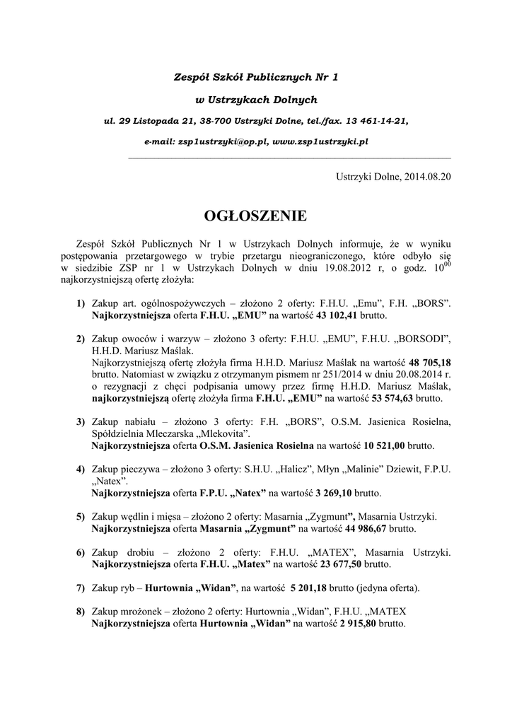 Zespół Szkół Publicznych Nr 1 w Ustrzykach Dolnych ul. 29 Listopada 21, 38-700 Ustrzyki Dolne, tel./fax. 13 461-14-21, e-mail: [email protected], www.zsp1ustrzyki.pl ___________________________________________________________________________ Ustrzyki Dolne, 2014.08.20 OGŁOSZENIE Zespół Szkół Publicznych Nr 1 w Ustrzykach Dolnych informuje, że w wyniku postępowania przetargowego w trybie przetargu nieograniczonego, które odbyło się w siedzibie ZSP nr 1 w Ustrzykach Dolnych w dniu 19.08.2012 r, o godz. 1000 najkorzystniejszą ofertę złożyła: 1) Zakup art. ogólnospożywczych – złożono 2 oferty: F.H.U. „Emu”, F.H. „BORS”. Najkorzystniejsza oferta F.H.U. „EMU” na wartość 43 102,41 brutto. 2) Zakup owoców i warzyw – złożono 3 oferty: F.H.U. „EMU”, F.H.U. „BORSODI”, H.H.D. Mariusz Maślak. Najkorzystniejszą ofertę złożyła firma H.H.D. Mariusz Maślak na wartość 48 705,18 brutto. Natomiast w związku z otrzymanym pismem nr 251/2014 w dniu 20.08.2014 r. o rezygnacji z chęci podpisania umowy przez firmę H.H.D. Mariusz Maślak, najkorzystniejszą ofertę złożyła firma F.H.U. „EMU” na wartość 53 574,63 brutto. 3) Zakup nabiału – złożono 3 oferty: F.H. „BORS”, O.S.M. Jasienica Rosielna, Spółdzielnia Mleczarska „Mlekovita”. Najkorzystniejsza oferta O.S.M. Jasienica Rosielna na wartość 10 521,00 brutto. 4) Zakup pieczywa – złożono 3 oferty: S.H.U. „Halicz”, Młyn „Malinie” Dziewit, F.P.U. „Natex”. Najkorzystniejsza oferta F.P.U. „Natex” na wartość 3 269,10 brutto. 5) Zakup wędlin i mięsa – złożono 2 oferty: Masarnia „Zygmunt”, Masarnia Ustrzyki. Najkorzystniejsza oferta Masarnia „Zygmunt” na wartość 44 986,67 brutto. 6) Zakup drobiu – złożono 2 oferty: F.H.U. „MATEX”, Masarnia Ustrzyki. Najkorzystniejsza oferta F.H.U. „Matex” na wartość 23 677,50 brutto. 7) Zakup ryb – Hurtownia „Widan”, na wartość 5 201,18 brutto (jedyna oferta). 8) Zakup mrożonek – złożono 2 oferty: Hurtownia „Widan”, F.H.U. „MATEX Najkorzystniejsza oferta Hurtownia „Widan” na wartość 2 915,80 brutto. 9) Zakup wyrobów garmażeryjnych – złożono 3 oferty: Zibi Bar „Kasyno” Zbigniew Herbut, F.P.H.U. „REDA” Zbigniew Rabicki, Pro-Concept Tomasz Orłowski. Najkorzystniejsza oferta Zibi Bar „Kasyno” Zbigniew Herbut na wartość 19 509,00 brutto. Oferentów, którzy złożyli najkorzystniejszą ofertę zapraszamy do podpisania umowy w dniu 29.08.2014 r. (piątek) o godz. 1200 do siedziby ZSP Nr 1 w Ustrzykach Dolnych ul. 29 Listopada 21 (sekretariat). Wszystkim oferentom dziękujemy za udział w postępowaniu przetargowym.