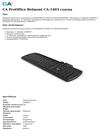 CAProOfficeBelmontCA-1403czarna Opis WygodnaklawiaturaprzewodowaCALIFORNIAACCESSCA-1403BELEMONTzklawiszamiwukładzieQWERTYi konsoląnumeryczną.11klawiszyspecjalnychułatwiającychszybkąpracę.Prostainstalacjadziękisystemowi PLUG&PLAY.KompatybilnazWindows. Opismarketingowy WygodnaklawiaturaprzewodowaCALIFORNIAACCESSCA-1403BELEMONT KlawiszewukładzieQWERTY Konsolanumeryczną 11klawiszyspecjalnychułatwiającychszybkąpracę ProstainstalacjadziękisystemowiPLUG&PLAY KompatybilnazWindows Specyfikacja EAN 5902012921203 Układ QWERTY Konsolanumeryczna tak Długośćprzewodu Waga Systemoperacyjny Windows Wymiary Kolor czarny Gwarancja 2lata Technologia Plug&Play Typklawiatury multimedialna Klawiszespecjalne 11klawiszy Interfejs USB Obudowa plastik e-mail:[email protected] ©2015-2017CaliforniaAccessWszystkieprawazastrzeżone