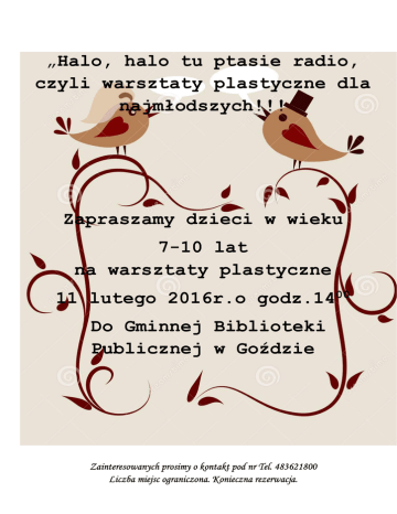 „Halo, halo tu ptasie radio, czyli warsztaty plastyczne dla najmłodszych!!! Zapraszamy dzieci w wieku 7-10 lat na warsztaty plastyczne 11 lutego 2016r.o godz.1400 Do Gminnej Biblioteki Publicznej w Goździe Zainteresowanych prosimy o kontakt pod nr Tel. 483621800 Liczba miejsc ograniczona. Konieczna rezerwacja.