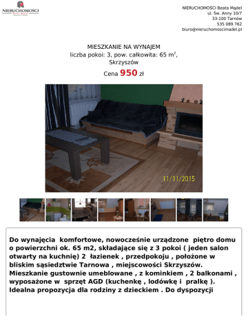 NIERUCHOMOŚCI Beata Mądel ul. Św. Anny 10/7 33-100 Tarnów 535 089 762 [email protected] MIESZKANIE NA WYNAJEM liczba pokoi: 3, pow. całkowita: 65 m2, Skrzyszów Cena 950 zł Do wynajęcia komfortowe, nowocześnie urządzone piętro domu o powierzchni ok. 65 m2, składające się z 3 pokoi ( jeden salon otwarty na kuchnię) 2 łazienek , przedpokoju , położone w bliskim sąsiedztwie Tarnowa , miejscowości Skrzyszów. Mieszkanie gustownie umeblowane , z kominkiem , 2 balkonami , wyposażone w sprzęt AGD (kuchenkę , lodówkę i pralkę ). Idealna propozycja dla rodziny z dzieckiem . Do dyspozycji NIERUCHOMOŚCI Beata Mądel ul. Św. Anny 10/7 33-100 Tarnów 535 089 762 [email protected] najemców pozostaje przylegający do budynku , ogrodzony ogródek . Ogrzewanie centralne gazowe lub kominkiem. Znakomita lokalizacja , szybki dojazd do Tarnowa. Cena najmu wynosi 950zł + media (prąd, gaz, woda). Wymagana kaucja w wysokości - 1000 zł . Cena do negocjacji . Symbol 42/MDL/OMW Typ nieruchomości MIESZKANIE Rodzaj transakcji WYNAJEM Status AKTUALNA Rodzaj rynku WTÓRNY Cena 950 PLN Cena za MIESIĄC Cena za m2 14,62 PLN Cena negocjowana TAK Dostępne do wynajmu od 20.11.2015 Kraj POLSKA Województwo MAŁOPOLSKIE Powiat tarnowski Gmina Skrzyszów Miejscowość Skrzyszów Położenie POD MIASTEM Budynki w sąsiedztwie OSIEDLE DOMÓW WIELORODZINNYCH Pow. całkowita 65,00 m2 Pow. użytkowa 65,00 m2 Forma własności działki WŁASNOŚĆ Rodzaj mieszkania PIĘTRO DOMU, 3-POKOJOWE Rodzaj budynku DOM Standard BARDZO DOBRY Typ kuchni POŁĄCZONA Z SALONEM Wyposażenie kuchni PEŁNE Liczba łazienek 2 Stan łazienki BARDZO DOBRY Droga dojazdowa LOKALNA DROGA Rodzaj nawierzchni ASFALTOWA / KOSTKA Liczba pokoi 3 Piętro 1 Liczba pięter 1 Ilość poziomów 1 Umeblowanie PEŁNE NIERUCHOMOŚCI Beata Mądel ul. Św. Anny 10/7 33-100 Tarnów 535 089 762 [email protected] Źródło c.w. GAZOWY 2-OBIEGOWY Ogrzewanie C.O. GAZOWE, KOMINEK Forma własności PEŁNA WŁASNOŚĆ Energia elektryczna JEST Podłączony gaz JEST Podłączony wodociąg JEST Podłączona kanalizacja JEST Rodzaj kanalizacji MIEJSKA Źródło wody WODA MIEJSKA Głośność okolicy UMIARKOWANIE CICHE Lodówka JEST Pralka JEST Piekarnik JEST Kuchnia gazowa JEST Rodzaj okien PLASTIKOWE Pokrycie dachu BLACHA Rodzaj podłogi PANELE, GRES Rodzaj ogrodzenia MIESZANE Ogrodzenie PEŁNE Licznik prądu JEST Wodomierz JEST Typ parkingu BETONOWY Ogródek JEST Pomieszczenie gospodarcze JEST Kominek JEST Balkon JEST Pow. balkonu 8.0000 m2 Beata Mądel właściciel biura 535089762 [email protected] Więcej ofert na stronie www.madelnieruchomosci.pl