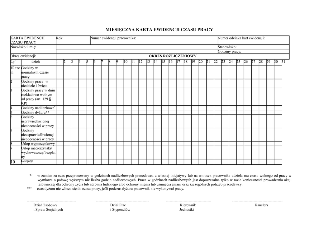 MIESIĘCZNA KARTA EWIDENCJI CZASU PRACY KARTA EWIDENCJI CZASU PRACY Nazwisko i imię: Okres ewidencji: Lp* dzień Rok: Numer ewidencji pracownika: Numer odcinka kart ewidencji: Stanowisko: Godziny pracy: 1 2 3 4 5 6 7 8 9 OKRES ROZLICZENIOWY 10 11 12 13 14 15 16 17 18 19 20 21 22 23 24 25 26 27 28 29 30 31 1Raze Godziny w m normalnym czasie pracy 2 Godziny pracy w niedziele i święta 3 Godziny pracy w dniu rozkładowo wolnym od pracy (art. 129 § 1 KP) 4 Godziny nadliczbowe* 5 Godziny dyżuru** 6 Godziny usprawiedliwionej nieobecności w pracy 7 Godziny nieusprawiedliwionej nieobecności w pracy 8 Urlop wypoczynkowy 9 Urlop macierzyński/ wychowawczy/bezpłat ny 10 Delegacje *) **) w zamian za czas przepracowany w godzinach nadliczbowych pracodawca z własnej inicjatywy lub na wniosek pracownika udziela mu czasu wolnego od pracy w wymiarze o połowę wyższym niż liczba godzin nadliczbowych. Praca w godzinach nadliczbowych jest dopuszczalna tylko w razie konieczności prowadzenia akcji ratowniczej dla ochrony życia lub zdrowia ludzkiego albo ochrony mienia lub usunięcia awarii oraz szczególnych potrzeb pracodawcy. czas dyżuru nie wlicza się do czasu pracy, jeśli podczas dyżuru pracownik nie wykonywał pracy. --------------------------------------Dział Osobowy i Spraw Socjalnych -----------------------------------------Dział Płac i Stypendiów -----------------------------------Kierownik Jednostki ---------------------------------------Kanclerz