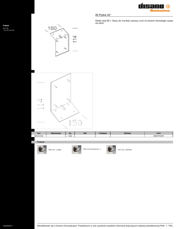 85 Plytka 45° Płytka (kąt 85°). Służy do montażu oprawy Lord na ścianie równolegle szybą do ziemi. Pobierz DXF 2D - acc_85_lord.dxf Kod Okablowanie 991210-00 Kg Wat Podstawa Źarówka Kolor GRAFITOWY 0,62 Products - 1560 Lord - z siatką 04/03/2017 - 1560 Lord asymetryczny - z - 1757 Lord - LED Bulb Skontaktować się z Centrum Konsultacyjno- Projektowym w celu uzyskania wszelkich informacji dotyczących instalacji oświetleniowej. PAG 1 - POL
