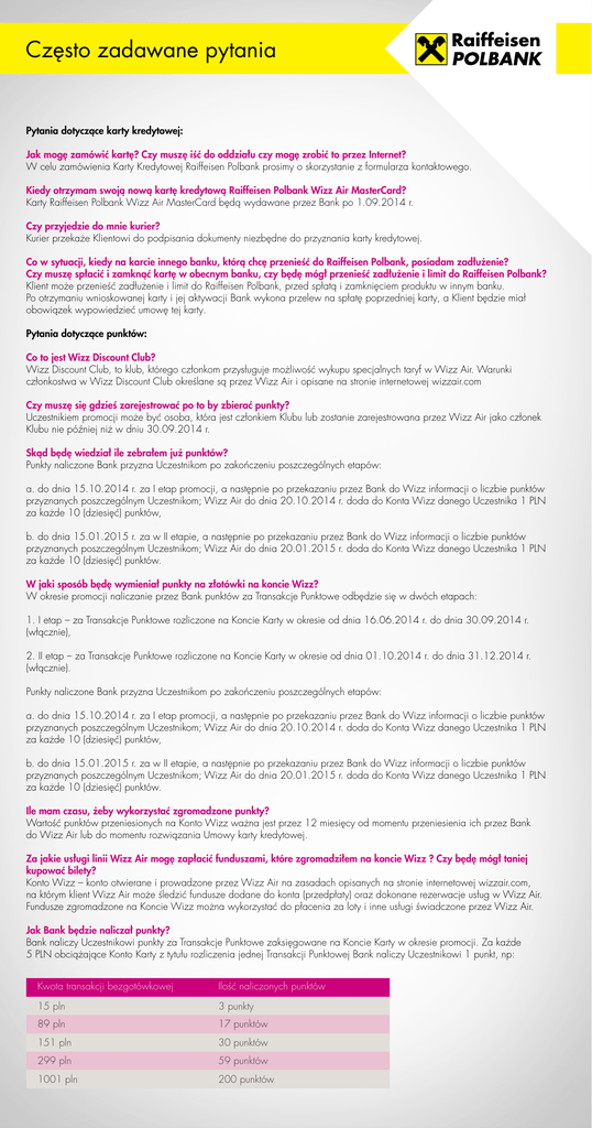 Często zadawane pytania Pytania dotyczące karty kredytowej: Jak mogę zamówić kartę? Czy muszę iść do oddziału czy mogę zrobić to przez Internet? W celu zamówienia Karty Kredytowej Raiffeisen Polbank prosimy o skorzystanie z formularza kontaktowego. Kiedy otrzymam swoją nową kartę kredytową Raiffeisen Polbank Wizz Air MasterCard? Karty Raiffeisen Polbank Wizz Air MasterCard będą wydawane przez Bank po 1.09.2014 r. Czy przyjedzie do mnie kurier? Kurier przekaże Klientowi do podpisania dokumenty niezbędne do przyznania karty kredytowej. Co w sytuacji, kiedy na karcie innego banku, którą chcę przenieść do Raiffeisen Polbank, posiadam zadłużenie? Czy muszę spłacić i zamknąć kartę w obecnym banku, czy będę mógł przenieść zadłużenie i limit do Raiffeisen Polbank? Klient może przenieść zadłużenie i limit do Raiffeisen Polbank, przed spłatą i zamknięciem produktu w innym banku. Po otrzymaniu wnioskowanej karty i jej aktywacji Bank wykona przelew na spłatę poprzedniej karty, a Klient będzie miał obowiązek wypowiedzieć umowę tej karty. Pytania dotyczące punktów: Co to jest Wizz Discount Club? Wizz Discount Club, to klub, którego członkom przysługuje możliwość wykupu specjalnych taryf w Wizz Air. Warunki członkostwa w Wizz Discount Club określane są przez Wizz Air i opisane na stronie internetowej wizzair.com Czy muszę się gdzieś zarejestrować po to by zbierać punkty? Uczestnikiem promocji może być osoba, która jest członkiem Klubu lub zostanie zarejestrowana przez Wizz Air jako członek Klubu nie później niż w dniu 30.09.2014 r. Skąd będę wiedział ile zebrałem już punktów? Punkty naliczone Bank przyzna Uczestnikom po zakończeniu poszczególnych etapów: a. do dnia 15.10.2014 r. za I etap promocji, a następnie po przekazaniu przez Bank do Wizz informacji o liczbie punktów przyznanych poszczególnym Uczestnikom; Wizz Air do dnia 20.10.2014 r. doda do Konta Wizz danego Uczestnika 1 PLN za każde 10 (dziesięć) punktów, b. do dnia 15.01.2015 r. za w II etapie, a następnie po przekazaniu przez Bank do Wizz informacji o liczbie punktów przyznanych poszczególnym Uczestnikom; Wizz Air do dnia 20.01.2015 r. doda do Konta Wizz danego Uczestnika 1 PLN za każde 10 (dziesięć) punktów. W jaki sposób będę wymieniał punkty na złotówki na koncie Wizz? W okresie promocji naliczanie przez Bank punktów za Transakcje Punktowe odbędzie się w dwóch etapach: 1. I etap – za Transakcje Punktowe rozliczone na Koncie Karty w okresie od dnia 16.06.2014 r. do dnia 30.09.2014 r. (włącznie), 2. II etap – za Transakcje Punktowe rozliczone na Koncie Karty w okresie od dnia 01.10.2014 r. do dnia 31.12.2014 r. (włącznie). Punkty naliczone Bank przyzna Uczestnikom po zakończeniu poszczególnych etapów: a. do dnia 15.10.2014 r. za I etap promocji, a następnie po przekazaniu przez Bank do Wizz informacji o liczbie punktów przyznanych poszczególnym Uczestnikom; Wizz Air do dnia 20.10.2014 r. doda do Konta Wizz danego Uczestnika 1 PLN za każde 10 (dziesięć) punktów, b. do dnia 15.01.2015 r. za w II etapie, a następnie po przekazaniu przez Bank do Wizz informacji o liczbie punktów przyznanych poszczególnym Uczestnikom; Wizz Air do dnia 20.01.2015 r. doda do Konta Wizz danego Uczestnika 1 PLN za każde 10 (dziesięć) punktów. Ile mam czasu, żeby wykorzystać zgromadzone punkty? Wartość punktów przeniesionych na Konto Wizz ważna jest przez 12 miesięcy od momentu przeniesienia ich przez Bank do Wizz Air lub do momentu rozwiązania Umowy karty kredytowej. Za jakie usługi linii Wizz Air mogę zapłacić funduszami, które zgromadziłem na koncie Wizz ? Czy będę mógł taniej kupować bilety? Konto Wizz – konto otwierane i prowadzone przez Wizz Air na zasadach opisanych na stronie internetowej wizzair.com, na którym klient Wizz Air może śledzić fundusze dodane do konta (przedpłaty) oraz dokonane rezerwacje usług w Wizz Air. Fundusze zgromadzone na Koncie Wizz można wykorzystać do płacenia za loty i inne usługi świadczone przez Wizz Air. Jak Bank będzie naliczał punkty? Bank naliczy Uczestnikowi punkty za Transakcje Punktowe zaksięgowane na Koncie Karty w okresie promocji. Z a każde 5 PLN obciążające Konto Karty z tytułu rozliczenia jednej Transakcji Punktowej Bank naliczy Uczestnikowi 1 punkt, np: Kwota transakcji bezgotówkowej Ilość naliczonych punktów 15 pln 3 punkty 89 pln 17 punktów 151 pln 30 punktów 299 pln 59 punktów 1001 pln 200 punktów
