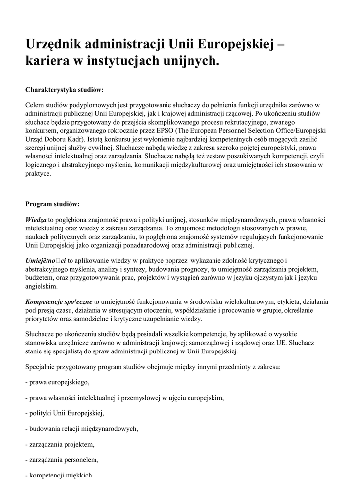 Urzędnik administracji Unii Europejskiej – kariera w instytucjach unijnych. Charakterystyka studiów: Celem studiów podyplomowych jest przygotowanie słuchaczy do pełnienia funkcji urzędnika zarówno w administracji publicznej Unii Europejskiej, jak i krajowej administracji rządowej. Po ukończeniu studiów słuchacz będzie przygotowany do przejścia skomplikowanego procesu rekrutacyjnego, zwanego konkursem, organizowanego rokrocznie przez EPSO (The European Personnel Selection Office/Europejski Urząd Doboru Kadr). Istotą konkursu jest wyłonienie najbardziej kompetentnych osób mogących zasilić szeregi unijnej służby cywilnej. Słuchacze nabędą wiedzę z zakresu szeroko pojętej europeistyki, prawa własności intelektualnej oraz zarządzania. Słuchacze nabędą też zestaw poszukiwanych kompetencji, czyli logicznego i abstrakcyjnego myślenia, komunikacji międzykulturowej oraz umiejętności ich stosowania w praktyce. Program studiów: Wiedza to pogłębiona znajomość prawa i polityki unijnej, stosunków międzynarodowych, prawa własności intelektualnej oraz wiedzy z zakresu zarządzania. To znajomość metodologii stosowanych w prawie, naukach politycznych oraz zarządzaniu, to pogłębiona znajomość systemów regulujących funkcjonowanie Unii Europejskiej jako organizacji ponadnarodowej oraz administracji publicznej. Umiejêtno ci to aplikowanie wiedzy w praktyce poprzez wykazanie zdolność krytycznego i abstrakcyjnego myślenia, analizy i syntezy, budowania prognozy, to umiejętność zarządzania projektem, budżetem, oraz przygotowywania prac, projektów i wystąpień zarówno w języku ojczystym jak i języku angielskim. Kompetencje spo³eczne to umiejętność funkcjonowania w środowisku wielokulturowym, etykieta, działania pod presją czasu, działania w stresującym otoczeniu, współdziałanie i procowanie w grupie, określanie priorytetów oraz samodzielne i krytyczne uzupełnianie wiedzy. Słuchacze po ukończeniu studiów będą posiadali wszelkie kompetencje, by aplikować o wysokie stanowiska urzędnicze zarówno w administracji krajowej; samorządowej i rządowej oraz UE. Słuchacz stanie się specjalistą do spraw administracji publicznej w Unii Europejskiej. Specjalnie przygotowany program studiów obejmuje między innymi przedmioty z zakresu: - prawa europejskiego, - prawa własności intelektualnej i przemysłowej w ujęciu europejskim, - polityki Unii Europejskiej, - budowania relacji międzynarodowych, - zarządzania projektem, - zarządzania personelem, - kompetencji miękkich. Sylwetka absolwenta: Studia adresowane są do osób zamierzających pełnić funkcję urzędnika w instytucjach unijnych bądź w unijnych agencjach. Studia przeznaczone są dla absolwentów uczelni wyższych zarówno humanistycznych i medycznych, jak i technicznych. Studia są przeznaczone także dla przyszłych urzędników administracji rządowej i samorządowej oraz dla specjalistów, którzy chcą pogłębić wiedzę w tym zakresie. Słuchacze zdobędą wiedzę, umiejętności oraz kompetencje społeczne niezbędne by ubiegać się o prestiżowe stanowisko urzędnika UE. Czas trwania: 2 semestry (od IX 2016 r. do VI 2017 r.) Termin zgłoszeń: od 1 IV do 30 IX 2015 r. Wymagane dokumenty - odpis dyplomu ukończenia studiów wyższych - wypełniony formularz zgłoszeniowy - kwestionariusz osobowy - potwierdzenie wniesienia opłaty za studia Tryb zgłoszeń: kolejność zgłoszeń. Liczba miejsc: 35 Miejsce zgłoszeń: AGH, Wydział Zarządzania ul. Gramatyka 10, 30-059 Kraków pawilon D-14, pokój 203 Osoba przyjmująca zgłoszenia: Gabriela Ślizień-Momora tel. 12 617 43 05 [email protected] Opłaty: 4900 zł Organizator studiów podyplomowych: Akademia Górniczo-Hutnicza im. Stanisława Staszica w Krakowie Wydział Zarządzania Adres organizatora: ul. Gramatyka 10 30-067 Kraków pawilon D-14, pokój 203 tel. 12 617 43 05 fax: 12 617 70 05 [email protected] www.uaue.zarz.agh.edu.pl Kierownik: dr hab. inż. Piotr Łebkowski, prof. nadzw. AGH tel. 012 617 42 02 kom. 606 995 322 Osoba do kontaktu: Gabriela Ślizień-Momora tel. 12 617 43 05 [email protected]