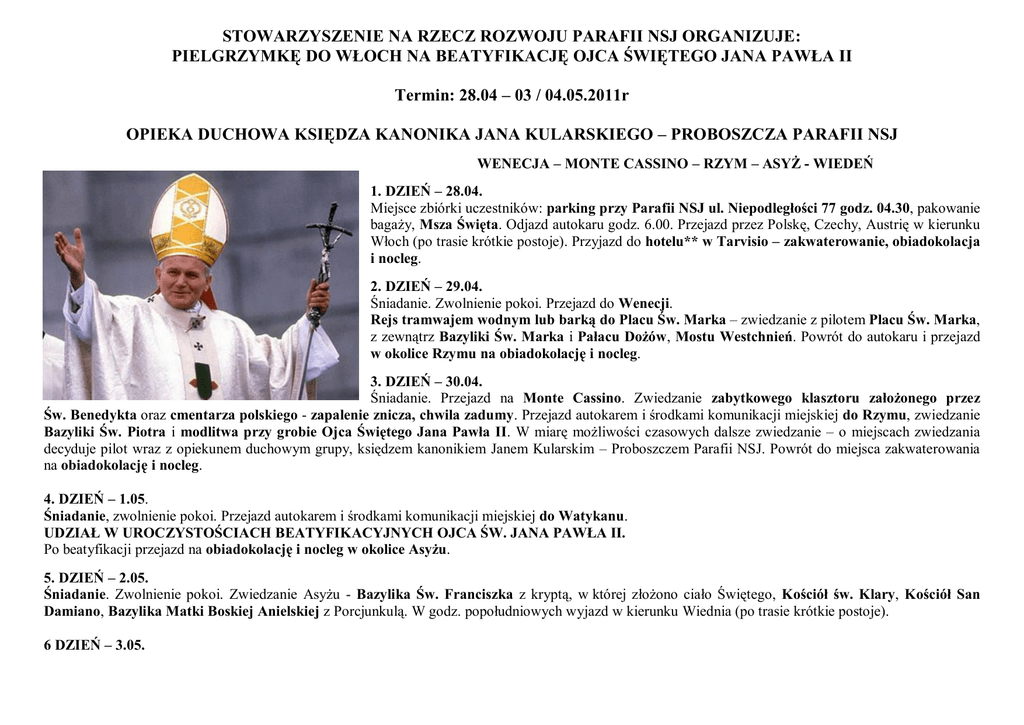 STOWARZYSZENIE NA RZECZ ROZWOJU PARAFII NSJ ORGANIZUJE: PIELGRZYMKĘ DO WŁOCH NA BEATYFIKACJĘ OJCA ŚWIĘTEGO JANA PAWŁA II Termin: 28.04 – 03 / 04.05.2011r OPIEKA DUCHOWA KSIĘDZA KANONIKA JANA KULARSKIEGO – PROBOSZCZA PARAFII NSJ WENECJA – MONTE CASSINO – RZYM – ASYŻ - WIEDEŃ 1. DZIEŃ – 28.04. Miejsce zbiórki uczestników: parking przy Parafii NSJ ul. Niepodległości 77 godz. 04.30, pakowanie bagaży, Msza Święta. Odjazd autokaru godz. 6.00. Przejazd przez Polskę, Czechy, Austrię w kierunku Włoch (po trasie krótkie postoje). Przyjazd do hotelu** w Tarvisio – zakwaterowanie, obiadokolacja i nocleg. 2. DZIEŃ – 29.04. Śniadanie. Zwolnienie pokoi. Przejazd do Wenecji. Rejs tramwajem wodnym lub barką do Placu Św. Marka – zwiedzanie z pilotem Placu Św. Marka, z zewnątrz Bazyliki Św. Marka i Pałacu Dożów, Mostu Westchnień. Powrót do autokaru i przejazd w okolice Rzymu na obiadokolację i nocleg. 3. DZIEŃ – 30.04. Śniadanie. Przejazd na Monte Cassino. Zwiedzanie zabytkowego klasztoru założonego przez Św. Benedykta oraz cmentarza polskiego - zapalenie znicza, chwila zadumy. Przejazd autokarem i środkami komunikacji miejskiej do Rzymu, zwiedzanie Bazyliki Św. Piotra i modlitwa przy grobie Ojca Świętego Jana Pawła II. W miarę możliwości czasowych dalsze zwiedzanie – o miejscach zwiedzania decyduje pilot wraz z opiekunem duchowym grupy, księdzem kanonikiem Janem Kularskim – Proboszczem Parafii NSJ. Powrót do miejsca zakwaterowania na obiadokolację i nocleg. 4. DZIEŃ – 1.05. Śniadanie, zwolnienie pokoi. Przejazd autokarem i środkami komunikacji miejskiej do Watykanu. UDZIAŁ W UROCZYSTOŚCIACH BEATYFIKACYJNYCH OJCA ŚW. JANA PAWŁA II. Po beatyfikacji przejazd na obiadokolację i nocleg w okolice Asyżu. 5. DZIEŃ – 2.05. Śniadanie. Zwolnienie pokoi. Zwiedzanie Asyżu - Bazylika Św. Franciszka z kryptą, w której złożono ciało Świętego, Kościół św. Klary, Kościół San Damiano, Bazylika Matki Boskiej Anielskiej z Porcjunkulą. W godz. popołudniowych wyjazd w kierunku Wiednia (po trasie krótkie postoje). 6 DZIEŃ – 3.05. Przyjazd do Wiednia we wczesnych godzinach rannych. Przejazd na wzgórze Kahlenberg – panorama miasta. Autokar zostaje na wzgórzu, grupa jedzie z pilotem środkami komunikacji miejskiej do centrum Wiednia. Zwiedzanie Ringstrasse (m.in. Park Miejski, Opera Wiedeńska, plac Marii Teresy, pomniki Mozarta i Straussa, Hofburg, Parlament, Ratusz, Teatr Zamkowy), spacer po starówce. W godz. popołudniowych wyjazd w kierunku Polski (po trasie krótkie postoje). 6 / 7 DZIEŃ – 03 / 04.05 Powrót do Skarżyska-Kamiennej w godzinach nocnych. Zakończenie pielgrzymki. Uwaga: Program jest ramowy - kolejność zwiedzania może ulec zmianie. Pilot nie oprowadza wewnątrz zwiedzanych obiektów i w muzeach. Cena: 886 zł + 178 € przy grupie min. 42 os. Świadczenia: 4 noclegi we Włoszech, w tym 1 nocleg w hotelu** w Tarvisio; 2 noclegi w okolicach Rzymu w miejscowości Bracciano nad jeziorkiem w 2 – pokojowych bungalowach z łazienką i aneksem kuchennym (1 pok. z łóżkiem małżeńskim, 1 pok. z 2 lub 3 łóżkami pojedynczymi); 1 nocleg w hotelu ** w okolicach Asyżu; wyżywienie: 4 śniadania i 4 obiadokolacje zgodnie z programem (napoje do obiadokolacji dodatkowo płatne); Transport autokarem klasy LUX (klimatyzacja, bar, video/dvd, wc); Opłaty drogowe (Czechy, Austria, Włochy); wjazdy do Wenecji, Rzymu i Asyżu; Ubezpieczenie Signal Iduna Polska TU S.A. - KL, KR, NWI, NWS i bagaż ( ubezpieczenie nie obejmuje kosztów leczenia chorób przewlekłych); Opieka pilota na całej trasie. Koszty programu (płatne u pilota w autokarze): Rejs barką / tramwajem wodnym do Pl. Św. Marka w Wenecji – ok. 7 € Przewodnik w Rzymie + słuchawki (opcjonalnie) – ok. 12 € Bilety komunikacji miejskiej w Rzymie 2 dni x ok. 4 euro – ok. 8 € Zwiedzanie z przewodnikiem Bazyliki Św. Franciszka w Asyżu + słuchawki – ok. 3 € Bilety komunikacji miejskiej w Wiedniu – ok. 4 € Przewodnik w Wiedniu – ok. 4 € UWAGI !!! Podróż do autobusu jako bagaż podręczny proponujemy przygotować małą poduszeczkę typu jasiek, kocyk do przykrycia, przybory toaletowe mały ręcznik, drobne monety korony czeskie i euro na toalety. Sugerowane kieszonkowe na własne wydatki to 200 KČ na ewentualny posiłek w Czechach, około 50 – 100 € na ewentualne posiłki w Rzymie i na zakup pamiątek. Informacji udzielają: Ksiądz Proboszcz Jan Kularski oraz Pani Ewa Urban tel.: 607 279 907
