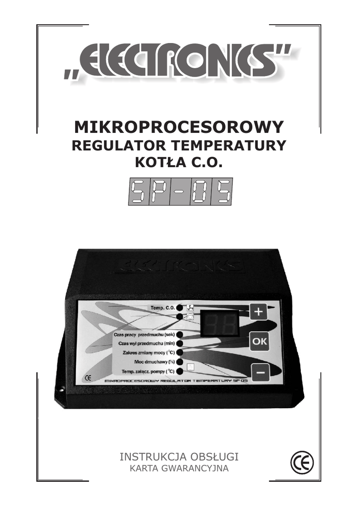 MIKROPROCESOROWY REGULATOR TEMPERATURY KOTŁA C.O. SP-05 INSTRUKCJA OBSŁUGI KARTA GWARANCYJNA Instrukcja obsługi SP-05 3 1. Opis panelu przedniego 6 1 2 7 3 5 4 Widok regulatora wraz z zaznaczonymi funkcjami 1. 2. 3. 4. 5. 6. 7. Kontrolki sygnalizacyjne. Wyświetlacz cyfrowy. Przycisk klawiatury sterujący urządzeniem (+). Przycisk klawiatury sterujący urządzeniem (–). Przycisk OK (akceptuje wybrane nastawy, umożliwia wejście do MENU nastaw). Włączenie, wyłączanie regulatora. Gniazdo bezpiecznika. 4 Instrukcja obsługi SP-05 2. Zastosowanie Głównym zastosowaniem urządzenia jest automatyczne sterowanie nadmuchem w kotle C.O. i załączanie pompy obiegowej w instalacji centralnego ogrzewania. Proces sterowania realizowany jest poprzez kontrolę temperatury cieczy w kotle C.O. Regulator SP-05 umożliwia utrzymanie określonej temperatury wewnątrz budynku. Regulator posiada dwa tryby pracy: – tryb grzania – tryb podtrzymania 3. Dane techniczne 1. Zakres regulacji temperatury 350C – 800C. 2. Zakres pomiaru temperatury 00C – 990C. 3. Temperatura, przy której następuje załączenie pompy obiegowej jest płynnie regulowana w zakresie od 350C – 50C poniżej zadanej temperatury na piecu np. temperaturę na piecu ustawiamy na 600C wtedy zakres regulacji pompy wynosi od 350C – 550C. 4. Urządzenie wyposażone jest w tzw. PRZEDMUCH, który po osiągnięciu przez kocioł C.O. zadanej temperatury powoduje okresowe załączenie nadmuchu. Regulacja przedmuchu: praca 0 – 90 sek., przerwa 1 – 20min. 5. Płynna regulacja nadmuchu. 6. Możliwość wyłączenia nadmuchu poprzez wciśnięcie i przytrzymanie przycisków „OK” i „+” przez (1 sek.) oraz jednoczesne ich zwolnienie. 7. Praca przy temperaturze otoczenia 00C – 400C. 8. Automatyczne zachowanie ustawień przy zaniku napięcia zasilającego. 9. Wilgotność względna powietrza 95%. 10. Klasa izolacji I. 11. Zabezpieczenie elektryczne 3,15A. 12. Regulator wyposażony jest w funkcję zabezpieczającą kocioł przed przegrzaniem. W przypadku wzrostu temperatury powyżej 940C termostat automatycznie rozłączy obwód wentylatora. Instrukcja obsługi SP-05 5 13. Regulator posiada również funkcję zapobiegającą przedwczesnemu zamarzaniu instalacji, w przypadku spadku temperatury poniżej 60C pompa obiegowa załącza się automatycznie. 4. Użytkowanie 1. Podłączyć przewód zasilający pompę C.O. a. do zacisku „uziemienie” żyłę żółto-zieloną, b. do zacisku „N” żyłę koloru niebieskiego, c. do zacisku „L” żyłę koloru brązowego. 2. Po podłączeniu regulatora do sieci oraz podłączeniu pompy i dmuchawy regulator gotowy jest do pracy. 3. Włączenie regulatora przyciskiem (6) powoduje załączenie nadmuchu i pompy (w zależności od wcześniejszych ustawień użytkownika) w kotle C.O.. Po osiągnięciu zadanej temperatury przez kocioł, nadmuch automatycznie się wyłącza (przechodzi w tryb podtrzymania). W dowolnym momencie przyciskami (+) i (-) ustawiamy zadaną temperaturę. Po wykonaniu powyższych czynności regulator zapewnia: 1. Utrzymanie stałej ustawionej przez użytkownika temperatury kotła C.O. przez automatyczne załączanie nadmuchu na palenisko. 2. Automatyczne załączanie się pompy obiegowej C.O. 3. Samoczynne wyłączenie zasilania nadmuchu nastąpi po wyczerpaniu się zapasu opału w palenisku (pod warunkiem, że regulator podczas pracy przejdzie w tryb podtrzymania). 4. Ciągły odczyt temperatury kotła C.O. Dodatkowo na płycie czołowej umieszczone są kontrolne diody LED, które informują o pracy regulatora. 5. Ustawienia 1. Przytrzymanie dłużej przycisku (OK) przez około 2 sekundy umożliwia dostęp do MENU nastaw. Podczas programowania w MENU nastaw przycisk (OK) posiada funkcję potwierdzenia wcześniej dokonanego wyboru przyciskami (-) i (+): a. czas pracy przedmuchu wyrażany w sekundach (zakres 0 – 90 sekund), b. czas wyłączania przedmuchu wyrażany w minutach 6 Instrukcja obsługi SP-05 (zakres 1 – 60minut), c. zmiana mocy dmuchawy (zakres 00C – 50C). Jest to funkcja sterująca pracą wentylatora. Polega na procentowym zmniejszaniu jego mocy. Umożliwia nam to bardziej efektywną pracę kotła. Moc jest tym mniejsza im temperatura wody jest bliższa temperaturze zadanej na kotle np: temperatura zadana wynosi 500C zmiana mocy dmuchawy ustawiona jest na 10C, gdy temperatura osiagnie 490C wentylator zwolni o 10% (10C odpowiada za 10% obniżenia mocy dmuchawy). Wyłączenie funckji nastąpi przy ustawieniu 00C. d. moc dmuchawy wyrażona w % (zakres 30 – 99%), e. temperatura, przy której następuje załączanie się pompy obiegowej jest płynnie regulowana w zakresie od 350C – 50C poniżej zadanej temperatury na piecu np. temperaturę na piecu ustawiamy na 600C wtedy zakres regulacji pompy wynosi od 350C do 550C. UWAGA!!! Regulator należy ustawić indywidualnie w zależności od rodzaju kotła. Firma Electronics nie ponosi odpowiedzialności za nieprawidłowe ustawienie regulatora. 2. Możliwość wyłączenia nadmuchu poprzez kolejne naciśnięcie przycisków (OK) oraz (+). Przytrzymanie ich przez około 1 sekundę oraz jednoczesne puszczenie uruchamia tryb pracy bez użycia dmuchawy. Powrót do zwykłej pracy następuje poprzez naciśnięcie przycisku (OK). Wyłączenie dmuchawy sygnalizowane jest migającymi punktami na wyświetlaczu. Instrukcja obsługi SP-05 7 6. Komunikaty błędów E1– Błąd pamięci programu. E2– Uszkodzenie czujnika temperatury. E6– Wzrost temperatury powyżej 940C, błąd ten kasuje się automatycznie wtedy kiedy temperatura spadnie do 810C (umożliwia to nieprzerwaną pracę pieca oraz wypalenie się paliwa do końca). – dla powyższych błędów dmuchawa jest wyłączona a pompa C.O. pracuje. 7. Wymiana bezpiecznika Aby wymienić bezpiecznik należy odłączyć przewód zasilający z gniazda sieciowego. 8. Zalecenia instalacyjne 1. Instalowanie regulatora powierzyć osobie uprawnionej. 2. Regulator nale