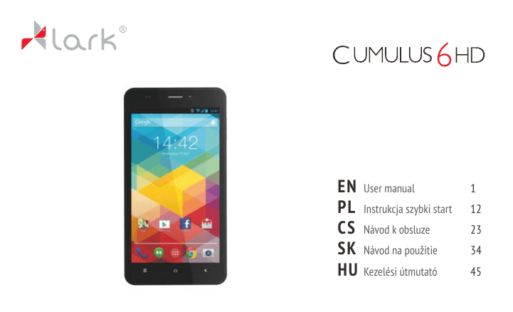 EN PL CS SK HU User manual 1 Instrukcja szybki start 12 Návod k obsluze 23 Návod na použitie 34 Kezelési útmutató 45 EN Before you begin Thank you for choosing Lark Cumulus 6HD. We wish you many satisfaction from its use. Cumulus 6HD is a multi-functional device, which can be used for work and education and for entertainment as well. Thanks to the smartphon you have the Internet always in your reach, without need of bulky personal computers of previous generation. Android 5.1 Lollipop and Google Play enable access to plenty of useful applications, for both business and entertainment purposes. Clear and intuitive interface gives you the pleasure of daily use of the smartphon. Please read the user guide and keep it for further reference. The user guide contains important information regarding safe and effective use of the Cumulus 6HD. The producer may introduce changes in the device and the user guide. Please refer to the www.lark.com.pl website in case of questions or doubts concerning use of the device. 1 Before you begin Safety and handling Prevent your device and accessories from getting wet. Getting electrical equipment wet not only causes serious damage, but it is also a threat to the user (risk of electric shock). Protect your device against shocks, falls and vibrations. Protect the device from high and low temperatures. Do not drop, bend, puncture, insert foreign objects, or place heavy objects on your device. Do not use unauthorized accessories, as the may damage the device and void manufacturer's warranty. Important safety instructions Be sure to follow instructions bellow. Make sure that they are known to all users of your device, including children.. Never use your device while driving. Hospitals and other medical facilities may be prohibited from using electronic devices, including device. Always follow these restrictions. 2 Before you begin Turn off the device in the plane for the whole flight or during take-off and landing, according to the instructions given by the aircraft personnel. Switch off the device near important electronic devices, which could be disrupted by possible interference. Do not attempt to disassemble, modify or repair the device. Always entrust these tasks to authorized specialist. Protect your device from strong magnetic fields. These fields can damage magnetic storage media. Do not use the device in very high temperatures or in areas at high risk of fire or explosion, such as petrol stations. Supervise the use of the device by children, do not let them play with the smartphone unattended. Prevent the smartphone from getting wet, for instance do not use or store it in the bathroom. The symbol to the left means that according to European Union laws and regulations your product and/or its battery shall be disposed of separately from household waste. When this product reaches its end of life, take it to a collection point designated by local authorities. The separate collection and recycling of your product and/or its battery at the time of disposal will help conserve natural resources and ensure that it is recycled in a manner that protects human health and the environment. 3 Product overview USB port Earphone jack Rear camera Speaker Proximity sensor Front Camera Flash Volume Volume Power Touch Screen Menu button Back button Mic Home button 4 Speaker Product overview How to remove the back cover 5 Product overview How to insert SIM card, microSD card and battery 4 3 1 2 6 Using your smartphone Battery charging Please charge the battery before first use. 1. Connect Smartphone to the AC charger, and the charger to AC power outlet. 2. When you charge the battery while the device is off, on the display you see the current battery charging status. AT TENTION! The battery will fully charge in around 4 hours. Using the device during charging will make charging process longer. Disconnect the ac charger from your smartfon when the battery power is full or when you wish to stop the charging. You can only use identical battery as a replacement. Physical damages to the battery may cause a fire or electric shock. 7 Using your smartphone Buttons functions Power button - press and hold for a few seconds to turn on the device Volume UP - press and hold Volume Up button to increase the volume Volume Down - press and hold Volume Down button to decrease the volume MENU button - press to enter menu HOME button - return to the main screen BACK button - return to the previous screen Powering on the device After pressing and holding the POWER button for 2 seconds the start screen will appear. 8 Troubleshooting Before taking the equipment for service be sure to check that you cannot solve the problem on your own. If you are unable to find the solution please visit www.lark.com.pl You will find a list of frequently asked questions as well as answers, service advices, system updates and technical support contact. Please contact your service provider before making decision that equipment is to be repaired. Current FAQ and important information can be found on www.lark.com.pl If you have not found a solution to the problem in the FAQ section, send e-mail: [email protected] » Unable to connect to the wireless network Make sure, that You are within the network’s service range and the signal strength is good. Check if the name of the network and password are correct. » The device is getting slightly warm This is normal during operation, while the display is turned on and during battery charging. 9 Troubleshooting » The operating system works unstable Installing too many applications and applications from unknown sources can cause system instability. Reset the device and uninstall some applications. » Blank screen, Unable to turn the device on Charge the battery. Connect your device to an AC power outlet. Restart the device. » No sound in headphones Increase the volume. Check the headphones cable connection. Check if headphone jack is not dirty. Check if the mp3 files are 