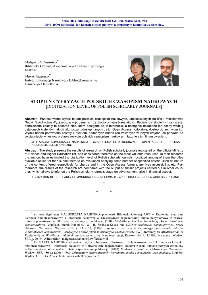 Seria III: ePublikacje Instytutu INiB UJ. Red. Maria Kocójowa Nr 6 2009: Biblioteki i ich klienci: między płatnym a bezpłatnym komunikowaniem się... Małgorzata Nahotko* Biblioteka Główna, Akademia Wychowania Fizycznego Kraków Marek Nahotko** Instytut Informacji Naukowej i Bibliotekoznawstwa Uniwersytet Jagielloński STOPIEŃ CYFRYZACJI POLSKICH CZASOPISM NAUKOWYCH [DIGITIZATION LEVEL OF POLISH SCHOLARLY JOURNALS] Abstrakt: Przedstawiono wyniki badań polskich czasopism naukowych, umieszczonych na liście Ministerstwa Nauki i Szkolnictwa Wyższego, a więc uznanych za źródła o najwyższej jakości. Badany był stopień ich cyfryzacji; odnalezione zostały te spośród nich, które dostępne są w Internecie, a następnie dokonano ich oceny według ustalonych kryteriów, takich jak: rodzaj udostępnianych treści Open Access i odpłatnie, dostęp do archiwum itp. Wyniki badań porównane zostały z efektami podobnych badań realizowanych w innych krajach, co pozwala na wyciągnięcie wniosków o etapie rozwoju polskich czasopism naukowych, łącznie z ich finansowaniem. CYFRYZACJA KOMUNIKACJI NAUKOWEJ – CZASOPISMA ELEKTRONICZNE – OPEN ACCESS – POLSKA – PUBLIKACJE ELEKTRONICZNE Abstract: The study presents the results of research on Polish scholarly journals registered on the official Ministry of Science and Higher Education list, and considered therefore as the most valuable resources. In their research the authors have estimated the digitization level of Polish scholarly journals, localized among of them the titles available online for then submit them to an evaluation applying some number of specified criteria, such as nature of the content offered respectively for charge and in the Open Access formula, archives accessibility, etc. Furthermore, the results of the research are compared with the output of similar projects carried out in other countries, which allows to infer on the Polish scholarly journals stage on advancement, also in financial aspect. DIGITIZATION OF SCHOLARLY COMMUNICATION – eJOURNALS – ePUBLICATIONS – OPEN ACCESS – POLAND * * * * St. kust. dypl. mgr MAŁGORZATA NAHOTKO, pracownik Biblioteki Głównej AWF w Krakowie. Studia na kierunku bibliotekoznawstwo i informacji naukowej w Uniwersytecie Jagiellońskim; studia podyplomowe z zakresu informacji naukowej w UJ. Dwie najważniejsze publikacje: (2004) Modyfikacja UKD w kierunku języka o słownictwie seminaturalnym (współaut. Marek Nahotko). [W:] B. Sosińska-Kalata red. UKD w środowisku komputerowym: praca zbiorowa. Warszawa: Wydaw. SBP, s. 111–130; (1998) Współpraca w zakresie rzeczowego opracowania zbiorów w bibliotekach technicznych – tradycyjne i nowe języki informacyjno-wyszukiwawcze. [W:] Materiały na Międzynarodową Konferencję nt. Współpraca bibliotek naukowych w zakresie automatyzacji, Kraków 16–19.11.1998. Warszawa: Wydaw. SBP, s. 90–94. Adres elektr.: [email protected] ** Dr MAREK NAHOTKO, adiunkt w Instytucie Informacji Naukowej i Bibliotekoznawstwa UJ. Studia na kierunku bibliotekoznawstwo i informacja naukowa w Uniwersytecie Jagiellońskim; doktorat z nauk humanistycznych obroniony w Uniwersytecie Wrocławskim. Dwie najważniejsze publikacje: (2007) Naukowe czasopisma elektroniczne. Warszawa: Wydaw. SBP, 180 s.; (2006). Opis dokumentów elektronicznych: teoretyczny model i możliwości jego aplikacji. Kraków: Wydaw. UJ, 193 s. Adres elektr. [email protected] 106 Seria III: ePublikacje Instytutu INiB UJ. Red. Maria Kocójowa Nr 6 2009: Biblioteki i ich klienci: między płatnym a bezpłatnym komunikowaniem się... Czasopisma naukowe na całym świecie przeżywają okres bardzo gwałtownej cyfryzacji. Od końca lat 90. ubiegłego wieku obserwujemy masowy zwrot wydawców ku czasopismom elektronicznym. Główni wydawcy czasopism, zauważywszy na rosnące znaczenie sieci globalnych i Webu, rozpoczęli od tworzenia cyfrowych wersji czasopism wydawanych wcześniej w wersji tradycyjnej. Często wersje elektroniczne w żaden sposób nie różnią się od wcześniejszych, kopiując po prostu wygląd i zawartość wersji drukowanych. Dla tego celu powstały specjalne formaty. Wydawcy zakładali, że do 1999 roku większa część czasopism naukowych dostępna już będzie w wersji elektronicznej. Te prognozy sprawdzają się: w 2005 r. około 93% czasopism z zakresu nauk ścisłych, techniki i medycyny (STM) oraz 84% z nauk humanistycznych i społecznych posiadało swoje elektroniczne odpowiedniki*, można więc powiedzieć, że wszystkie czasopisma tego typu są elektroniczne [Cox & Cox 2005, p. 21]. Nieco gorsze wyniki, wskazujące na 62% czasopism elektronicznych, pochodzą z Ulrich’s Periodicals Directory [http://www.ulrichsweb.com/ulrichsweb/]. Różnica wynika z tego, że Ulrich’s Directory przedstawia sytuację ogólnoświatową, a Cox głównie pisze o wysoko rozwiniętych krajach anglosaskich i europejskich. Również prognozy są pomyślne dla publikowania elektronicznego. Z prognozy wykonanej w British Library dla czasopism brytyjskich wynika, że do roku 2020 odsetek czasopism czysto elektronicznych wzrośnie do 60%, a 35% czasopism będzie hybrydowych (tradycyjnych z wersją elektroniczną) i 5% czasopism wyłącznie drukowanych. Wynika z tego, że 95% czasopism ma posiadać wersję cyfrową, przy czym liczba czasopism hybrydowych pozostać ma w miarę niezmienna, gwałtownie natomiast rosnąć ma liczba czasopism czysto elektronicznych (rys. 1). Rys. 1. Prognoza rozwoju czasopism elektronicznych do 2020 r. na świecie, wykonana w British Library Źródło: [Powell 2004, p. 6] Celem badań przeprowadzonych przez autorów tego artykułu było określenie sytuacji polskich czasopism naukowych i fachowych w zakresie ich cyfryzacji. Proces cyfryzacji rozumiany jest jako udostępnianie przy pomocy medium elektronicznego publikacji specjalnie i pierwotnie przygotowanej dla tego medium, w odróżnieniu od digitalizacji, polegającej na tworzeniu wersji elekt