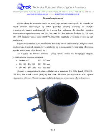 Technika Połączeń Rurociągów i Armatury Przedsiębiorstwo MAK, 92-103 Łódź, ul. Brzezińska 38, tel/fax. (0-42) 656 60 16, 656 60 17 www.mak-armatura.com.pl e-mail: [email protected] Opaski naprawcze Opaski służą do usuwania awarii na wszelkiego rodzaju rurociągach. W stosunku do innych armatur naprawczych są lekkie, posiadają znaczną tolerancję na odchyłki zewnętrznych średnic uszkodzonych rur i mogą być wykonane dla dowolnej średnicy. Standardowe długości wynoszą 100, 200, 300, 400, 500, lub 600 mm. Średnice od DN 16 do DN 1200. Produkowane ze stali 1H18N9T. Nakrętki i podkładki wykonane również ze stali nierdzewnej. Opaski wyposażone są w profilowaną uszczelkę trwale uszczelniającą miejsce awarii, produkowaną z różnych materiałów w zależności od przeznaczenia (w tym także odporne na wysoką temperaturę, oleje, kwasy, itp.). Ze względu na łatwość montażu i pracę opaski zaleca się następujące długości w zależności od średnicy rurociągu: • Do DN 100 100 - 200 mm • DN 100 – DN 300 200 - 300 mm • DN 300 – DN 1200 400 - 600 mm Opaski, w zależności od średnicy, składają się z jednej (do DN 200), dwóch (DN 250 – DN 400) lub trzech części (powyżej DN 400). Możliwe jest wykonanie inne, zgodne z życzeniem odbiorcy. Opaski mogą posiadać odgałęzienia gwintowane albo kołnierzowe. J 3.1