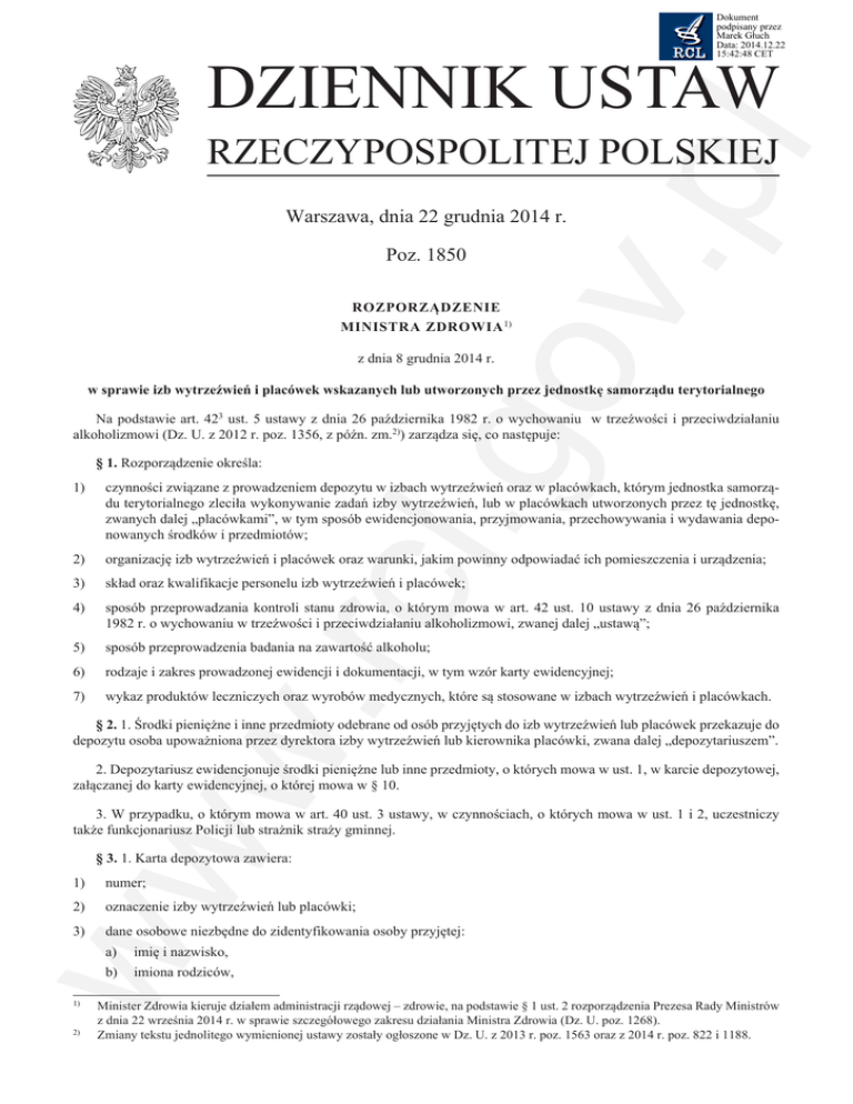 Dokument podpisany przez Marek Głuch Data: 2014.12.22 15:42:48 CET DZIENNIK USTAW v.p l RZECZYPOSPOLITEJ POLSKIEJ Warszawa, dnia 22 grudnia 2014 r. Poz. 1850 ROZPORZĄDZENIE MINISTRA ZDROWIA 1) .go z dnia 8 grudnia 2014 r. w sprawie izb wytrzeźwień i placówek wskazanych lub utworzonych przez jednostkę samorządu terytorialnego Na podstawie art. 423 ust. 5 ustawy z dnia 26 października 1982 r. o wychowaniu w trzeźwości i przeciwdziałaniu alkoholizmowi (Dz. U. z 2012 r. poz. 1356, z późn. zm.2)) zarządza się, co następuje: 1) czynności związane z prowadzeniem depozytu w izbach wytrzeźwień oraz w placówkach, którym jednostka samorządu terytorialnego zleciła wykonywanie zadań izby wytrzeźwień, lub w placówkach utworzonych przez tę jednostkę, zwanych dalej „placówkami”, w tym sposób ewidencjonowania, przyjmowania, przechowywania i wydawania deponowanych środków i przedmiotów; 2) w. rcl § 1. Rozporządzenie określa: 3) 4) 5) 6) 7) organizację izb wytrzeźwień i placówek oraz warunki, jakim powinny odpowiadać ich pomieszczenia i urządzenia; skład oraz kwalifikacje personelu izb wytrzeźwień i placówek; sposób przeprowadzania kontroli stanu zdrowia, o którym mowa w art. 42 ust. 10 ustawy z dnia 26 października 1982 r. o wychowaniu w trzeźwości i przeciwdziałaniu alkoholizmowi, zwanej dalej „ustawą”; sposób przeprowadzenia badania na zawartość alkoholu; rodzaje i zakres prowadzonej ewidencji i dokumentacji, w tym wzór karty ewidencyjnej; wykaz produktów leczniczych oraz wyrobów medycznych, które są stosowane w izbach wytrzeźwień i placówkach. § 2. 1. Środki pieniężne i inne przedmioty odebrane od osób przyjętych do izb wytrzeźwień lub placówek przekazuje do depozytu osoba upoważniona przez dyrektora izby wytrzeźwień lub kierownika placówki, zwana dalej „depozytariuszem”. 2. Depozytariusz ewidencjonuje środki pieniężne lub inne przedmioty, o których mowa w ust. 1, w karcie depozytowej, załączanej do karty ewidencyjnej, o której mowa w § 10. ww 3. W przypadku, o którym mowa w art. 40 ust. 3 ustawy, w czynnościach, o których mowa w ust. 1 i 2, uczestniczy także funkcjonariusz Policji lub strażnik straży gminnej. § 3. 1. Karta depozytowa zawiera: 1) numer; 2) oznaczenie izby wytrzeźwień lub placówki; 3) dane osobowe niezbędne do zidentyfikowania osoby przyjętej: a) imię i nazwisko, b)imiona rodziców, 1) 2) Minister Zdrowia kieruje działem administracji rządowej – zdrowie, na podstawie § 1 ust. 2 rozporządzenia Prezesa Rady Ministrów z dnia 22 września 2014 r. w sprawie szczegółowego zakresu działania Ministra Zdrowia (Dz. U. poz. 1268). Zmiany tekstu jednolitego wymienionej ustawy zostały ogłoszone w Dz. U. z 2013 r. poz. 1563 oraz z 2014 r. poz. 822 i 1188. Dziennik Ustaw –2– Poz. 1850 c) datę i miejsce urodzenia lub wiek, e) nazwę i numer dokumentu tożsamości; v.p l d) adres zamieszkania lub miejsce pobytu, 4) wykaz odebranych środków pieniężnych lub innych przedmiotów, w tym przedmiotów wartościowych, i ich opis; 5) datę sporządzenia; 6)podpis depozytariusza; 7)podpis funkcjonariusza Policji lub strażnika straży gminnej, jeżeli dotyczy. 2. W karcie depozytowej dokonuje się opisu odebranych środków pieniężnych lub innych przedmiotów wartościowych, określając ich szczególne cechy, zwłaszcza odpowiednio nazwę, nominał, rodzaj, barwę, markę i stan zużycia. W przypadku braku takich cech dokonuje się odpowiedniej adnotacji w karcie depozytowej. .go 3. Środki pieniężne lub inne przedmioty przekazane do depozytu przechowuje się w sposób gwarantujący ich bezpieczeństwo, w pomieszczeniach zabezpieczonych przed dostępem osób nieupoważnionych. Przedmioty wartościowe przechowuje się w opakowaniu trwale zamkniętym, ostemplowanym pieczęcią izby wytrzeźwień lub placówki i oznaczonym numerem karty depozytowej, albo w opakowaniu zabezpieczonym jednorazową plombą, której oznaczenie umożliwia identyfikację przedmiotu wartościowego opisanego w karcie depozytowej. Opakowanie, w którym jest przechowywany depozyt, przechowuje się w sejfie, szafie pancernej lub zamkniętych metalowych szafkach. § 4. 1. Środki pieniężne lub inne przedmioty przekazane do depozytu depozytariusz wydaje osobie zwalnianej z izby wytrzeźwień lub placówki, za pokwitowaniem odbioru, w obecności innej osoby, o której mowa w § 8 ust. 2. 1) w. rcl 2. W przypadku gdy osoba zwalniana z izby wytrzeźwień lub placówki odmawia pokwitowania odbioru środków pieniężnych lub innych przedmiotów przekazanych do depozytu, należy je wydać po odnotowaniu w karcie depozytowej przyczyny tej odmowy. 2) oświetlenie zabezpieczone przed dostępem osoby, o której mowa w ust. 1 pkt 2; 3) odporny na zniszczenie materac z materiału co najmniej trudno zapalnego; 4) zabezpieczoną przed uszkodzeniem instalację monitoringu umożliwiającą stały nadzór nad osobą, o której mowa w ust. 1 pkt 2. § 5. Osobie przyjętej do izby wytrzeźwień lub placówki zapewnia się na czas pobytu: 1) 2) odzież zastępczą, jeżeli jej odzież nie nadaje się do użytku lub jeżeli używanie tej odzieży jest niedopuszczalne ze względów higienicznych; napoje podawane w naczyniach jednorazowych. § 6. 1. W izbie wytrzeźwień lub placówce wyodrębnia się pomieszczenia dla: 1) 2) mężczyzn, kobiet oraz osób do lat 18; osób, których zachowanie stwarza poważne zagrożenie dla ich zdrowia lub życia albo zdrowia lub życia innych osób przyjętych do izby wytrzeźwień lub placówki. 2. W pomieszczeniach izby wytrzeźwień lub placówki zapewnia się bezpośredni dostęp światła dziennego, oświetlenie elektryczne oraz system przywoławczy umożliwiający, w razie potrzeby, wezwanie pracownika, o którym mowa w art. 42 ust. 10 ustawy, a pomieszczenia dla osób, o których mowa w ust. 1 pkt 2, wyposaża się dodatkowo w: ww metalowe lub drewniane drzwi, otwierające się na zewnąt