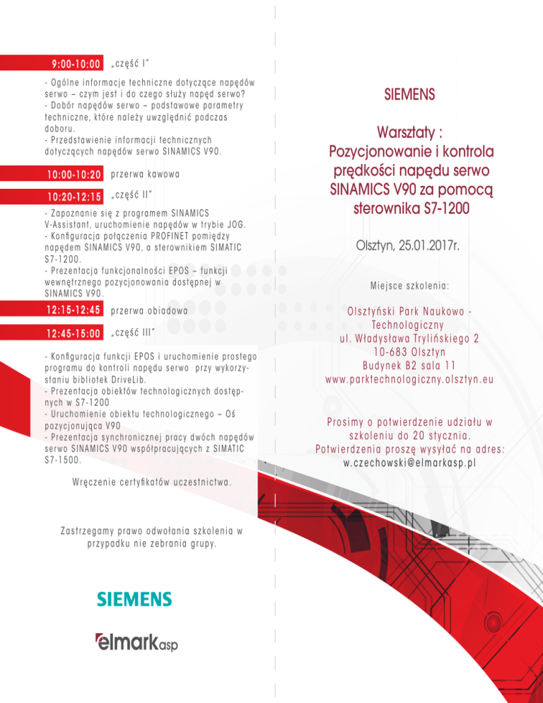 9:00-10:00 „część I” - Ogólne informacje techniczne dotyczące napędów serwo – czym jest i do czego służy napęd serwo? - Dobór napędów serwo – podstawowe parametry techniczne, które należy uwzględnić podczas doboru. - Przedstawienie informacji technicznych dotyczących napędów serwo SINAMICS V90. 10:00-10:20 przerwa kawowa 10:20-12:15 „część II” - Zapoznanie się z programem SINAMICS V- A s s i s ta n t , u r u c h o m i e n i e n a p ę d ó w w t r y b i e J O G. - K o n fi g u r a c j a p o ł ą c z e n i a P R O F I N E T p o m i ę d z y n a p ę d e m S I N A M I C S V 9 0 , a s t e r o w n i k i e m S I M AT I C S7-1200. - Prezentacja funkcjonalności EPOS – funkcji wewnętrznego pozycjonowania dostępnej w SINAMICS V90. 12:15-12:45 przerwa obiadowa 12:45-15:00 „część III” - K o n fi g u r a c j a f u n k c j i E P O S i u r u c h o m i e n i e p r o s t e g o programu do kontroli napędu serwo przy wykorzys ta n i u b i b l i o te k D r i ve L i b. - Prezentacja obiektów technologicznych dostępnych w S7-1200 - Uruchomienie obiektu technologicznego – Oś pozycjonująca V90 - Prezentacja synchronicznej pracy dwóch napędów s e r w o S I N A M I C S V 9 0 w s p ó ł p r a c u j ą c y c h z S I M AT I C S7-1500. W r ę c z e n i e c e r t y fi k a t ó w u c z e s t n i c t w a . Zastrzegamy prawo odwołania szkolenia w p r z y p a d k u n i e z e b r a n i a g r u p y. SIEMENS Warsztaty : Pozycjonowanie i kontrola prędkości napędu serwo SINAMICS V90 za pomocą sterownika S7-1200 Olsztyn, 25.01.2017r. Miejsce szkolenia: Olsztyński Park Naukowo Te c h n o l o g i c z n y u l . W ł a d y s ł a w a Tr y l i ń s k i e g o 2 10-683 Olsztyn Budynek B2 sala 11 w w w. p a r k t e c h n o l o g i c z n y. o l s z t y n . e u Prosimy o potwierdzenie udziału w szkoleniu do 20 stycznia. Potwierdzenia proszę wysyłać na adres: w. c z e c h o w s k i @ e l m a r k a s p . p l