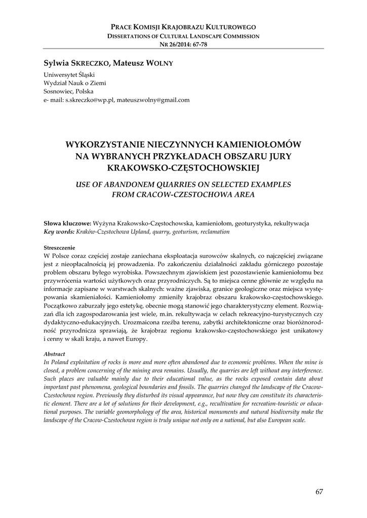 PRACE KOMISJI KRAJOBRAZU KULTUROWEGO DISSERTATIONS OF CULTURAL LANDSCAPE COMMISSION NR 26/2014: 67-78 Sylwia SKRECZKO, Mateusz WOLNY Uniwersytet Śląski Wydział Nauk o Ziemi Sosnowiec, Polska e- mail: [email protected], [email protected] WYKORZYSTANIE NIECZYNNYCH KAMIENIOŁOMÓW NA WYBRANYCH PRZYKŁADACH OBSZARU JURY KRAKOWSKO-CZĘSTOCHOWSKIEJ USE OF ABANDONEM QUARRIES ON SELECTED EXAMPLES FROM CRACOW-CZESTOCHOWA AREA Słowa kluczowe: Wyżyna Krakowsko-Częstochowska, kamieniołom, geoturystyka, rekultywacja Key words: Kraków-Częstochowa Upland, quarry, geoturism, reclamation Streszczenie W Polsce coraz częściej zostaje zaniechana eksploatacja surowców skalnych, co najczęściej związane jest z nieopłacalnością jej prowadzenia. Po zakończeniu działalności zakładu górniczego pozostaje problem obszaru byłego wyrobiska. Powszechnym zjawiskiem jest pozostawienie kamieniołomu bez przywrócenia wartości użytkowych oraz przyrodniczych. Są to miejsca cenne głównie ze względu na informacje zapisane w warstwach skalnych: ważne zjawiska, granice geologiczne oraz miejsca występowania skamieniałości. Kamieniołomy zmieniły krajobraz obszaru krakowsko-częstochowskiego. Początkowo zaburzały jego estetykę, obecnie mogą stanowić jego charakterystyczny element. Rozwiązań dla ich zagospodarowania jest wiele, m.in. rekultywacja w celach rekreacyjno-turystycznych czy dydaktyczno-edukacyjnych. Urozmaicona rzeźba terenu, zabytki architektoniczne oraz bioróżnorodność przyrodnicza sprawiają, że krajobraz regionu krakowsko-częstochowskiego jest unikatowy i cenny w skali kraju, a nawet Europy. Abstract In Poland exploitation of rocks is more and more often abandoned due to economic problems. When the mine is closed, a problem concerning of the mining area remains. Usually, the quarries are left without any interference. Such places are valuable mainly due to their educational value, as the rocks exposed contain data about important past phenomena, geological boundaries and fossils. The quarries changed the landscape of the CracowCzestochowa region. Previously they disturbed its visual appearance, but now they can constitute its characteristic element. There are a lot of solutions for their development, e.g., recultivation for recreation-touristic or educational purposes. The variable geomorphology of the area, historical monuments and natural biodiversity make the landscape of the Cracow-Czestochowa region is truly unique not only on a national, but also European scale. 67 WSTĘP Właściwe zagospodarowanie oraz wykorzystanie naturalnych walorów nieczynnych kamieniołomów jest problemem zarówno władz lokalnych jak i miłośników przyrody. Zdarza się często, że obiekty tego typu są własnością osób prywatnych lub zostały zaniedbane przez władze gminy, w której się znajdują. Stanowi to wielokrotnie problem przy czynnościach związanych z gospodarką przestrzenną terenów nieczynnych wyrobisk. Działalność eksploatacyjna wpływa w różny sposób na komponenty środowiska (Radwanek-Bąk, 2008). Skutki tego typu poczynań przybierają postać zróżnicowanych oddziaływań na krajobraz. Ich zakres i skala mogą być różne, zależne jest to od mnogości wzajemnie powiązanych czynników sprawczych oraz urozmaicenia środowiska (Radwanek-Bąk, 1999; Radwanek-Bąk, 2008). Największe przekształcenia oddziałujące na estetykę krajobrazu, związane są z początkową fazą eksploatacji, zniszczeniu ulega wtedy szata roślinna i tworzy się dysharmonijna forma wyrobiska (Bogdanowski, 1985; Chwastek, Janusz, 1992; Pietrzyk-Sokulska, 2007). Wraz z postępem wydobycia kamieniołomy stają się antropogenicznymi elementami krajobrazu, trwale w niego wpisanymi (Pietrzyk-Sokulska, 2007). Po zakończeniu eksploatacji teren wyrobiska może zostać zrekultywowany poprzez renaturalizacje, czyli dążenia do przywrócenia stanu środowiska sprzed rozpoczęcia wydobycia surowca (Radwanek-Bąk, 2008). Drugim sposobem rekultywacji jest znalezienie alternatywnego rozwiązania na wykorzystanie terenu pozostałego po wydobyciu, czyli adaptacja wyrobiska na potrzeby geoturystyczne, rekreacyjne i inne (Pietrzyk-Sokulska, 2005; Nita, 2013). Zagospodarowanie nieczynnych kamieniołomów jest tematem wielu dyskusji, często również problem ten wzbudza kontrowersje. Wielokrotnie właścicielami wyrobisk stają się osoby prywatne, niezwiązane z branżą surowców skalnych, czego skutkiem jest nieodpowiednie zagospodarowanie terenu. Celem tego opracowania jest zwrócenie uwagi na problem występujący na jednym z najbardziej atrakcyjnych regionów Polski, przedstawienie walorów omawianych obiektów oraz możliwych kierunków zagospodarowania. JURAJSKIE KAMIENIOŁOMY WYŻYNY KRAKOWSKO-CZĘSTOCHOWSKIEJ Jura Krakowsko-Częstochowska jest przykładem obszaru, na którym znajduje się wiele interesujących kamieniołomów, łomów i odsłonięć o dużym potencjale turystycznym oraz edukacyjnym (ryc. 1). Większość z odsłaniających się utworów Jury Krakowsko-Częstochowskiej stanowią skały wieku górnojurajskiego, które powstawały w ciepłym i stosunkowo płytkim zbiorniku epikontynentalnym około 160 mln lat temu. Ich miąższość na tym obszarze dochodzi do 250-300m. Są to głównie wapienie i margle odgrywające ważną rolę w przemyśle wapienniczym oraz jako kamienie budowlane i drogowe. Nieczynne kamieniołomy stanowią wyzwanie dla władz regionu. Ich duża ilość oraz indywidualność kierunku zagospodarowania była tematem rozważań wielu autorów w ostatnich latach, między innymi E. PietrzykSokulska (2005, 2008) zastosowała pojęcie „adaptacji”, jako przystosowania obszaru 68 poeksploatacyjnego do pełnienia nowych funkcji (Pietrzyk-Sokulska, 2005). Wydzieliła również kryteria adaptacji kamieniołomów biorąc pod uwagę przede wszystkim atrakcyjność, możliwości techniczne, dostępność, zapotrzebowanie społeczne oraz względy ekonomiczne (