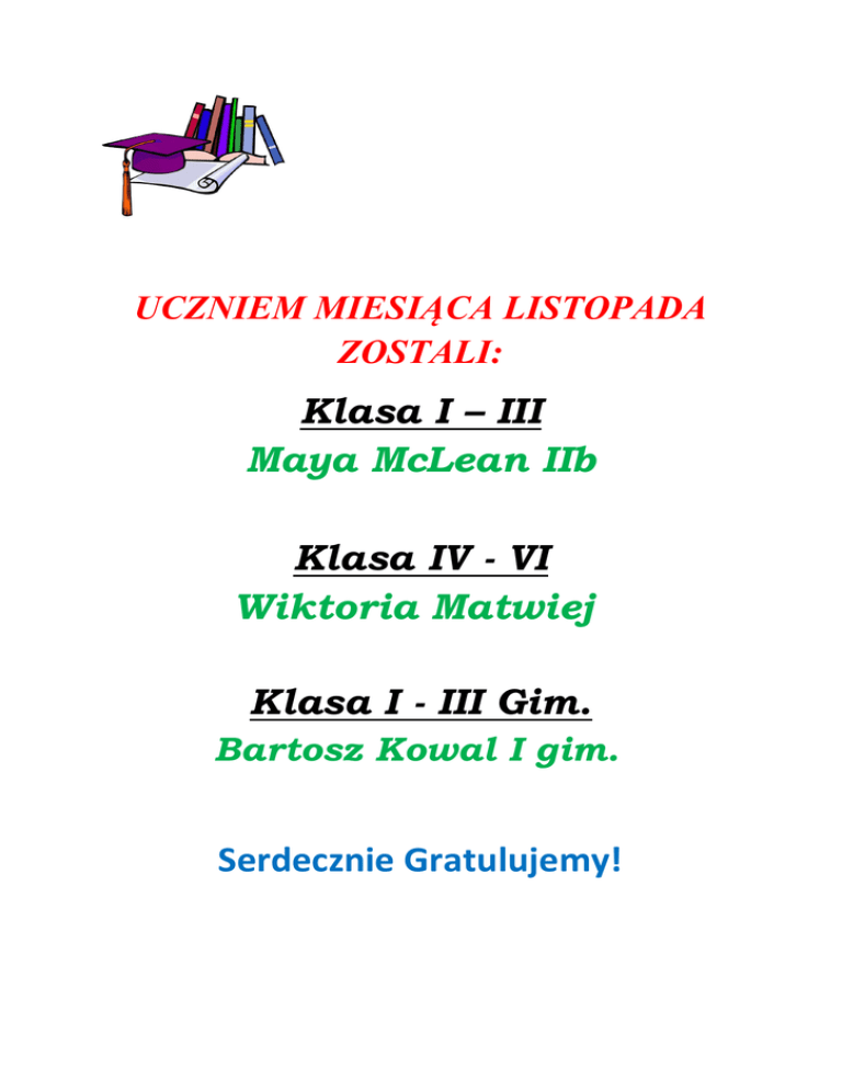 UCZNIEM MIESIĄCA LISTOPADA ZOSTALI: Klasa I – III Maya McLean IIb Klasa IV - VI Wiktoria Matwiej Klasa I - III Gim. Bartosz Kowal I gim. Serdecznie Gratulujemy!