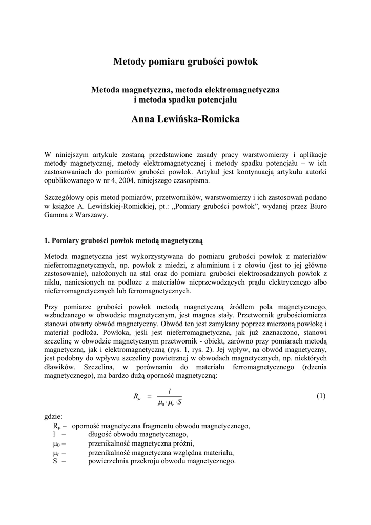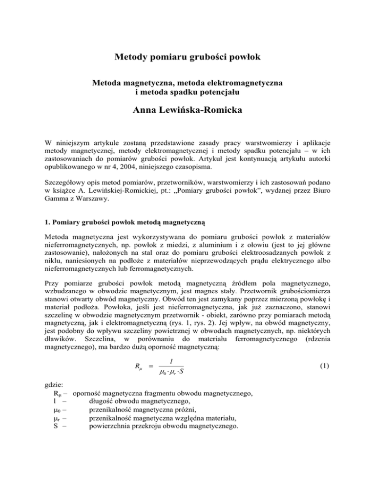 Metody pomiaru gruboĞci powáok Metoda magnetyczna, metoda elektromagnetyczna i metoda spadku potencjaáu Anna LewiĔska-Romicka W niniejszym artykule zostaną przedstawione zasady pracy warstwomierzy i aplikacje metody magnetycznej, metody elektromagnetycznej i metody spadku potencjaáu – w ich zastosowaniach do pomiarów gruboĞci powáok. Artykuá jest kontynuacją artykuáu autorki opublikowanego w nr 4, 2004, niniejszego czasopisma. Szczegóáowy opis metod pomiarów, przetworników, warstwomierzy i ich zastosowaĔ podano w ksiąĪce A. LewiĔskiej-Romickiej, pt.: „Pomiary gruboĞci powáok”, wydanej przez Biuro Gamma z Warszawy. 1. Pomiary gruboĞci powáok metodą magnetyczną Metoda magnetyczna jest wykorzystywana do pomiaru gruboĞci powáok z materiaáów nieferromagnetycznych, np. powáok z miedzi, z aluminium i z oáowiu (jest to jej gáówne zastosowanie), naáoĪonych na stal oraz do pomiaru gruboĞci elektroosadzanych powáok z niklu, naniesionych na podáoĪe z materiaáów nieprzewodzących prądu elektrycznego albo nieferromagnetycznych lub ferromagnetycznych. Przy pomiarze gruboĞci powáok metodą magnetyczną Ĩródáem pola magnetycznego, wzbudzanego w obwodzie magnetycznym, jest magnes staáy. Przetwornik gruboĞciomierza stanowi otwarty obwód magnetyczny. Obwód ten jest zamykany poprzez mierzoną powáokĊ i materiaá podáoĪa. Powáoka, jeĞli jest nieferromagnetyczna, jak juĪ zaznaczono, stanowi szczelinĊ w obwodzie magnetycznym przetwornik - obiekt, zarówno przy pomiarach metodą magnetyczną, jak i elektromagnetyczną (rys. 1, rys. 2). Jej wpáyw, na obwód magnetyczny, jest podobny do wpáywu szczeliny powietrznej w obwodach magnetycznych, np. niektórych dáawików. Szczelina, w porównaniu do materiaáu ferromagnetycznego (rdzenia magnetycznego), ma bardzo duĪą opornoĞü magnetyczną: RP l P0 Pr S gdzie: RP – opornoĞü magnetyczna fragmentu obwodu magnetycznego, l – dáugoĞü obwodu magnetycznego, przenikalnoĞü magnetyczna próĪni, P0 – przenikalnoĞü magnetyczna wzglĊdna materiaáu, Pr – S – powierzchnia przekroju obwodu magnetycznego. (1) Pomiary gruboĞci powáok metodą magnetyczną są przeprowadzane „kontaktowo”. Stosowane są warstwomierze magnetyczne mierzące siáĊ przyciągania magnetycznego. Jednak obecnie najczĊĞciej są wytwarzane warstwomierze mierzące zmiany strumienia magnetycznego (rys. 1), które mają o wiele szersze, od poprzednich, zakresy pomiarowe. Rys. 1. Ukáad przetwornik – obiekt, w zastosowaniach metody magnetycznej do pomiaru gruboĞci powáok. Przetwornik warstwomierza magnetycznego mierzącego zmiany strumienia magnetycznego) pokazano na przykáadzie pomiaru gruboĞci elektroosadzanej powáoki z niklu, naáoĪonej na podáoĪe nieprzewodzące lub na podáoĪe nieferromagnetyczne (przy pomiarach gruboĞci takich powáok podáoĪe moĪe byü równieĪ ferromagnetyczne): 1 - magnes staáy, 2 - hallotron, 3 - linie siá staáego pola magnetycznego, 4 - sygnaá wyjĞciowy U = f (g), gdzie g - gruboĞü powáoki Na podstawie materiaáów i za zgodą firmy Helmut Fischer£ GmbH + Co.KG W przetworniku warstwomierza magnetycznego (rys. 1) znajduje siĊ magnes staáy. Jest on Ĩródáem staáego pola magnetycznego, wprowadzanego do obiektu. WartoĞü wytworzonego pola zaleĪy od gruboĞci mierzonej powáoki, np. z niklu. NatĊĪenie pola magnetycznego rozproszenia (tj. pola magnetycznego w powietrzu; nad obiektem) jest mierzone z uĪyciem hallotronu. NapiĊcie Halla jest funkcją gruboĞci powáoki. W przypadku pomiaru gruboĞci powáok z metali nieferromagnetycznych, na stali, natĊĪenie pola magnetycznego jest proporcjonalne do odlegáoĞci pomiĊdzy koĔcówką sondy a podáoĪem. Zaletą metody magnetycznej jest brak zakáócającego wyniki pomiarów wpáywu prądów wirowych1, co ma szczególne znaczenie w przypadku pomiaru gruboĞci grubych powáok, wykonanych z metali nieferromagnetycznych. Sondy warstwomierzy magnetycznych mogą byü proste lub kątowe, co pozwala na dotarcie do powierzchni pomiarowej. Warstwomierze magnetyczne są przeznaczone do pomiaru gruboĞci powáok z metali nieferromagnetycznych naáoĪonych na podáoĪe stalowe. Zakres pomiaru wynosi na przykáad 1 Ze wzglĊdu na staáomagnetyczne wzbudzenie przetwornika. Prądy wirowe mogą byü wzbudzane w obiektach przewodzących prąd elektryczny jedynie przy oddziaáywaniu na nie zmiennego pola magnetycznego. od 0 do 4 mm, a dokáadnoĞü r 0,0003 mm w zakresie do 0,25 mm i < r 0,5 % dla wiĊkszych zakresów. Mogą byü teĪ mierzone gruboĞci elektrolitycznie osadzanych powáok niklu i záota (np. na záączach do ukáadów do komputerów), naniesionych na podáoĪach nieferromagnetycznych. Zakres pomiaru wynosi od 0 do 150 Pm, a dokáadnoĞü r 0,2 Pm w zakresie do 20 Pm i r 1 % dla wiĊkszych zakresów. Szczególnym ale istotnym przypadkiem są pomiary gruboĞci powáok z niklu (materiaá ferromagnetyczny) naniesionych na podáoĪu ze stali. Pomiary takie mogą byü np. wykonywane z wykorzystaniem metody magnetycznej lub metody prądów wirowych i fazoczuáej obróbki sygnaáów przetworników wiroprądowych. Przy pomiarach gruboĞci powáok z niklu na stali, metodą magnetyczną, jest konieczne zastosowanie metody nadrzĊdnej: albo metody kulometrycznej albo metody fluorescencji promieniowania X. Producenci warstwomierzy, przeznaczonych do pomiarów gruboĞci powáok z niklu na stal, dostarczają wzorce powáok niklowych. Jednak ze wzglĊdu na róĪnice wáasnoĞci elektromagnetycznych tego metalu wskazane jest wykonywanie wáasnych wzorców. Na dokáadnoĞü pomiaru gruboĞci powáok metodą magnetyczną mają wpáyw: gruboĞü powáoki, wáasnoĞci magnetyczne materiaáu podáoĪa, kierunek obróbki mechanicznej i pozostaáoĞü magnetyczna metalu podáoĪa (jeĞli jest ferromagnetyczny), gruboĞü podáoĪa (dla kaĪdego metalu podáoĪa i dla kaĪdego przyrządu okreĞlana jest tzw. gruboĞü krytyczna), efekty br