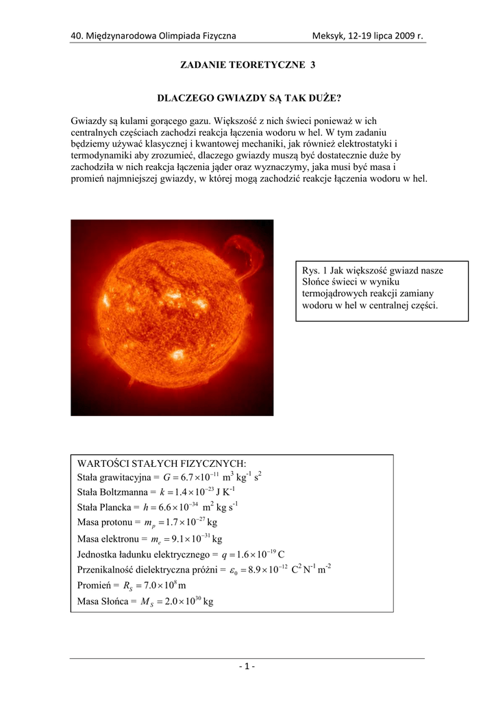 40. Międzynarodowa Olimpiada Fizyczna Meksyk, 12-19 lipca 2009 r. ZADANIE TEORETYCZNE 3 DLACZEGO GWIAZDY SĄ TAK DUŻE? Gwiazdy są kulami gorącego gazu. Większość z nich świeci ponieważ w ich centralnych częściach zachodzi reakcja łączenia wodoru w hel. W tym zadaniu będziemy używać klasycznej i kwantowej mechaniki, jak również elektrostatyki i termodynamiki aby zrozumieć, dlaczego gwiazdy muszą być dostatecznie duże by zachodziła w nich reakcja łączenia jąder oraz wyznaczymy, jaka musi być masa i promień najmniejszej gwiazdy, w której mogą zachodzić reakcje łączenia wodoru w hel. Rys. 1 Jak większość gwiazd nasze Słońce świeci w wyniku termojądrowych reakcji zamiany wodoru w hel w centralnej części. WARTOŚCI STAŁYCH FIZYCZNYCH: Stała grawitacyjna = G = 6.7 ×10 −11 m3 kg-1 s2 Stała Boltzmanna = k = 1.4 × 10 −23 J K-1 Stała Plancka = h = 6.6 × 10−34 m2 kg s-1 Masa protonu = m p = 1.7 × 10−27 kg Masa elektronu = me = 9.1 × 10 −31 kg Jednostka ładunku elektrycznego = q = 1.6 × 10 −19 C Przenikalność dielektryczna próżni = ε 0 = 8.9 × 10 −12 C2 N-1 m-2 Promień = RS = 7.0 × 108 m Masa Słońca = M S = 2.0 × 1030 kg -1- 40. Międzynarodowa Olimpiada Fizyczna Meksyk, 12-19 lipca 2009 r. 1. Klasyczne oszacowanie temperatury w środku gwiazdy. Załóżmy, że gaz tworzący gwiazdę zachowuje się jak całkowicie zjonizowany wodór (równa liczba elektronów i protonów) i że zachowuje się jak gaz doskonały. Z punktu widzenia fizyki klasycznej można argumentować, że warunkiem połączenia się dwóch protonów jest to, że muszą znaleźć się one w odległości 10 −15 m, aby silne jądrowe oddziaływania przyciągające zaczęły dominować nad odpychającymi siłami Coulomba. Załóżmy, że dwa protony, traktowane jak cząstki punktowe poruszają się naprzeciw siebie z prędkościami vrms każdy, vrms to pierwiastek ze średniego kwadratu prędkości protonów w jednowymiarowym zderzeniu centralnym. 1a 1a. Jaka musi być temperatura gazu, Tc , aby odległość najbliższego 1.5 zbliżenia protonów, d c , wynosiła 10 −15 m? Podaj tę i wszystkie inne numeryczne wartości w tym zadaniu z dokładnością do dwóch cyfr znaczących. 2. Tak oszacowana temperatura nie jest właściwa Aby stwierdzić, czy tak oszacowana temperatura jest rozsądna, należy wyznaczyć temperaturę w środku gwiazdy inną metodą. Budowa gwiazd jest skomplikowana, ale można uzyskać niezłe jej zrozumienie korzystając z przybliżeń. Gwiazdy są w stanie równowagi, to znaczy że nie zapadają się ani nie rozszerzają, ponieważ przyciągająca siła grawitacji jest zrównoważona przez odpychającą siłę pochodząca z różnicy ciśnień (patrz rys. 2). Dla warstwy gazu warunek równowagi hydrodynamicznej warstwy w odległości r od środka gwiazdy jest dany przez ∆P G M r ρr =− , ∆r r2 gdzie P jest ciśnieniem gazu, G - stałą grawitacji, M r - masą części gwiazdy wewnątrz sfery o promieniu r , a ρ r jest gęstością gazu w warstwie. Rys. 2. Gwiazdy są w równowadze hydrostatycznej, różnica ciśnień równoważy grawitację. -2- 40. Międzynarodowa Olimpiada Fizyczna Meksyk, 12-19 lipca 2009 r. Oszacowanie rzędu wielkości temperatury w środku gwiazdy może być uzyskane przez wartości wielkości fizycznych w środku i na powierzchni gwiazdy przy użyciu następujących przybliżeń: ∆ P ≈ Po − Pc , gdzie Pc i Po są ciśnieniami w środku i na powierzchni gwiazdy. Ponieważ Pc >> Po , to możemy założyć że: ∆ P ≈ − Pc . W tym samym przybliżeniu: ∆r ≈ R, gdzie R jest promieniem gwiazdy oraz Mr ≈ MR = M , gdzie M jest całkowitą masą gwiazdy. Gęstość można przybliżyć przez wartość w środku ρ r ≈ ρc . Można też założyć, że ciśnienie jest takie, jak dla gazu doskonałego. 2a Podaj równanie na temperaturę w środku gwiazdy, Tc , w którym występują jedynie masa i promień gwiazdy oraz stałe fizyczne. 0.5 Możemy teraz użyć następującego przewidywania tego modelu jako kryterium jego poprawności: 2b Korzystając z równania znalezionego w punkcie 2a podaj zależność stosunku M / R dla gwiazdy od temperatury Tc i stałych fizycznych. 0.5 2c 0.5 Korzystając z wartości Tc wyznaczonej w punkcie 1a znajdź numeryczną wartość stosunku M / R dla gwiazdy. 2d Oblicz stosunek M ( Slonce) / R ( Slonce) i przekonaj się, że otrzymana wartość jest znacznie mniejsza od tej wielkości wyznaczonej w punkcie 2c. 0.5 1. Kwantowe oszacowanie temperatury w środku gwiazdy Duża rozbieżność uzyskana w punkcie (2d) sugeruje, że klasyczne oszacowanie temperatury Tc uzyskane w (1a) nie jest poprawne. Zgodność wyników można uzyskać korzystając z efektów kwantowych, które mówią, że protony zachowują się jak fale i że pojedynczy proton jest rozmyty na odległości o rozmiarach rzędu długości fali de Broglie’a λ p . To oznacza, że jeśli odległość najbliższego zbliżenia d c jest rzędu λ p to protony przekrywają się i mogą się łączyć. -3- 40. Międzynarodowa Olimpiada Fizyczna 3a Zakładając, że d c = λp 1/ 2 Meksyk, 12-19 lipca 2009 r. jest warunkiem umożliwiającym reakcję 1.0 2 łączenia dla protonów o prędkości vrms , podaj równanie na Tc zależne jedynie ze stałych fizycznych. 3b Wyznacz numeryczną wartość Tc uzyskaną w punkcie (3a). 0.5 3c Użyj wartości Tc uzyskanej w (3b) do wyznaczenia numerycznej 0.5 wartości stosunku M / R dla gwiazdy, skorzystaj z zależności uzyskanej w (2b). Sprawdź, że ta wielkość jest zbliżona do obserwowanej wartości M ( Slonce) / R ( Slonce) . Gwiazdy z tak zwanego ciągu głównego (zużywające wodór) o dużych masach spełniają w przybliżeniu uzyskaną zależność w przypadku dużych mas. 2. Stosunek masy do promienia dla gwiazd. Uzyskana właśnie zgodność sugeruje, że kwantowe podejście do szacowania temperatury środka Słońca jest poprawne. 4a Korzystając z uzyska