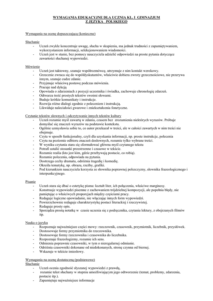 WYMAGANIA EDUKACYJNE DLA UCZNIA KL. I GIMNAZJUM Z JĘZYKA POLSKIEGO Wymagania na ocenę dopuszczającą (konieczne) Słuchanie - Uczeń zwykle koncentruje uwagę, słucha w skupieniu, ma jednak trudności z zapamiętywaniem, wykorzystaniem informacji, selekcjonowaniem wiadomości. - Uczeń jest w stanie, bez pomocy nauczyciela udzielić odpowiedzi na proste pytania dotyczące zawartości słuchanej wypowiedzi. Mówienie - Uczeń jest taktowny, szanuje współrozmówcę, utrzymuje z nim kontakt wzrokowy. - Grzecznie zwraca się do współdyskutantów, właściwie dobiera zwroty grzecznościowe, nie przerywa innym, szanuje cudze zdanie. - Przyjmuje właściwą postawę podczas mówienia. - Pracuje nad dykcją - Opowiada o zdarzeniach z pozycji uczestnika i świadka, zachowuje chronologię zdarzeń. - Odtwarza treść prostych tekstów swoimi słowami. - Buduje krótkie komunikaty i instrukcje. - Rozwija różne dialogi zgodnie z poleceniem i instrukcją. - Likwiduje naleciałości gwarowe i zniekształcenia fonetyczne. Czytanie tekstów słownych i odczytywanie innych tekstów kultury - Uczeń rozumie myśl zawartą w zdaniu, czasem bez zrozumienia niektórych wyrazów. Próbuje domyślać się znaczeń wyrazów na podstawie kontekstu. - Ogólnie uzmysławia sobie to, co autor przekazał w treści, ale w całości zawartych w nim treści nie obejmuje. - Czyta w sposób funkcjonalny, czyli dla uzyskania informacji, np. proste instrukcje, polecenia - Czyta na poziomie odbioru znaczeń dosłownych, rozumie tylko wybrane treści. - W wyniku czytania stara się sformułować główna myśl czytanego tekstu - Potrafi ustalić stosunki przestrzenne i czasowe w tekście. - Rozumie realia (kto jest kim, gdzie przebywają postacie, co robią). - Rozumie polecenia, odpowiada na pytania. - Dostrzega cechy dramatu, odróżnia tragedię i komedię. - Określa tematykę, np. obrazu, rzeźby, grafiki. - Pod kierunkiem nauczyciela korzysta ze słownika poprawnej polszczyzny, słownika frazeologicznego i interpunkcyjnego. Pisanie - Uczeń stara się dbać o estetykę pisma: kształt liter, ich połączenia, właściwe marginesy. Konstruuje wypowiedzi pisemne z zachowaniem trójdzielnej kompozycji, ale popełnia błędy, nie pamiętając o właściwych proporcjach między częściami pracy. Redaguje logiczne opowiadanie, nie włączając innych form wypowiedzi. Powierzchownie redaguje charakterystykę postaci literackiej i rzeczywistej. Redaguje prosty opis. Sporządza prostą notatkę w czasie uczenia się z podręcznika, czytania lektury, z obejrzanych filmów itp. Nauka o języku - Rozpoznaje najważniejsze części mowy: rzeczownik, czasownik, przymiotnik, liczebnik, przysłówek. - Dostosowuje formy przymiotnika do rzeczownika. - Dostosowuje formy rzeczownika i czasownika do liczebnika. - Rozpoznaje frazeologizmy, rozumie ich sens. - Odmienia poprawnie czasowniki, w tym o nieregularnej odmianie. - Odróżnia czasowniki dokonane od niedokonanych, stronę czynna od biernej. - Wskazuje w tekście imiesłowy. Wymagania na ocenę dostateczną (podstawowe) Słuchanie - Uczeń ocenia zgodność słyszanej wypowiedzi z prawdą, rozumie tekst słuchany w stopniu umożliwiającym jego odtworzenie (temat, problemy, zdarzenia, postacie itp.). - Zapamiętuje najważniejsze informacje 2 - Rozumie polecenia i instrukcje. - Próbuje porządkować i notować słyszane informacje, żąda ich, pyta o szczegóły informacji. - Wnioskuje na podstawie słuchanych komunikatów. - Stara się zrozumieć intencje nadawcy. - Jest pozytywnie nastawiony do mówiącego oraz tematu, co potwierdza aktywnym słuchaniem. - Odczytuje informacje zawarte w znakach niewerbalnych (mimika, mowa ciała). Mówienie - Uczeń buduje wypowiedzenia poprawne gramatycznie i składniowo. - Wypowiada się z właściwa intonacją. - Uzupełnia wypowiedź środkami pozawerbalnymi, reaguje mimiką, gestem adekwatnie do wypowiedzi nadawcy. - Eliminuje z własnych wypowiedzi sprawy już przez innych poruszone. - Poprawnie akcentuje wyrazy. - Mówi w sposób płynny i wyraźnie artykulacyjnie. - Poprawnie wymawia głoski i grupy głosek. - W kulturalny sposób wyraża sprzeciw i niezadowolenie. - Próbuje uzasadniać swoje zdanie. Czytanie tekstów słownych i odczytywanie innych tekstów kultury - Uczeń rozumie myśl zawartą w wypowiedzi, rozumie znaczenia wyrazów. - Potrafi uzmysłowić sobie to, co autor przekazuje, obejmuje w miarę treści wypowiedzi. - Przy pomocy nauczyciela przygotowuje interpretację głosową tekstu literackiego. - Czyta w miarę sprawnie, uzyskuje zamierzone informacje. - Czyta na poziomie dosłownym, rozumie treści. - Czytanie daje mu wyobrażenie o całym utworze. - Zdarza się zniekształcanie znaczeń i sensu wyrazów. - Rozumie główne informacje podane wprost. - Odróżnia główne informacje od opinii i ocen. - Próbuje wyszukiwać określony rodzaj informacji. - Rozumie stosunki przestrzenne i czasowe zachodzące między różnymi składnikami tekstu. - Rozumie realia w czytanym tekście - Umie korzystać z różnych części książki (wstępu, przedmowy, posłowia, indeksu, bibliografii). - Odróżnia tekst główny dramatu od pobocznego. - Rozpoznaje cechy, przypowieści, fraszki, hymnu. - W utworach lirycznych wskazuje środki stylistyczne: przenośnię, powtórzenie, apostrofę, pytanie retoryczne. - W innych tekstach kultury dostrzega podstawowe wyróżniki sztuki teatralnej i filmowej, malarstwa, rzeźby, muzyki, architektury, różnice między adaptacją a pierwowzorem literackim. - Korzysta z katalogu alfabetycznego i rzeczowego w celu wyszukania materiałów na dany temat. - Rozpoznaje językowe środki perswazji w reklamie. - Wyraża własne opinie na temat dzieł sztuki i próbuje formułować oceny. Pisanie - Dba o estetykę pisma, stosuje akapity. - Konstruuje wypowiedzi z zachowaniem właściwej kompozycji. - Redaguje opowiadanie, włączając nieudolnie inne formy wypowiedzi. - Redaguje charakterystyk