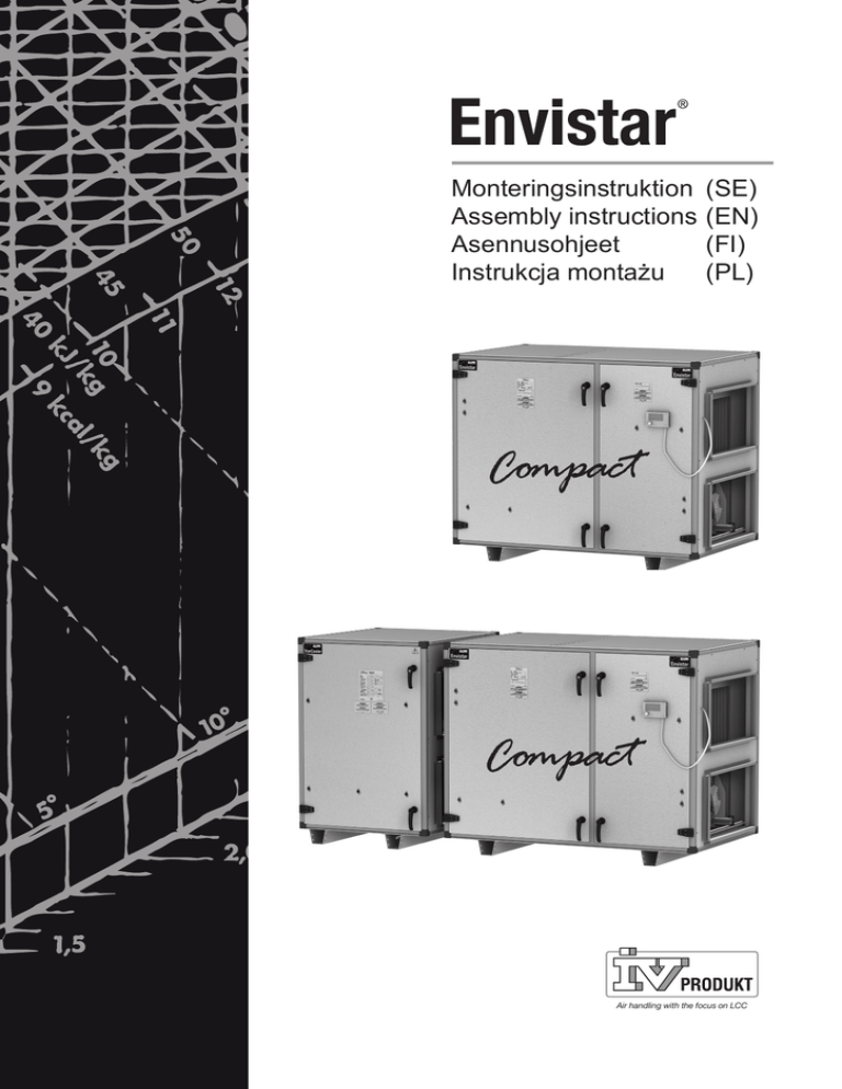 Monteringsinstruktion (SE) Assembly instructions (EN) Asennusohjeet (FI) Instrukcja montażu (PL) Air handling with the focus on LCC Varning! Produkterna får ej tagas i bruk förrän den maskin eller anläggning i vilken de ingår överensstämmer med kraven i EGs Maskindirektiv 2006/42/EG, EMC Direktiv 2004/108/EG samt Lågspänningsdirektiv 2006/95/EG. Warning! The products must not be put into operation until the machine or ventilation system in which they are a incorporated comply with the provisions of EC Machinery Directive 2006/42/EC, EMC Directive 2004/108/EC and Low voltage Directive 2006/95/EC. Varoitus! Konetta ei saa ottaa käyttöön ennen kuin se kone, johon se on tarkoitettu liitettäväksi tai jonka osaksi se on tarkoitettu, on saatettu ja vakuutettu direktiivin 2006/42/EG, EMC Directive 2004/108/EG ja Matala jännite direktiivin 2006/95/EG ja sen voimaansaattavien kansallisten määräysten mukaiseksi; ts. koskien koko konetta mukaan lukien myös tässä vakuutuksessa mainittu kone. Uwaga! Produkty nie mogą by używane, zanim maszyna albo urządzenie, w których skład wchodzą, nie odpowiadają wymaganiom norm UE. Dyrektywa maszynowa 2006/42/EG, Dyrektywa EMC 2004/108/EG, Dyrektywa niskich napięć 2006/95/EG. Envistar Compact MEC120228.05.SE.EN.FI.PL Air handling with the focus on LCC För en fullgod funktion och för att garanti skall gälla, måste monteringsinstruktionen följas. Innehållsförteckning Lyft av aggregat...........................................................................2 Stativkrav.....................................................................................4 Montering av funktionsdelar........................................................5 Aggregatkombinationer...............................................................7 Kanalanslutning...........................................................................8 Komponenter för kanalmontage..................................................9 Erforderlig serviceyta.................................................................10 Kylaggregat StarCooler.............................................................11 Kanaltillbehör, montering...........................................................12 Anslutning av batterier...............................................................13 Anslutning av rörledningar och vattenlås..................................14 Elanslutning av aggregat...........................................................15 These instructions must be observed to ensure good functionality and for the warranty to apply. Table of Contents To lift the unit...............................................................................2 Base framerequirements.............................................................4 Joining of the functional modules................................................5 Air handling unit combinations....................................................7 Connection to the ducting............................................................8 Components for duct assemble...................................................9 Open space required for service...............................................10 Cooling unit StarCooler.............................................................11 Duct accessories, assembly......................................................12 Connection of Coils...................................................................13 Anslutning av rörledningar och vattenlås..................................14 Electrical wiring of air handling unit...........................................15 Asennusohjeita tulee noudattaa laitteen luotettavan toiminnan takaamiseksi. Laitteen takuu ei ole voimassa mikäli asennusohjeita ei noudateta. Sisällysluettelo Koneen nostaminen....................................................................2 Palkkialustanasennus..................................................................4 Toiminto-osien.............................................................................5 Koneyhdistelmät..........................................................................7 Kanavaliitokset............................................................................8 Komponenttit kanavaasennukseen.............................................9 Vaadittavahuoltotila...................................................................10 Jäähdytysyksikkö StarCooler....................................................11 Kanavavarusteet, asennus........................................................12 Patterikytkennät.........................................................................13 Putkien ja vesilukon kytkentä....................................................14 Sähköliitännät............................................................................15 Aby zapewnić poprawne funkcjonowanie urządzenia oraz zachować prawo do gwarancji, należy stosować się do wskazówek zawartych w instrukcji montażu. Spis treści Podnoszeniecentrali....................................................................2 Zalecenia dotyczące statywu......................................................4 Montař sekcji funkcyjnych przy....................................................5 Główne elementy centrali............................................................7 Podłączenie kanałów...................................................................8 Komponenty do montażukanałowego.........................................9 Niezbędnaprzestrzeń obsługi....................................................10 Agregat chłodniczy StarCooler..................................................11 Montaż wyposażenia kanałowego.............................................12 Podłączenie baterii....................................................................13 Anslutning av rörledningar och vattenlås..................................14 Podłączenieelektrycznecentrali......
