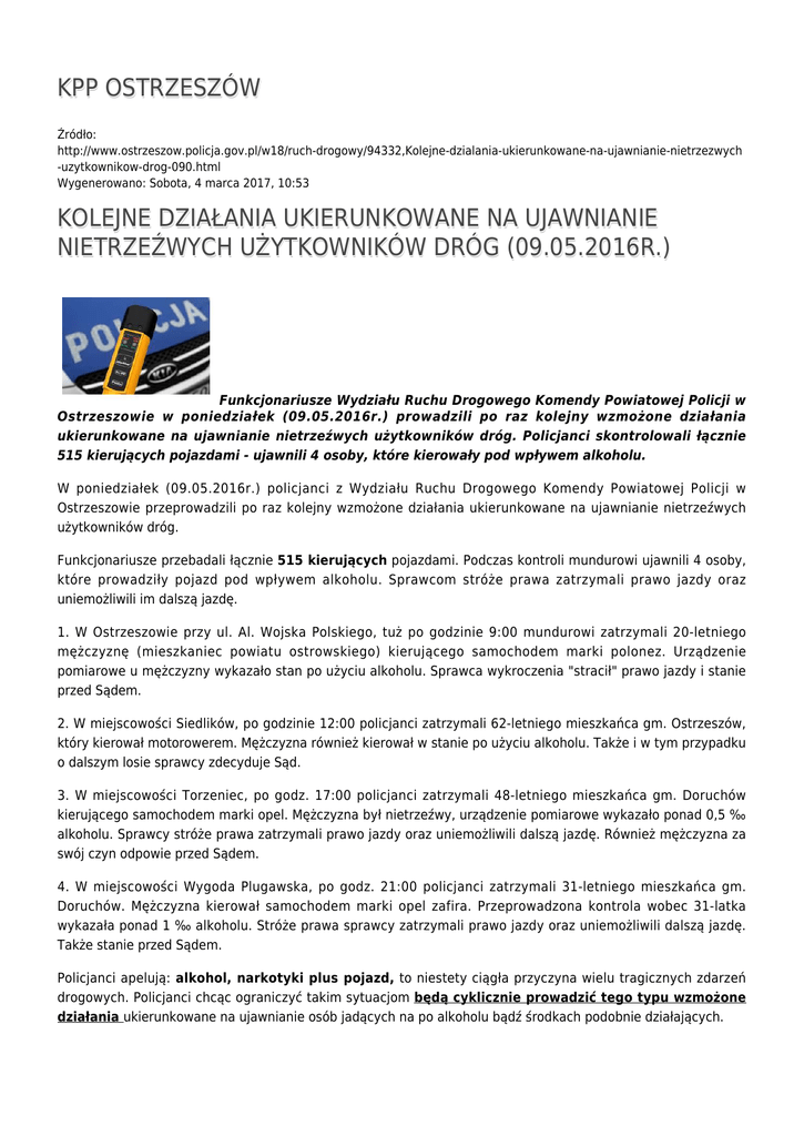 KPP OSTRZESZÓW Źródło: http://www.ostrzeszow.policja.gov.pl/w18/ruch-drogowy/94332,Kolejne-dzialania-ukierunkowane-na-ujawnianie-nietrzezwych -uzytkownikow-drog-090.html Wygenerowano: Sobota, 4 marca 2017, 10:53 KOLEJNE DZIAŁANIA UKIERUNKOWANE NA UJAWNIANIE NIETRZEŹWYCH UŻYTKOWNIKÓW DRÓG (09.05.2016R.) Funkcjonariusze Wydziału Ruchu Drogowego Komendy Powiatowej Policji w Ostrzeszowie w poniedziałek (09.05.2016r.) prowadzili po raz kolejny wzmożone działania ukierunkowane na ujawnianie nietrzeźwych użytkowników dróg. Policjanci skontrolowali łącznie 515 kierujących pojazdami - ujawnili 4 osoby, które kierowały pod wpływem alkoholu. W poniedziałek (09.05.2016r.) policjanci z Wydziału Ruchu Drogowego Komendy Powiatowej Policji w Ostrzeszowie przeprowadzili po raz kolejny wzmożone działania ukierunkowane na ujawnianie nietrzeźwych użytkowników dróg. Funkcjonariusze przebadali łącznie 515 kierujących pojazdami. Podczas kontroli mundurowi ujawnili 4 osoby, które prowadziły pojazd pod wpływem alkoholu. Sprawcom stróże prawa zatrzymali prawo jazdy oraz uniemożliwili im dalszą jazdę. 1. W Ostrzeszowie przy ul. Al. Wojska Polskiego, tuż po godzinie 9:00 mundurowi zatrzymali 20-letniego mężczyznę (mieszkaniec powiatu ostrowskiego) kierującego samochodem marki polonez. Urządzenie pomiarowe u mężczyzny wykazało stan po użyciu alkoholu. Sprawca wykroczenia "stracił" prawo jazdy i stanie przed Sądem. 2. W miejscowości Siedlików, po godzinie 12:00 policjanci zatrzymali 62-letniego mieszkańca gm. Ostrzeszów, który kierował motorowerem. Mężczyzna również kierował w stanie po użyciu alkoholu. Także i w tym przypadku o dalszym losie sprawcy zdecyduje Sąd. 3. W miejscowości Torzeniec, po godz. 17:00 policjanci zatrzymali 48-letniego mieszkańca gm. Doruchów kierującego samochodem marki opel. Mężczyzna był nietrzeźwy, urządzenie pomiarowe wykazało ponad 0,5 ‰ alkoholu. Sprawcy stróże prawa zatrzymali prawo jazdy oraz uniemożliwili dalszą jazdę. Również mężczyzna za swój czyn odpowie przed Sądem. 4. W miejscowości Wygoda Plugawska, po godz. 21:00 policjanci zatrzymali 31-letniego mieszkańca gm. Doruchów. Mężczyzna kierował samochodem marki opel zafira. Przeprowadzona kontrola wobec 31-latka wykazała ponad 1 ‰ alkoholu. Stróże prawa sprawcy zatrzymali prawo jazdy oraz uniemożliwili dalszą jazdę. Także stanie przed Sądem. Policjanci apelują: alkohol, narkotyki plus pojazd, to niestety ciągła przyczyna wielu tragicznych zdarzeń drogowych. Policjanci chcąc ograniczyć takim sytuacjom będą cyklicznie prowadzić tego typu wzmożone działania ukierunkowane na ujawnianie osób jadących na po alkoholu bądź środkach podobnie działających. Ocena: 0/5 (0) Tweetnij