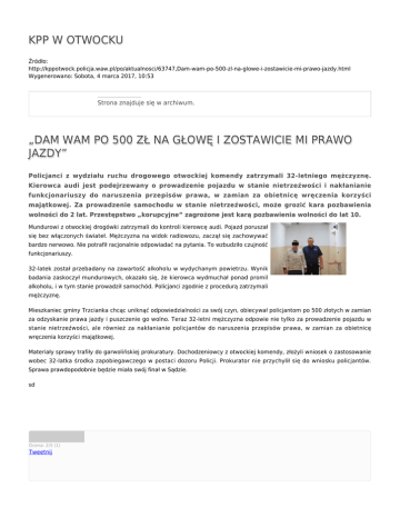 KPP W OTWOCKU Źródło: http://kppotwock.policja.waw.pl/po/aktualnosci/63747,Dam-wam-po-500-zl-na-glowe-i-zostawicie-mi-prawo-jazdy.html Wygenerowano: Sobota, 4 marca 2017, 10:53 Strona znajduje się w archiwum. „DAM WAM PO 500 ZŁ NA GŁOWĘ I ZOSTAWICIE MI PRAWO JAZDY” Policjanci z wydziału ruchu drogowego otwockiej komendy zatrzymali 32-letniego mężczyznę. Kierowca audi jest podejrzewany o prowadzenie pojazdu w stanie nietrzeźwości i nakłanianie funkcjonariuszy do naruszenia przepisów prawa, w zamian za obietnicę wręczenia korzyści majątkowej. Za prowadzenie samochodu w stanie nietrzeźwości, może grozić kara pozbawienia wolności do 2 lat. Przestępstwo „korupcyjne” zagrożone jest karą pozbawienia wolności do lat 10. Mundurowi z otwockiej drogówki zatrzymali do kontroli kierowcę audi. Pojazd poruszał się bez włączonych świateł. Mężczyzna na widok radiowozu, zaczął się zachowywać bardzo nerwowo. Nie potrafił racjonalnie odpowiadać na pytania. To wzbudziło czujność funkcjonariuszy. 32-latek został przebadany na zawartość alkoholu w wydychanym powietrzu. Wynik badania zaskoczył mundurowych, okazało się, że kierowca wydmuchał ponad promil alkoholu, i w tym stanie prowadził samochód. Policjanci zgodnie z procedurą zatrzymali mężczyznę. Mieszkaniec gminy Trzcianka chcąc uniknąć odpowiedzialności za swój czyn, obiecywał policjantom po 500 złotych w zamian za odzyskanie prawa jazdy i puszczenie go wolno. Teraz 32-letni mężczyzna odpowie nie tylko za prowadzenie pojazdu w stanie nietrzeźwości, ale również za nakłanianie policjantów do naruszenia przepisów prawa, w zamian za obietnicę wręczenia korzyści majątkowej. Materiały sprawy trafiły do garwolińskiej prokuratury. Dochodzeniowcy z otwockiej komendy, złożyli wniosek o zastosowanie wobec 32-latka środka zapobiegawczego w postaci dozoru Policji. Prokurator nie przychylił się do wniosku policjantów. Sprawa prawdopodobnie będzie miała swój finał w Sądzie. sd Ocena: 2/5 (1) Tweetnij