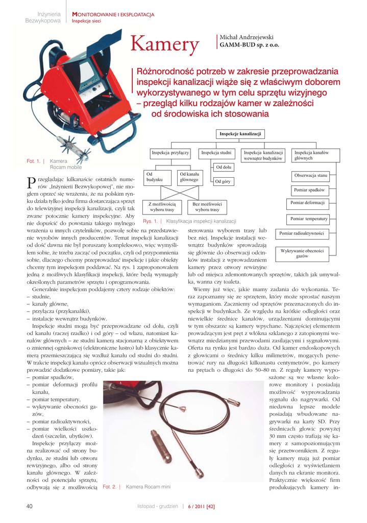 Inżynieria Bezwykopowa MONITOROWANIE I EKSPLOATACJA Inspekcje sieci Kamery Michał Andrzejewski GAMM-BUD sp. z o.o. Różnorodność potrzeb w zakresie przeprowadzania inspekcji kanalizacji wiąże się z właściwym doborem wykorzystywanego w tym celu sprzętu wizyjnego – przegląd kilku rodzajów kamer w zależności od środowiska ich stosowania Inspekcje kanalizacji Inspekcja przyáączy Fot. 1. | P Inspekcja studni Kamera Rocam mobile Inspekcja kanalizacji ZHZQąWU]EXG\QNyZ Inspekcja kanaáów gáównych Od doáu Od budynku Od kanaáu gáównego Obserwacja stanu rzeglądając kilkanaście ostatnich numeOd góry rów „Inżynierii Bezwykopowej”, nie moPomiar spadków głem oprzeć się wrażeniu, że na polskim rynku działa tylko jedna firma dostarczająca sprzęt Pomiar deformacji Z moĪliwoĞcią Bez moĪliwoĞci do telewizyjnej inspekcji kanalizacji, czyli tak wyboru trasy wyboru trasy zwane potocznie kamery inspekcyjne. Aby Pomiar temperatury nie dopuścić do powstania takiego mylnego Rys. 1. | Klasyfikacja inspekcji kanalizacji sterowania wyborem trasy lub wrażenia u innych czytelników, pozwolę sobie na przedstawiePomiar radioaktywnoĞci bez niej. Inspekcje instalacji wenie wyrobów innych producentów. Temat inspekcji kanalizacji wnątrz budynków sprowadzają od dość dawna nie był poruszany kompleksowo, więc wymyśliWykrywanie obecnoĞci się głównie do obserwacji odcinłem sobie, że trzeba zacząć od początku, czyli od przypomnienia gazów ków instalacji z wprowadzaniem sobie, dlaczego chcemy przeprowadzać inspekcje i jakie obiekty kamery przez otwory rewizyjne chcemy tym inspekcjom poddawać. Na rys. 1 zaproponowałem lub od miejsca zdemontowanych sprzętów, takich jak umywaljedną z możliwych klasyfikacji inspekcji, które będą wymagały ka, wanna czy toaleta. określonych parametrów sprzętu i oprogramowania. Wiemy już więc, jakie mamy zadania do wykonania. TeGeneralnie inspekcjom poddajemy cztery rodzaje obiektów: raz zapoznamy się ze sprzętem, który może sprostać naszym – studnie, wymaganiom. Zaczniemy od sprzętów przeznaczonych do in– kanały główne, spekcji w budynkach. Ze względu na krótkie odległości oraz – przyłącza (przykanaliki), niewielkie średnice kanałów, urządzeniami dominującymi – instalacje wewnątrz budynków. w tym obszarze są kamery wpychane. Najczęściej elementem Inspekcje studni mogą być przeprowadzane od dołu, czyli prowadzącym jest pręt z włókna szklanego z zatopionymi weod kanału (raczej rzadko) i od góry – od włazu, natomiast kawnątrz miedzianymi przewodami zasilającymi i sygnałowymi. nałów głównych – ze studni kamerą stacjonarną z obiektywem Oferta na rynku jest bardzo duża. Od kamer endoskopowych o zmiennej ogniskowej (elektroniczne lustro) lub klasycznie kaz głowicami o średnicy kilku milimetrów, mogących penemerą przemieszczającą się wzdłuż kanału od studni do studni. trować rury na długości kilkunastu centymetrów, po kamery W trakcie inspekcji kanału oprócz obserwacji wizualnych można na prętach o długości do 50–80 m. Z reguły kamery wypoprowadzić dodatkowe pomiary, takie jak: sażone są we własne kolo– pomiar spadków, rowe monitory i posiadają – pomiar deformacji profilu możliwość wyprowadzania kanału, sygnału do nagrywarki. Od – pomiar temperatury, niedawna lepsze modele – wykrywanie obecności gaposiadają wbudowane nazów, grywarki na karty SD. Przy – pomiar radioaktywności, średnicach głowic powyżej – pomiar wielkości uszko30 mm często trafiają się kadzeń (szczelin, ubytków). mery z samopoziomującym Inspekcje przyłączy możsię przetwornikiem. Z reguna realizować od strony buły kamery mają już pomiar dynku, ze studni lub otworu odległości z wyświetlaniem rewizyjnego, albo od strony danych na ekranie monitora. kanału głównego. W zależPraktycznie większość firm ności od potencjału sprzętu, produkujących kamery inodbywają się z możliwością Fot. 2. | Kamera Rocam mini 40 listopad - grudzień 6 / 2011 [42] MONITOROWANIE I EKSPLOATACJA Inspekcje sieci Fot. 3. | Rocam głowica z sondą i lokalizator Fot. 5. | SanScope 3.5 Inżynieria Bezwykopowa mogą pokonać do pięciu kolanek 90 w rurze DN40. Wyposażone są w oświetlenie na diodach LED, wystarczające do średnicy DN100. Posiadają obiektywy szerokokątne 87° i zdolność regulacji intensywności oświetlenia i ostrości oraz wyjście sygnału wizyjnego na nagrywarkę przez BNC. Kamera zasilana jest z sieci. W jej wyposażeniu znajduje się również stelaż ze stali nierdzewnej, bęben malowany proszkowo, a monitor mocowany jest do stelaża na przegubie kulistym; – SanScope 3.5 to zestaw z włóknem szklanym 3,5 mm o długości 20 m, zamkniętym w poręcznej kasecie z tworzywa sztucznego. Ma kolorową głowicę o średnicy 32 mm, a za oświetlenie odpowiadają diody LED. W urządzeniu tym możliwa jest regulacja oświetlenia i ostrości obrazu. Głowica jest szczelna do ciśnienia 5 bar. Stosowane jest tu zasilanie sieciowe. W tym zestawie nie ma monitora, a wyjście sygnału wizyjnego realizowane jest przez BNC. Waga całości to jedynie 2,5 kg. – SanScope 6.0 to bardzo poręczna kamera z prętem z włókna szklanego o długości 50 m i średnicy 6 mm. Wyposażona jest w kolorową głowicę w obudowie ze stali nierdzewnej i jest szczelna do ciśnienia 5 bar. Posiada przetwornik o rozdzielczości 380 linii. Istnieje możliwość regulacji intensywności oświetlenia diodami LED oraz regulacja ostrości obrazu. Kolorowy monitor ciekłokrystaliczny z osłoną mocowany jest do stelaża na przegubie kulistym. Urządzenie zasilane jest z sieci. W wyposażeniu znajduje się stelaż kamery ze stali nierdzewnej. Wyjście sygnału do nagrywarki odbywa się za pomocą złącza BNC. – SanScope mini standalone – zestaw endoskopowy z głowicą ze stali nierdzewnej wyposażony w przetwornik czarno-biały (średnica 15 mm) lub kolor