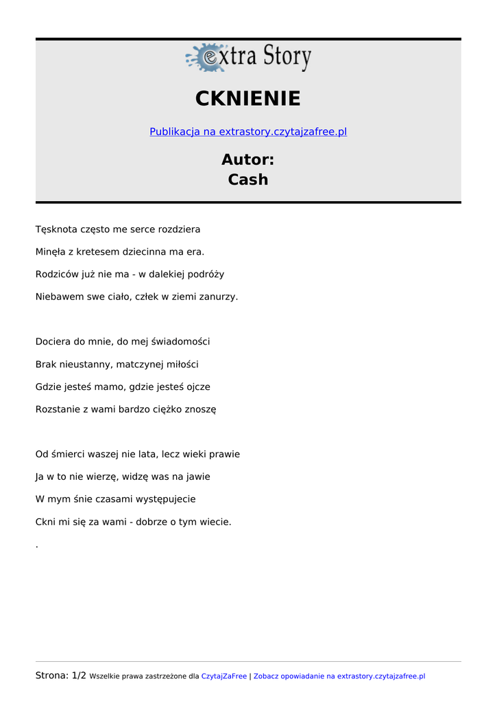 CKNIENIE Publikacja na extrastory.czytajzafree.pl Autor: Cash Tęsknota często me serce rozdziera Minęła z kretesem dziecinna ma era. Rodziców już nie ma - w dalekiej podróży Niebawem swe ciało, człek w ziemi zanurzy. Dociera do mnie, do mej świadomości Brak nieustanny, matczynej miłości Gdzie jesteś mamo, gdzie jesteś ojcze Rozstanie z wami bardzo ciężko znoszę Od śmierci waszej nie lata, lecz wieki prawie Ja w to nie wierzę, widzę was na jawie W mym śnie czasami występujecie Ckni mi się za wami - dobrze o tym wiecie. . Strona: 1/2 Wszelkie prawa zastrzeżone dla CzytajZaFree | Zobacz opowiadanie na extrastory.czytajzafree.pl od Strona: 2/2 Wszelkie prawa zastrzeżone dla CzytajZaFree | Zobacz opowiadanie na extrastory.czytajzafree.pl