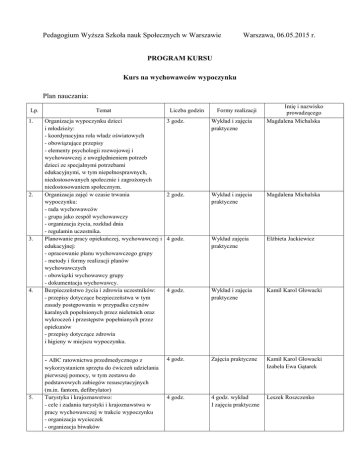 Pedagogium Wyższa Szkoła nauk Społecznych w Warszawie Warszawa, 06.05.2015 r. PROGRAM KURSU Kurs na wychowawców wypoczynku Plan nauczania: Lp. 1. 2. 3. 4. 5. Temat Liczba godzin Formy realizacji Imię i nazwisko prowadzącego Magdalena Michalska Organizacja wypoczynku dzieci i młodzieży: - koordynacyjna rola władz oświatowych - obowiązujące przepisy - elementy psychologii rozwojowej i wychowawczej z uwzględnieniem potrzeb dzieci ze specjalnymi potrzebami edukacyjnymi, w tym niepełnosprawnych, niedostosowanych społecznie i zagrożonych niedostosowaniem społecznym. Organizacja zajęć w czasie trwania wypoczynku: - rada wychowawców - grupa jako zespół wychowawczy - organizacja życia, rozkład dnia - regulamin uczestnika. Planowanie pracy opiekuńczej, wychowawczej i edukacyjnej: - opracowanie planu wychowawczego grupy - metody i formy realizacji planów wychowawczych - obowiązki wychowawcy grupy - dokumentacja wychowawcy. Bezpieczeństwo życia i zdrowia uczestników: - przepisy dotyczące bezpieczeństwa w tym zasady postępowania w przypadku czynów karalnych popełnionych przez nieletnich oraz wykroczeń i przestępstw popełnianych przez opiekunów - przepisy dotyczące zdrowia i higieny w miejscu wypoczynku. 3 godz. Wykład i zajęcia praktyczne 2 godz. Wykład i zajęcia praktyczne Magdalena Michalska 4 godz. Wykład zajęcia praktyczne Elżbieta Jackiewicz 4 godz. Wykład i zajęcia praktyczne Kamil Karol Głowacki - ABC ratownictwa przedmedycznego z 4 godz. Zajęcia praktyczne wykorzystaniem sprzętu do ćwiczeń udzielania pierwszej pomocy, w tym zestawu do podstawowych zabiegów resuscytacyjnych (m.in. fantom, defibrylator) Turystyka i krajoznawstwo: - cele i zadania turystyki i krajoznawstwa w pracy wychowawczej w trakcie wypoczynku - organizacja wycieczek - organizacja biwaków Kamil Karol Głowacki Izabela Ewa Gątarek 4 godz. 4 godz. wykład I zajęcia praktyczne Leszek Roszczenko 6. 7. 8. 9. - gry terenowe itp. Ruch i rekreacja: - cele i zadania wychowania fizycznego - metody nauki technik pływania - gry i zabawy ruchowe - zajęcia z gier zespołowych - sport, olimpiady sportowe lekkoatletyka - organizacja zajęć dla dzieci ze specjalnymi potrzebami edukacyjnymi, w tym niepełnosprawnych, niedostosowanych społecznie i zagrożonych niedostosowaniem społecznym. Prace społecznie użyteczne: Cele i zadania prac społecznie użytecznych: - wychowawcze znaczenie prac społecznie użytecznych , wolontariat - prace w zakresie samoobsługi - prace na rzecz miejsca wypoczynku - prace na rzecz środowiska Zajęcia praktyczno – techniczne: Cele i zadania zajęć praktyczno-technicznych: - formy i rodzaje zajęć praktyczno-technicznych - prace dekoracyjne i zdobnicze - indywidualne zainteresowania uczestników - rozwój zainteresowań uczestników Zajęcia kulturalno oświatowe: Cele i zadania kulturalno-oświatowych: - organizacja zajęć kulturalno-oświatowych - - elementy kulturalne zajęć w programie dnia - prowadzenie kroniki - organizacja uroczystości, imprez, wieczornic, ognisk - gry i zabawy świetlicowe - konkursy, wystawy, dyskusje - śpiew, muzyka, zabawy ze śpiewem RAZEM w tym: 1 godz. 1 godz. wykład Leszek Roszczenko 5 godz. 5 godz. zajęcia praktyczne Leszek Roszczenko 2 godz. Wykład i zajęcia praktyczne Leszek Roszczenko 2 godz. Wykład i zajęcia praktyczne Leszek Roszczenko 5 godz. Wykład i zajęcia praktyczne Magdalena Michalska 36 godz. 26 godz. 1 godz. 9 godz. Wykład i zajęcia praktyczne Wykład Zajęcia praktyczne Wykaz literatury oraz niezbędnych środków i materiałów dydaktycznych: 1) T. Zagajewski, Poradnik. Bezpieczny wypoczynek dzieci i młodzieży, Wydawnictwo ATH Polska, Łódź 2004 2) Ministerstwo Edukacji Narodowej Poradnik bezpiecznego wypoczynku A 3) Jędryka G. "Poradnik wychowawcy kolonijnego" Płock 2000 4) Chmielewski Jacek : Chodzi o dobrą zabawę na koloniach // Edukacja i Dialog. – 2004, nr 6, s. 2-6 5) Akoliński S., Organizujemy kolonie letnie. Warszawa 1983r. 6) Bakuła Anna, Bakuła Piotr : Integracyjne wakacje // Świat Problemów. – 1999, nr 10, s. 44-46 7) Gołaszewski Jerzy, Paterka Stanisław, Wieczorek Andrzej : Organizacja wycieczek szkolnych, obozów stałych i wędrownych. Rekreacyjne gry ruchowe. – Poznań : Akademia Wychowania Fizycznego, 2000 Warunki ukończenia kursu: Frekwencja na zajęciach. Pozytywny wynik egzaminu końcowego. ............................................................................ (podpis organizatora/osoby reprezentującej organizatora)