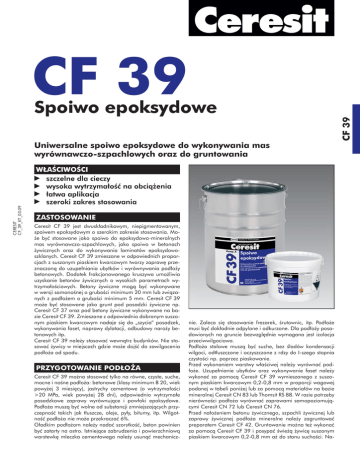 CF 39 CERESIT CF_39_KT_03.09 Uniwersalne spoiwo epoksydowe do wykonywania mas wyrównawczo-szpachlowych oraz do gruntowania WŁAŚCIWOŚCI szczelne dla cieczy wysoka wytrzymałość na obciążenia łatwa aplikacja szeroki zakres stosowania ZASTOSOWANIE Ceresit CF 39 jest dwuskładnikowym, niepigmentowanym, spoiwem epoksydowym o szerokim zakresie stosowania. Może być stosowane jako spoiwo do epoksydowo-mineralnych mas wyrównawczo-szpachlowych, jako spoiwo w betonach żywicznych oraz do wykonywania laminatów epoksydowoszklanych. Ceresit CF 39 zmieszane w odpowiednich proporcjach z suszonym piaskiem kwarcowym tworzy zaprawę przeznaczoną do uzupełniania ubytków i wyrównywania podłoży betonowych. Dodatek frakcjonowanego kruszywa umożliwia uzyskanie betonów żywicznych o wysokich parametrach wytrzymałościowych. Betony żywiczne mogą być wykonywane w wersji samonośnej o grubości minimum 20 mm lub związanych z podłożem o grubości minimum 5 mm. Ceresit CF 39 może być stosowane jako grunt pod posadzki żywiczne np. Ceresit CF 37 oraz pod betony żywiczne wykonywane na bazie Ceresit CF 39. Zmieszane z odpowiednio dobranym suszonym piaskiem kwarcowym nadaje się do „szycia” posadzek, wykonywania faset, naprawy dylatacji, odbudowy naroży betonowych itp. Ceresit CF 39 należy stosować wewnątrz budynków. Nie stosować żywicy w miejscach gdzie może dojść do zawilgocenia podłoża od spodu. PRZYGOTOWANIE PODŁOŻA Ceresit CF 39 można stosować tylko na równe, czyste, suche, mocne i nośne podłoża: betonowe (klasy minimum B 20, wiek powyżej 3 miesięcy), jastrychy cementowe (o wytrzymałości >20 MPa, wiek powyżej 28 dni), odpowiednio wytrzymałe posadzkowe zaprawy wyrównujące i powłoki epoksydowe. Podłoża muszą być wolne od substancji zmniejszających przyczepność takich jak tłuszcze, oleje, pyły, bitumy, itp. Wilgotność podłoża nie może przekraczać 6%. Gładkim podłożom należy nadać szorstkość, beton powinien być zatarty na ostro. Istniejące zabrudzenia i powierzchniową warstewkę mleczka cementowego należy usunąć mechanicz- nie. Zaleca się stosowanie frezarek, śrutownic, itp. Podłoże musi być dokładnie odpylone i odkurzone. Dla podłoży posadowionych na gruncie bezwzględnie wymagana jest izolacja przeciwwilgociowa. Podłoża stalowe muszą być suche, bez śladów kondensacji wilgoci, odtłuszczone i oczyszczone z rdzy do I-szego stopnia czystości np. poprzez piaskowanie. Przed wykonaniem warstwy właściwej należy wyrównać podłoże. Uzupełnianie ubytków oraz wykonywanie faset należy wykonać za pomocą Ceresit CF 39 wymieszanego z suszonym piaskiem kwarcowym 0,2-0,8 mm w proporcji wagowej podanej w tabeli poniżej lub za pomocą materiałów na bazie mineralnej Ceresit CN 83 lub Thomsit RS 88. W razie potrzeby nierówności podłoża wyrównać zaprawami samopoziomującymi Ceresit CN 72 lub Ceresit CN 76. Przed nałożeniem betonu żywicznego, szpachli żywicznej lub zaprawy żywicznej podłoża mineralne należy zagruntować preparatem Ceresit CF 42. Gruntowanie można też wykonać za pomocą Ceresit CF 39 i posypać świeżą żywicę suszonym piaskiem kwarcowym 0,2-0,8 mm aż do stanu suchości. Na- CF 39 Spoiwo epoksydowe WYKONANIE Ceresit CF 39 dostarczana jest w dwóch opakowaniach zawierających oddzielnie składnik A i B. Składnik A (żywica) należy uprzednio wymieszać w naczyniu dostawczym w celu ujednorodnienia masy. Następnie odmierzoną porcję składnika A należy przelać do naczynia roboczego i dodać odpowiednią ilość składnika B (utwardzacz) wg podanej proporcji. Obydwa składniki wymieszać przy użyciu wiertarki z mieszadłem (300-600 obr/min.), aż do uzyskania jednorodnej kolorystyczne mieszaniny. Podczas mieszania należy zgarniać mieszadłem masę ze ścianek i dna naczynia. Czas mieszania wynosi około 3 minuty. Przy częściowym wykorzystaniu opakowania, na 20 części wagowe składnika B przypada 100 części wagowych składnika A. 1. Wykonanie zaprawy szpachlowej Warstwa szpachlowa umożliwia uzyskanie bardzo równego podłoża. Po wymieszaniu składników A i B (jak wyżej) należy dodać do żywicy Ceresit CF 39 odmierzony porcjami suszony piasek kwarcowy o uziarnieniu 0,1-0,3 mm i całość dokładnie wymieszać przy użyciu wiertarki z mieszadłem (300-600 obr/min). Żywicę należy wymieszać z piaskiem kwarcowym w proporcji wagowej od 1:1 do 1:2. Tak przygotowany wyrób należy niezwłocznie rozłożyć kilkoma porcjami na wyznaczonym fragmencie przygotowanego podłoża, a następnie rozprowadzić go równomiernie za pomocą stalowej pacy lub stalowej rakli z ząbkami. Po rozprowadzeniu masy należy odczekać 10-15 min. i przewałkować ją wałkiem z kolcami w celu odpowietrzenia i wyrównania powierzchni. 2. Wykonanie jastrychów żywicznych Po wymieszaniu składników A i B (jak wyżej) należy dodać do żywicy Ceresit CF 39 odmierzony porcjami suszony piasek kwarcowy i całość dokładnie wymieszać przy użyciu wiertarki z mieszadłem (300-600 obr/min). W celu uzyskania optymalnego stosu okruchowego należy zastosować piasek kwarcowy frakcji 0,2-0,8 mm i 1-1,6 mm zmieszane ze sobą w proporcji wagowej 1:1. Przy wykonywaniu jastrychów samonośnych żywicę należy wymieszać z piaskiem kwarcowym w proporcji wagowej od 1:8 do 1:10. W przypadku wykonywania jastrychów związanych z podłożem, w zależności od żądanej konsystencji, żywicę należy wymieszać z piaskiem kwarcowym w proporcji wagowej od 1:6 do 1:10. Przygotowany wyrób należy niezwłocznie rozłożyć na wyznaczonym fragmencie przygotowanego podłoża, a następnie rozprowadzić go równomiernie za pomocą stalowej pacy lub łaty, zagęścić i wygładzić. Rozprowadzanie jastrychu na określona grubość ułatwiają zamontowane wcześniej prowadnice. 3. Wykonanie laminatu epoksydowo-szklanego Po wymieszaniu składników A i B (jak wyżej) żywicę Ceresit CF 39 należy nanieść na laminowaną p