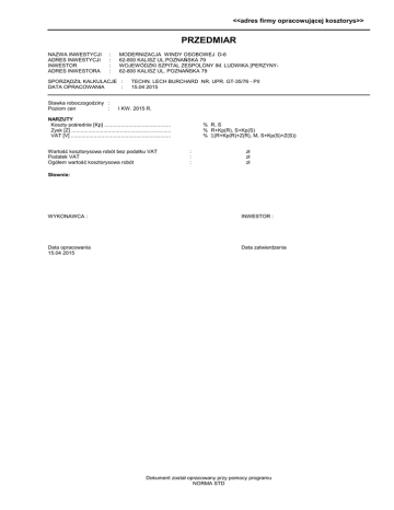 <<adres firmy opracowującej kosztorys>> PRZEDMIAR NAZWA INWESTYCJI ADRES INWESTYCJI INWESTOR ADRES INWESTORA : : : : MODERNIZACJA WINDY OSOBOWEJ D-6 62-800 KALISZ UL.POZNAŃSKA 79 WOJEWÓDZKI SZPITAL ZESPOLONY IM. LUDWIKA [PERZYNY62-800 KALISZ UL. POZNAŃSKA 79 SPORZĄDZIŁ KALKULACJE : DATA OPRACOWANIA : Stawka roboczogodziny : Poziom cen : TECHN. LECH BURCHARD NR. UPR. GT-35/76 - PII 15.04 2015 I KW. 2015 R. NARZUTY Koszty pośrednie [Kp] ............................................ Zysk [Z] .................................................................. VAT [V] .................................................................. Wartość kosztorysowa robót bez podatku VAT Podatek VAT Ogółem wartość kosztorysowa robót % R, S % R+Kp(R), S+Kp(S) % Σ(R+Kp(R)+Z(R), M, S+Kp(S)+Z(S)) : : : zł zł zł Słownie: WYKONAWCA : INWESTOR : Data opracowania 15.04 2015 Data zatwierdzenia Dokument został opracowany przy pomocy programu NORMA STD OGÓLNA CHARAKTERYSTYKA OBIEKTU OPIS I ZAŁOZENIA KOSZTORYSOWE 1. OBIEKT : WOJEWÓDZKI SZPITAL ZESPOLONY 2. ADRES; UL. POZNAŃSKA 79 , 62-800 KALISZ 3. INWESTOR ; WOJEWÓDZKI SZPITAL ZESPOLONY 4. ADRES INWESTORA: UL. POZNAŃSKA 79 , 62-800 KALISZ 5. DANE OGÓLNE; PROJEKTOWANA MODERNIZACJA DŻWIGU SZPITALNEGO D-6 6. PODSTAWOWE DANE TECHNICZNE WYMIANA PODZESPOŁÓW DŻWIGU ELEKTRYCZNEGO Z NAPEDEM 1:1 PRĘDKOSCIĄ 1 M/S , WYKORZYSTANIEM MASZYNOWNI GÓRNEJ, PROWADNIC, RAMY KABINOWEJ, I PRZECIWWAGI ORAZ WYMIANĘ STEROWANIA MIKROPROCESOWEGO Z FALOWNIKIEM 15kW , TASMY SZCZELINOWEJ I WYSWIETLACZY NA PRZYSTANKACH 7. KOSZTORYS OPRACOWANO NA PODSTAWIE 0BMIARÓW SPORZADZONYCH WG. PROJEKTU BUDOWLANEGO SPORZĄDZONEGO LECHA BURCHARD I INFORMACJI UZYSKANYCH OD INWESTORA 8. NORMY JEDNOSTKOWE ROBOCIZNY MATERIAŁÓW I SPRZĘTU PRZYJETO W OPARCIU O KNR, KNNR , KALKULACJE INDYWIDUALNE 9. STAWKI JEDNOSTKOWE ORAZ NARZUTY PRZYJĘTO W OPARCIU O SREDNIE CENY RYNKOWE NA TERENIE POWIATU KALISKIEGO ORAZ ROZPORZADZENIA MB I PMB. POZIOM CEN I KW. 2015 R OPRACOWAŁ: -2- Norma STD Wersja 4.27 Licencja: 9068 dla Lech Burchard ModernwindySzpital D-6kor przed Lp. Nazwa 1 ROBOTY SPECJALISTYCZNE I MONTAŻOWE 2 ROBOTY BUDOWLANE I WYKOŃCZENIOWE RAZEM netto VAT Razem brutto TABELA ELEMENTÓW SCALONYCH Robocizna Materiały Słownie: -3- Norma STD Wersja 4.27 Licencja: 9068 dla Lech Burchard Sprzęt Kp Z RAZEM ModernwindySzpital D-6kor przed przedmiar robót Lp. Podstawa Opis i wyliczenia 1 ROBOTY SPECJALISTYCZNE I MONTAŻOWE 1 kalkulacja in- Demontaż i utylizacja dźwigu szitalnego d.1 dywidualna 1 j.m. kpl kpl 3 Kalkulacja in- Montaż dźwigu szpitalnego i uruchomienie d.1 dywidualna 1 kpl. kpl kpl. 4 kalkulacja in- Modernizacja windy osobowej D-6 polegajaca na wymianie podzespołów kpl d.1 dywidualna dżwigu elektrycznego z napędem 1:1 na prędkosć 1 m/s , z wykorzystaniem maszynowni górnej,prowadnic, ramy kabinowej i przeciwwagi oraz wymianą sterowania mikroprocesowego z falownikiem 15 kw, tasmą szczelinową i wyswietlaczy na przystankach takich jak na dźwigu D=-12 z pozostawieniem prowadnic ramy kabinowej i przeciwwagi 1 kpl 2 5 KNR 4-01 d.2 1202-09 z.sz. 2.2 9912-02 szyb windowy ROBOTY BUDOWLANE I WYKOŃCZENIOWE Zeskrobanie i zmycie starej farby w pomieszczeniach o powierzchni podłogi ponad 5 m2 - praca na wysokości 10-20 m m2 (3.1+2.3)*2*37.80-1.1*2.10*12+3.1*2.3*2 m2 6 KNR 4-01 d.2 1204-02 z.sz. 2.2 9912-02 Dwukrotne malowanie farbami emulsyjnymi starych tynków wewnętrznych ścian - praca na wysokości 10-20 m m2 394.78 m2 1.000 RAZEM 1.000 1.000 RAZEM 1.000 1.000 RAZEM 1.000 1.000 RAZEM 1.000 394.780 RAZEM 394.780 394.780 RAZEM 394.780 14.260 RAZEM 14.260 0.300 RAZEM 0.300 0.500 RAZEM 0.500 7.130 RAZEM 7.130 31.800 RAZEM 31.800 31.800 RAZEM 31.800 0.630 RAZEM 0.630 0.650 RAZEM 0.650 5.740 RAZEM 5.740 Dwukrotne malowanie farbami emulsyjnymi starych tynków wewnętrznych sufi- m2 tów - praca na wysokości 10-20 m 3.1*2.3*2 m2 8 KNR-W 4-01 Ręczna rozbiórka elementów konstrukcji betonowych niezbrojonych o grubości m3 d.2 0212-03 ponad 15 cm podszybie 0.50*1.0*0.60 m3 9 KNR-W 4-01 Uzupełnienie posadzki cementowej o powierzchni 1.0-5.0 m2 w jednym miejs- m2 d.2 0803-02 cu z zatarciem na gładko 0.50*1.0 m2 10 KNR 7-12 d.2 0204-01 podszybie Razem kpl 2 kalkulacja in- Modernizacja windy osobowej - uzgodnienie z UDT wraz z dokumentacją d.1 dywidualna 1 7 KNR 4-01 d.2 1204-01 z.sz. 2.2 9912-02 Poszcz Malowanie pędzlem farbami do gruntowania chlorokauczukowymi - analogia posadzki 3.1*2.30 m2 m2 11 KNR 2-02 Okładziny z płyt gips.-karton.(suche tynki gips.) pojedyńcze na słupach,beld.2 2006-05 kach i ościeżach na zaprawie oscieża drzwi 1.1*0.5*12+2.10*0.5*2*12 m2 12 NNRNKB (z.VI) Okładziny ościeży z płytek marmuropodobnych na zaprawie klejowej o d.2 202 2804-03 grub.warstwy 5 mm - analogia 31.8 m2 13 KNR-W 4-01 Uzupełnienie zbrojonych belek, z betonu monolitycznego - roboty na 11 kond.2 0203-07 dygnacji pod wiazary dźwigu z.o.2.7. 9901 1.8*0.25*0.7*2 m3 14 KNR-W 4-01 Przygotowanie masy betonowej - beton żwirowy kl. B-20 d.2 0214-04 0.65 m3 15 KNR-W 4-01 Deskowanie konstrukcji betonowej lub żelbetowej belek i podciągów d.2 0201-05 2.05*0.7*2*2 m2 Norma STD Wersja 4.27 Licencja: 9068 dla Lech Burchard m2 m2 m3 m3 m2 ModernwindySzpital D-6kor przed przedmiar robót Lp. Podstawa Opis i wyliczenia 16 KNR-W 2-02 Przygotowanie i montaż zbrojenia elementów budynków i budowli - pręty żed.2 0259-02 browane 0.63*54/1000 17 KNR 0-14 d.2 2012-01 18 KNR 0-14 d.2 2012-03 j.m. t Okładziny stropów płytami gipsowo - kartonowymi na ruszcie pojedynczym, m2 podwieszanym, metalowym z kształtowników CD i UD - rozbiórka stropu z k-g otwór montażowy IV piętro zastosowano wspólczynnik do Ri S =0,5 1.0*1.5 m2 Okładziny stropów płytami gipsowo - kartonowymi na ruszcie podwójnym, pod- m2 wieszanym, metalowym z kształtowników CD i UD 1.0*1.5 m2 19 KNR-W 4-01 Dwukrotne malowanie farbami emulsyjnymi starych tynków wewnętrznych sufi- m2 d.2 1204-01 tów 2.30*2.5 m2 2