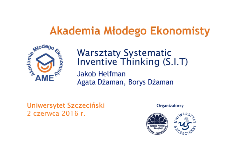 Warsztaty Systematic Inventive Thinking (S.I.T) Jakob Helfman Agata Dżaman, Borys Dżaman Uniwersytet Szczeciński 2 czerwca 2016 r. Przydatne informacje na temat funkcjonowania mózgu Jak przekształcić wadę w atut Antena – studium przypadku rozwiązań wynalazczych, oryginalne i rzadkie alternatywy Przykłady, które podkreślają umiejętności kreatywnego myślenia HIT or HEAT S.I.T. – pytania dotyczące twórczego myślenia dzieci Mózg zapamiętuje obrazy, sceny, grafiki Jeden obraz jest wart 10000 słów Mózg preferuje funkcjonowanie w utartych schematach. Szuka analogii do sytuacji które zna. Wszelkie luki w informacjach wypełnia na podstawie wcześniejszych doświadczeń. Potrzebuje czasu, aby zmienić swoje „nawyki” i wejść w tryb myślenia kreatywnego Jest zorientowany na obiekt, nie jest w stanie „przyswajać” informacji dotyczących obiektu i całego otoczenia i okoliczności towarzyszących, w tym samym momencie Mózg potrzebuje czasu, zwłaszcza w procesie myślenia kreatywnego Działanie schematyczne nie wymaga zaangażowania Stolarz przecina deskę na 4 części w ciągu 12 minut. Ile czasu zajmie mu przecięcie deski na 5 części? 3 identyczne traktory obsiewają 3 kilometry kwadratowe pola w ciągu 3 godzin. Ile czasu zajmie 1 traktorowi obsianie 1 kilometra kwadratowego tego pola? 6 krów zjada całą trawę z określonej łąki w ciągu 3 tygodni. 3 krowy zjadają trawę z tej samej łąki w ciągu 7 tygodni. Ile czasu zajmie to 1 krowie? Jak wadę zmienić w atut ? Problem z pewną anteną