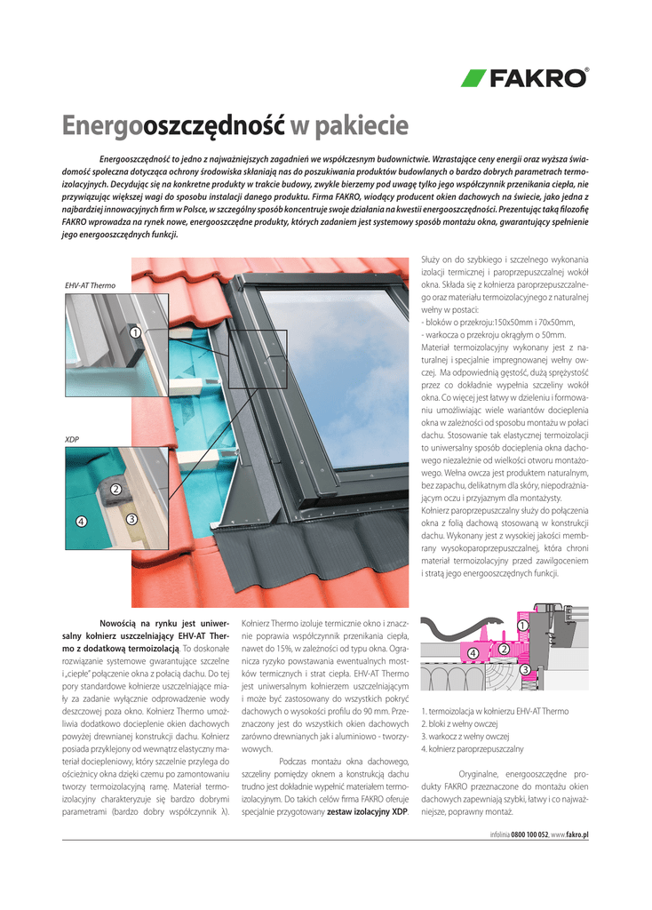 Energooszczędność w pakiecie Energooszczędność to jedno z najważniejszych zagadnień we współczesnym budownictwie. Wzrastające ceny energii oraz wyższa świadomość społeczna dotycząca ochrony środowiska skłaniają nas do poszukiwania produktów budowlanych o bardzo dobrych parametrach termoizolacyjnych. Decydując się na konkretne produkty w trakcie budowy, zwykle bierzemy pod uwagę tylko jego współczynnik przenikania ciepła, nie przywiązując większej wagi do sposobu instalacji danego produktu. Firma FAKRO, wiodący producent okien dachowych na świecie, jako jedna z najbardziej innowacyjnych firm w Polsce, w szczególny sposób koncentruje swoje działania na kwestii energooszczędności. Prezentując taką filozofię FAKRO wprowadza na rynek nowe, energooszczędne produkty, których zadaniem jest systemowy sposób montażu okna, gwarantujący spełnienie jego energooszczędnych funkcji. Służy on do szybkiego i szczelnego wykonania izolacji termicznej i paroprzepuszczalnej wokół okna. Składa się z kołnierza paroprzepuszczalnego oraz materiału termoizolacyjnego z naturalnej wełny w postaci: - bloków o przekroju:150x50mm i 70x50mm, - warkocza o przekroju okrągłym o 50mm. Materiał termoizolacyjny wykonany jest z naturalnej i specjalnie impregnowanej wełny owczej. Ma odpowiednią gęstość, dużą sprężystość przez co dokładnie wypełnia szczeliny wokół okna. Co więcej jest łatwy w dzieleniu i formowaniu umożliwiając wiele wariantów docieplenia okna w zależności od sposobu montażu w połaci dachu. Stosowanie tak elastycznej termoizolacji to uniwersalny sposób docieplenia okna dachowego niezależnie od wielkości otworu montażowego. Wełna owcza jest produktem naturalnym, bez zapachu, delikatnym dla skóry, niepodrażniającym oczu i przyjaznym dla montażysty. Kołnierz paroprzepuszczalny służy do połączenia okna z folią dachową stosowaną w konstrukcji dachu. Wykonany jest z wysokiej jakości membrany wysokoparoprzepuszczalnej, która chroni materiał termoizolacyjny przed zawilgoceniem i stratą jego energooszczędnych funkcji. EHV-AT Thermo 1 XDP 2 4 3 Nowością na rynku jest uniwersalny kołnierz uszczelniający EHV-AT Thermo z dodatkową termoizolacją. To doskonałe rozwiązanie systemowe gwarantujące szczelne i „ciepłe” połączenie okna z połacią dachu. Do tej pory standardowe kołnierze uszczelniające miały za zadanie wyłącznie odprowadzenie wody deszczowej poza okno. Kołnierz Thermo umożliwia dodatkowo docieplenie okien dachowych powyżej drewnianej konstrukcji dachu. Kołnierz posiada przyklejony od wewnątrz elastyczny materiał dociepleniowy, który szczelnie przylega do ościeżnicy okna dzięki czemu po zamontowaniu tworzy termoizolacyjną ramę. Materiał termoizolacyjny charakteryzuje się bardzo dobrymi parametrami (bardzo dobry współczynnik λ). Kołnierz Thermo izoluje termicznie okno i znacznie poprawia współczynnik przenikania ciepła, nawet do 15%, w zależności od typu okna. Ogranicza ryzyko powstawania ewentualnych mostków termicznych i strat ciepła. EHV-AT Thermo jest uniwersalnym kołnierzem uszczelniającym i może być zastosowany do wszystkich pokryć dachowych o wysokości profilu do 90 mm. Przeznaczony jest do wszystkich okien dachowych zarówno drewnianych jak i aluminiowo - tworzywowych. Podczas montażu okna dachowego, szczeliny pomiędzy oknem a konstrukcją dachu trudno jest dokładnie wypełnić materiałem termoizolacyjnym. Do takich celów firma FAKRO oferuje specjalnie przygotowany zestaw izolacyjny XDP. 1 4 2 3 1. termoizolacja w kołnierzu EHV-AT Thermo 2. bloki z wełny owczej 3. warkocz z wełny owczej 4. kołnierz paroprzepuszczalny Oryginalne, energooszczędne produkty FAKRO przeznaczone do montażu okien dachowych zapewniają szybki, łatwy i co najważniejsze, poprawny montaż. infolinia 0800 100 052, www.fakro.pl